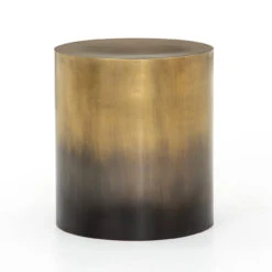 An antique brass finish highlights iron’s gradual blending of hues, delivering a distinctive ombre effect to the cylindrical end table. Great solo or in pairs.