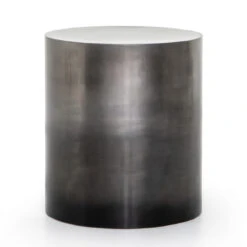 An antique brass finish highlights iron’s gradual blending of hues, delivering a distinctive ombre effect to the rounded end table.