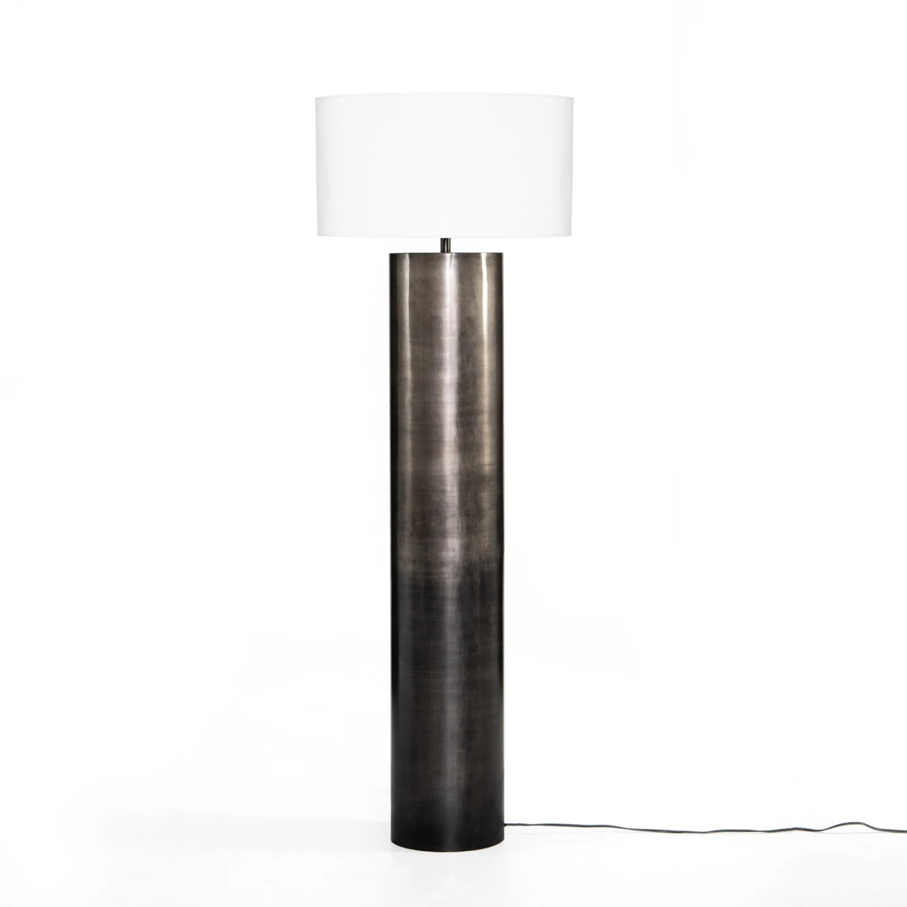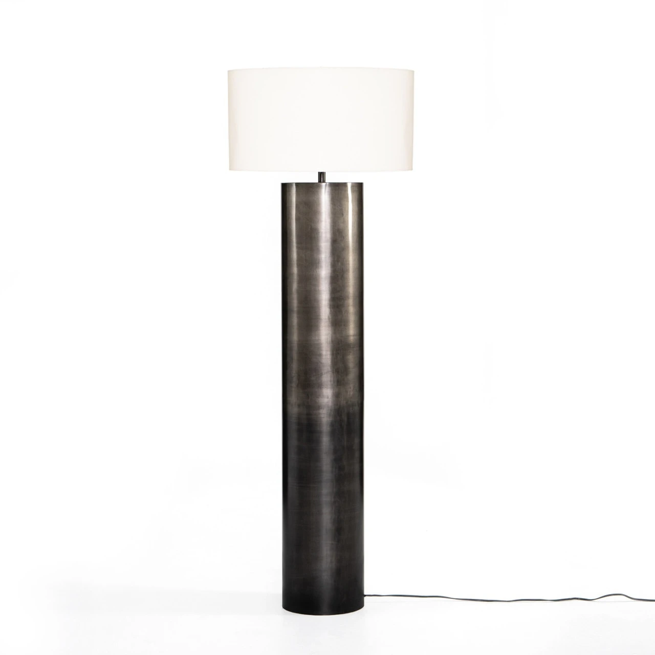 An antique pewter finish highlights iron’s gradual blending of hues, delivering a distinctive ombre effect to the cylindrical floor lamp. A white silk shade plays up this fresh mixing of materials.
