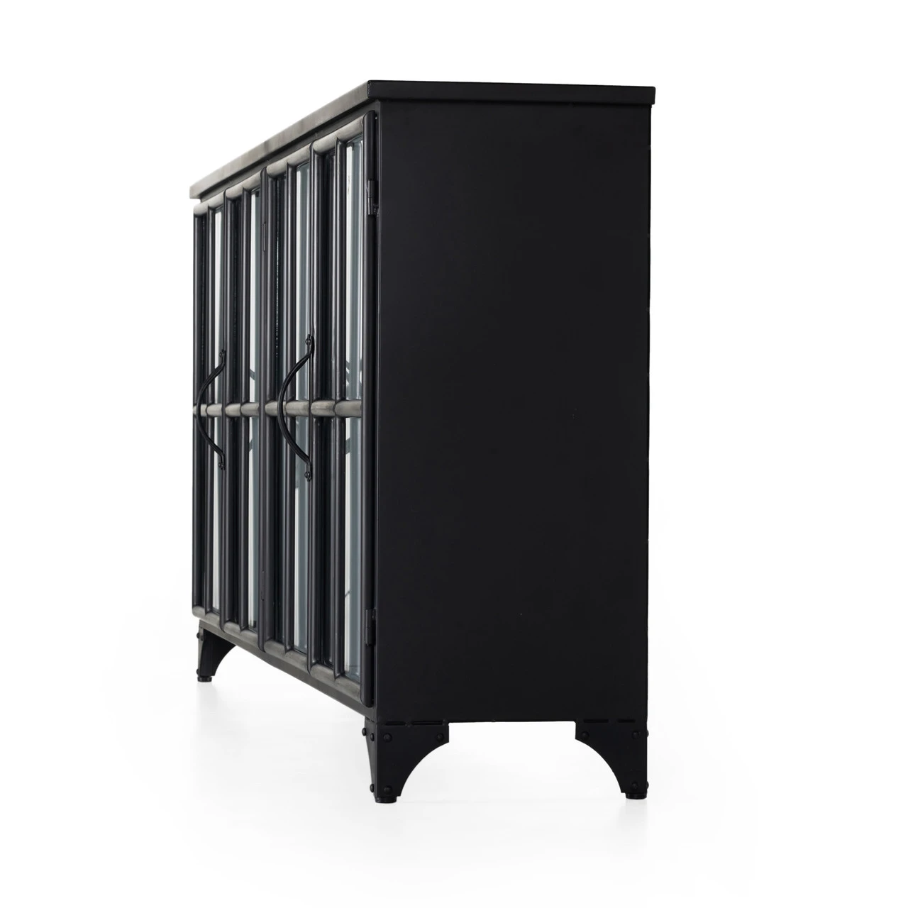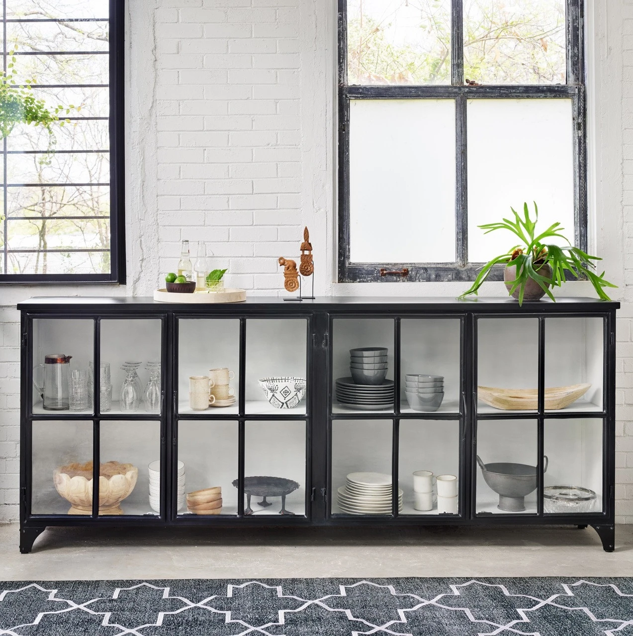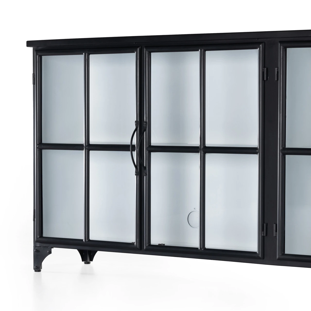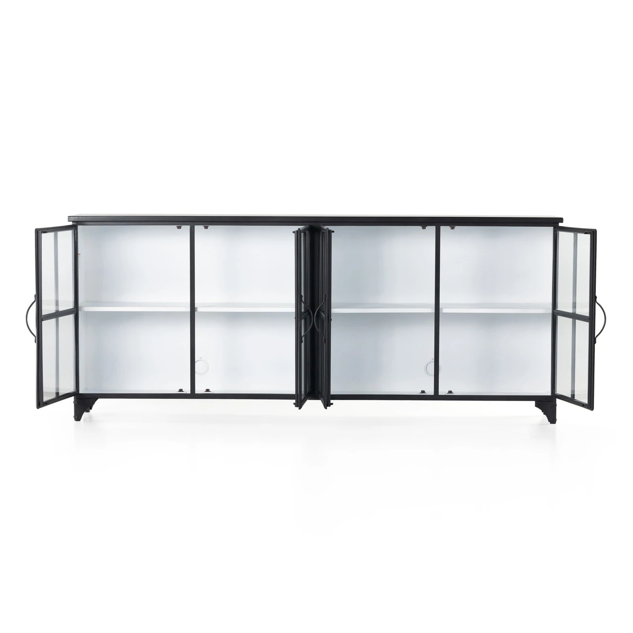 A black iron frame with windowpane detail contrasts a stark white interior for an updated take on the traditional media console. Open-front glass doors and ample shelving maximize media storage options. Camila Industrial Black Iron Media Sideboard is as versatile as it is handsome. Place it anywhere in the house and stow your stuff behind its unique façade.