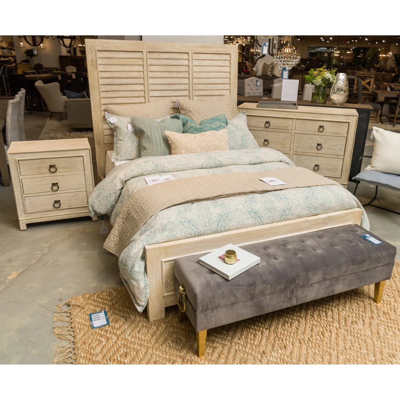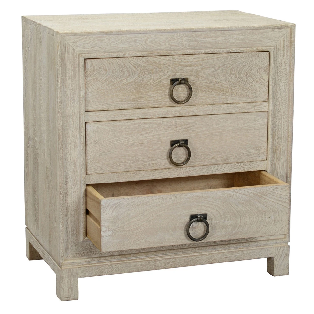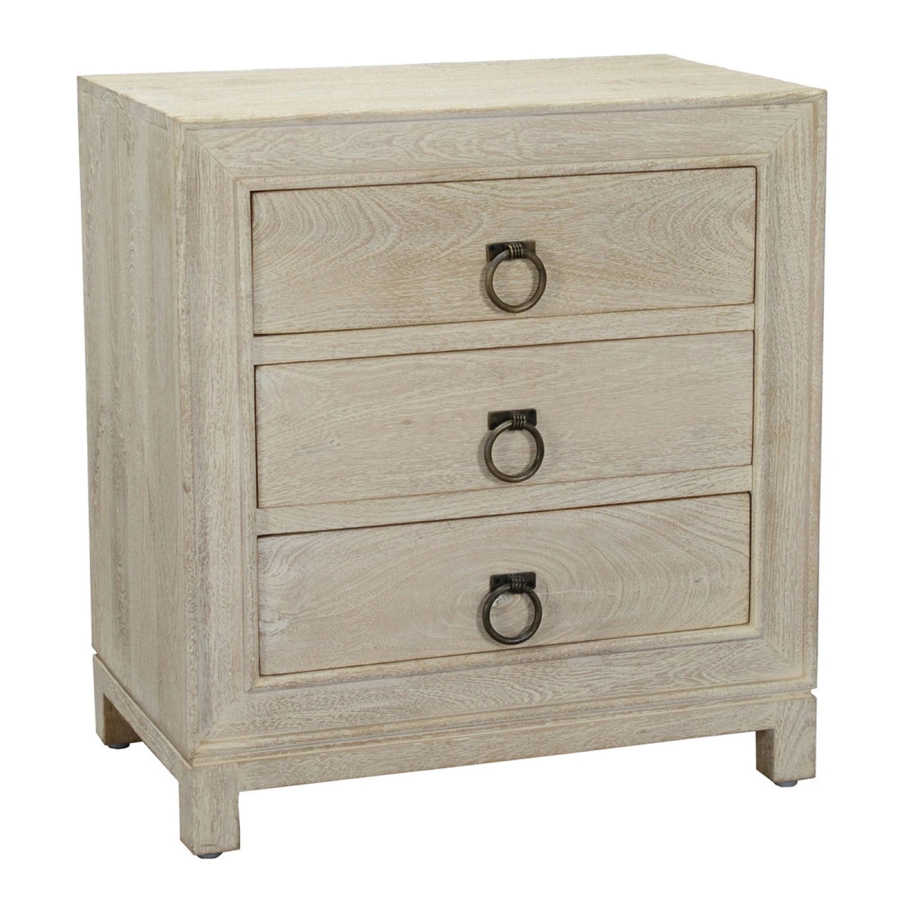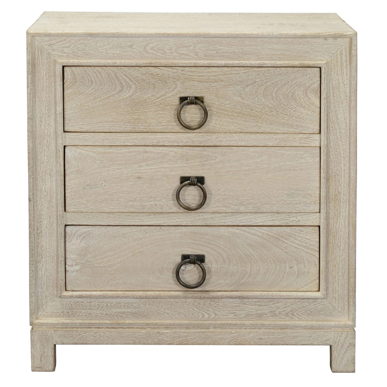 Lightly finished mango wood and classic styling give this nightstand an airy, timeless feel that brightens any room. Brass pulls add a warm, metallic gleam against the whitewash finish. Three drawers conceal clutter with convenient storage space.