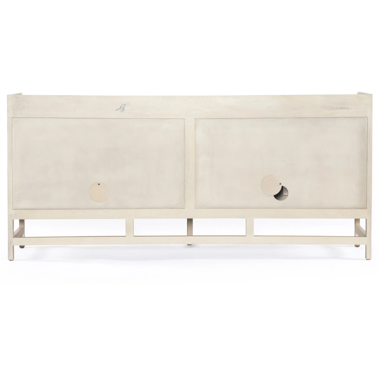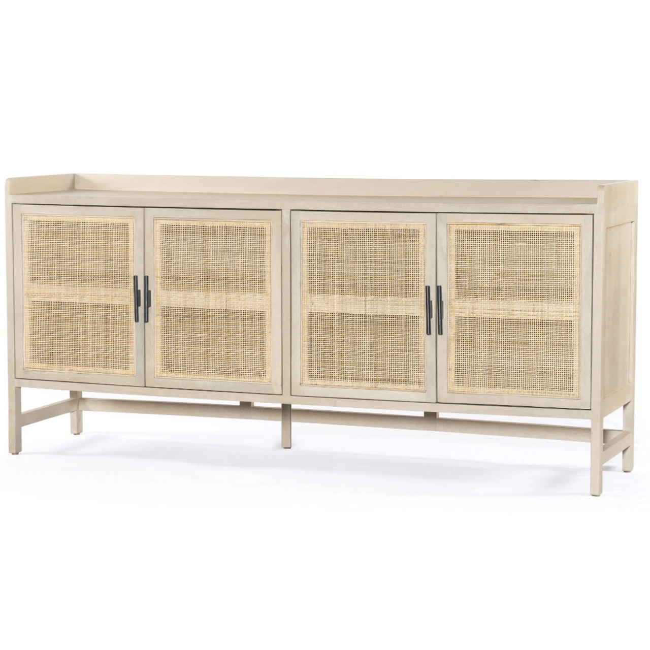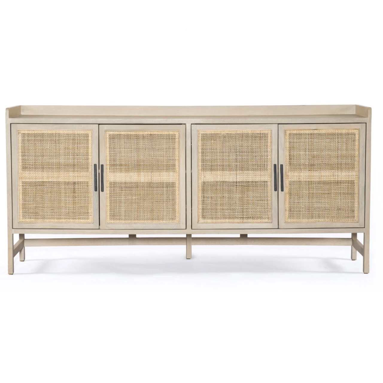 Mid-century-inspired coastal style cabinet with an organic two-tone contrast and a textural twist. Monochromatic with a textural twist. Natural mango frames woven cane fronts, with black iron hardware for subtle contrast. Inside, spacious shelving awaits storage of dinnerware and more. Caprice Woven Cane 4 Door Sideboard brings a relaxed coastal beach look to any dining room or living room