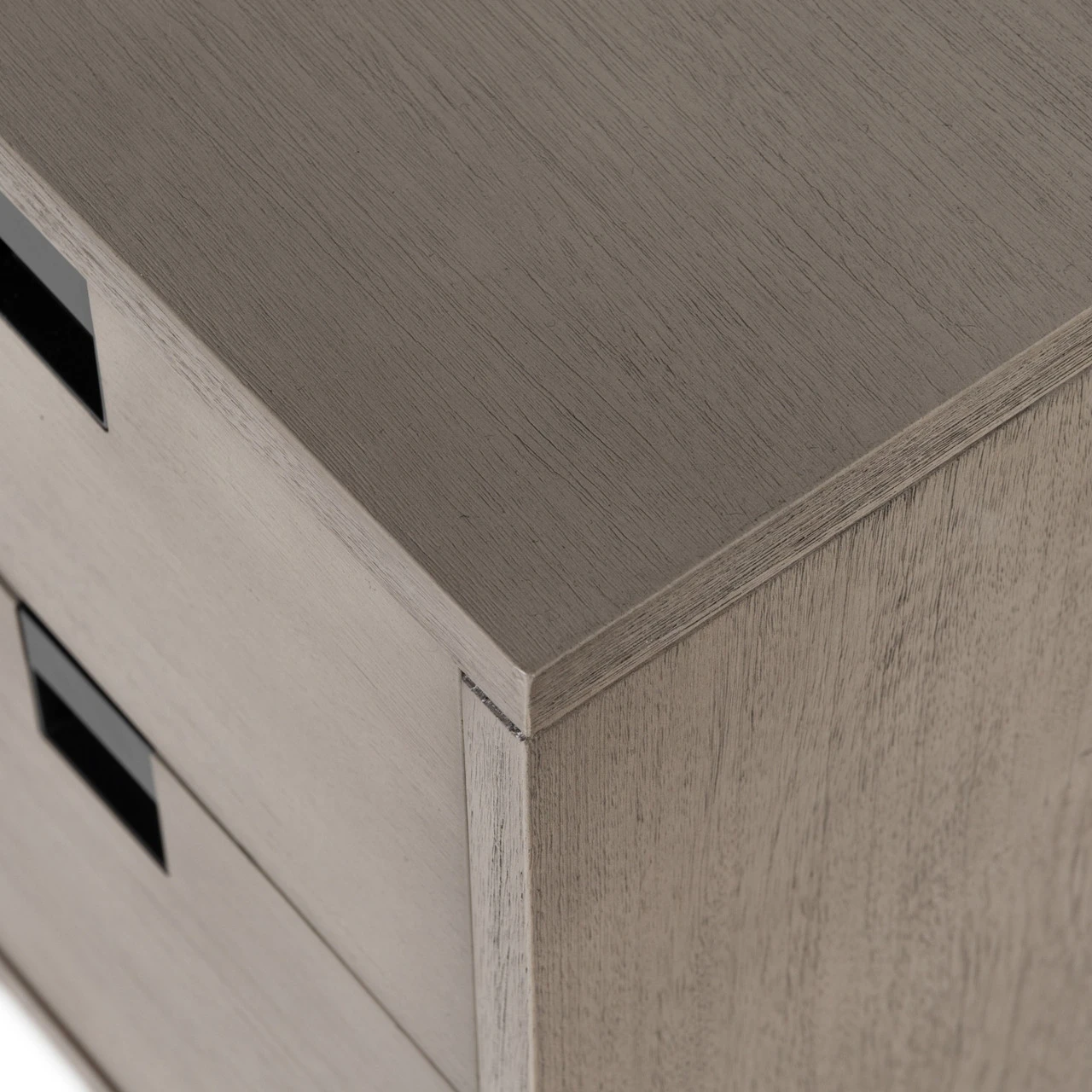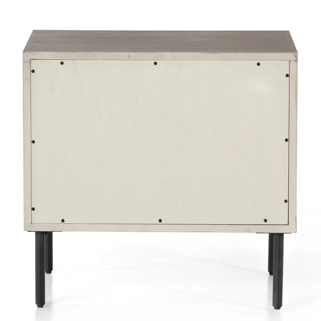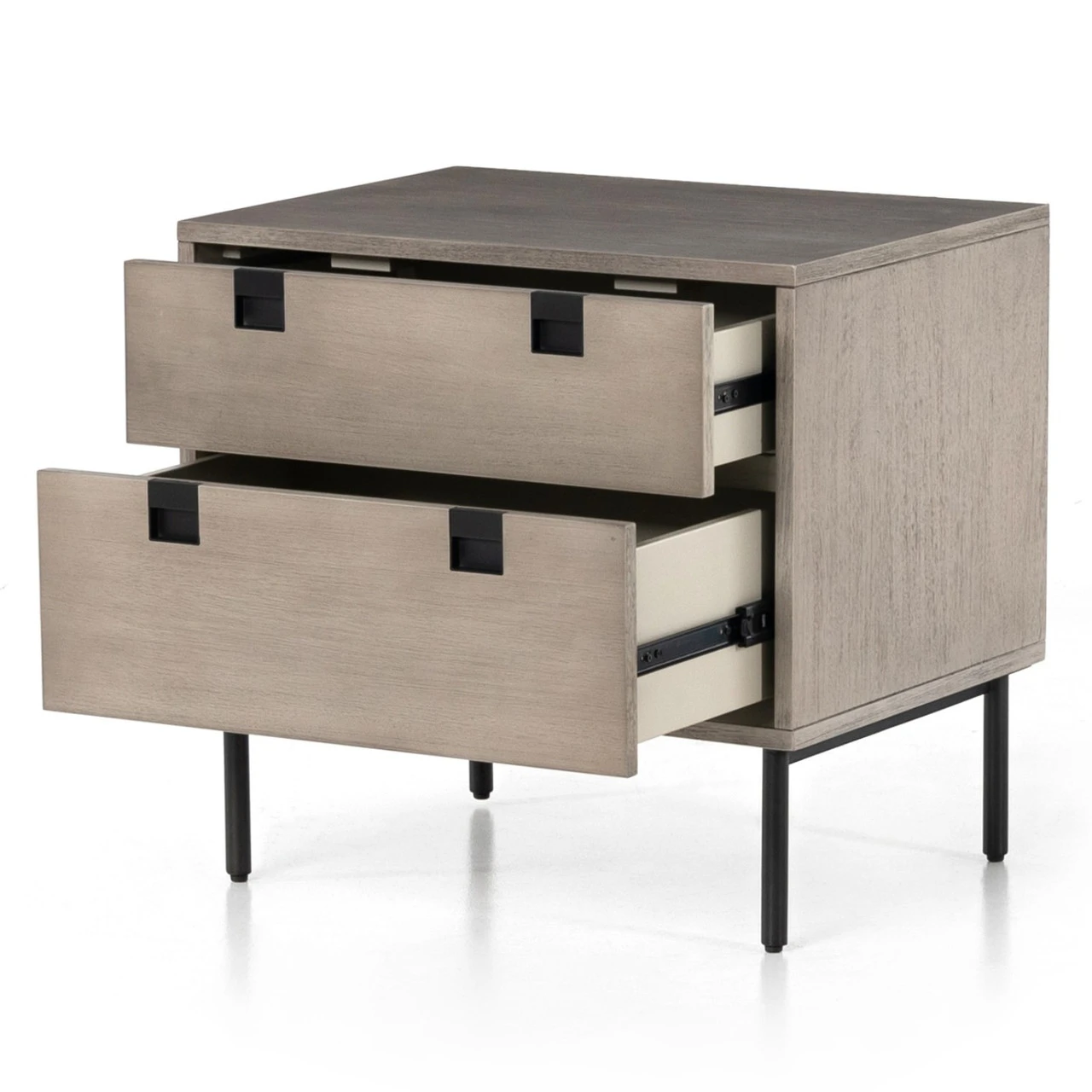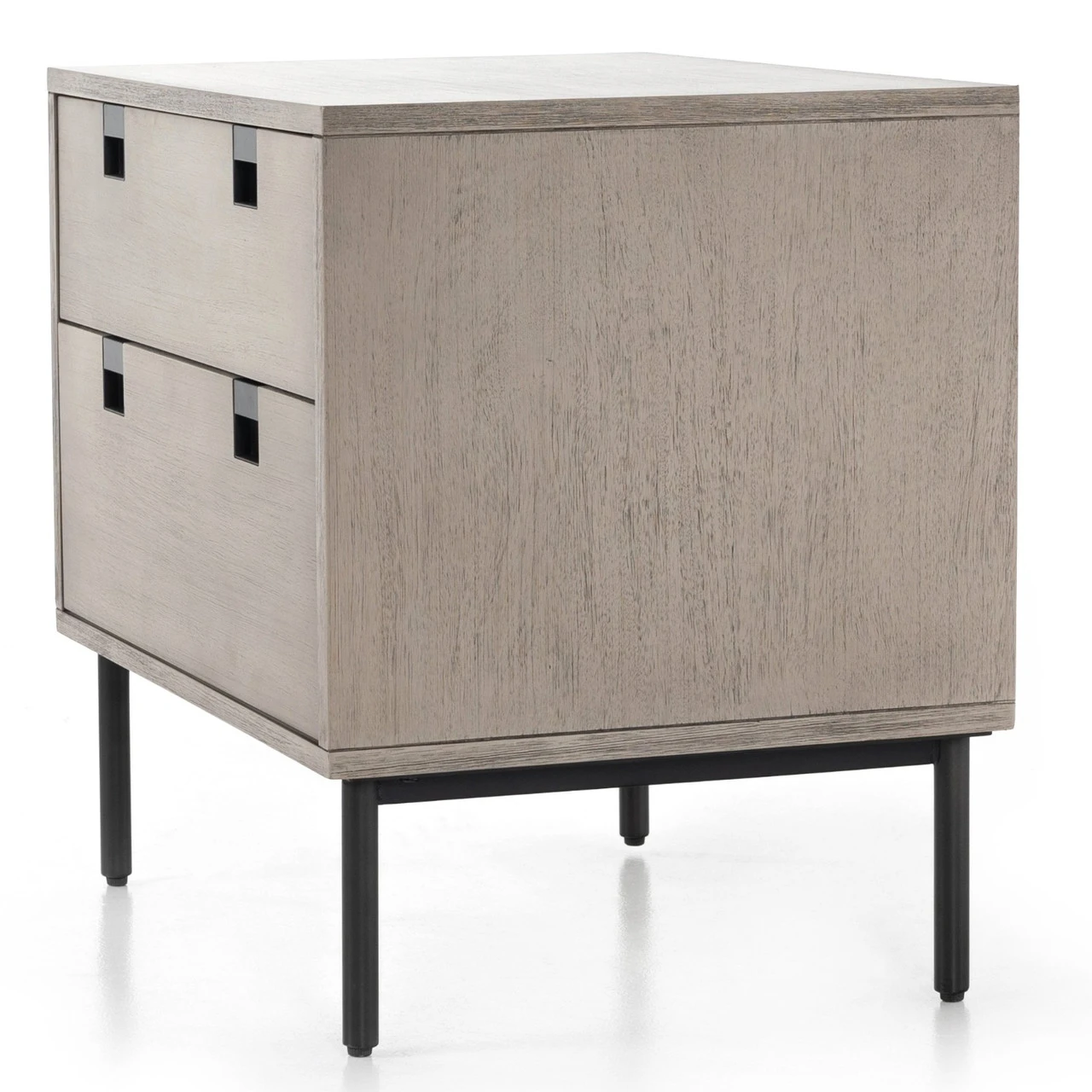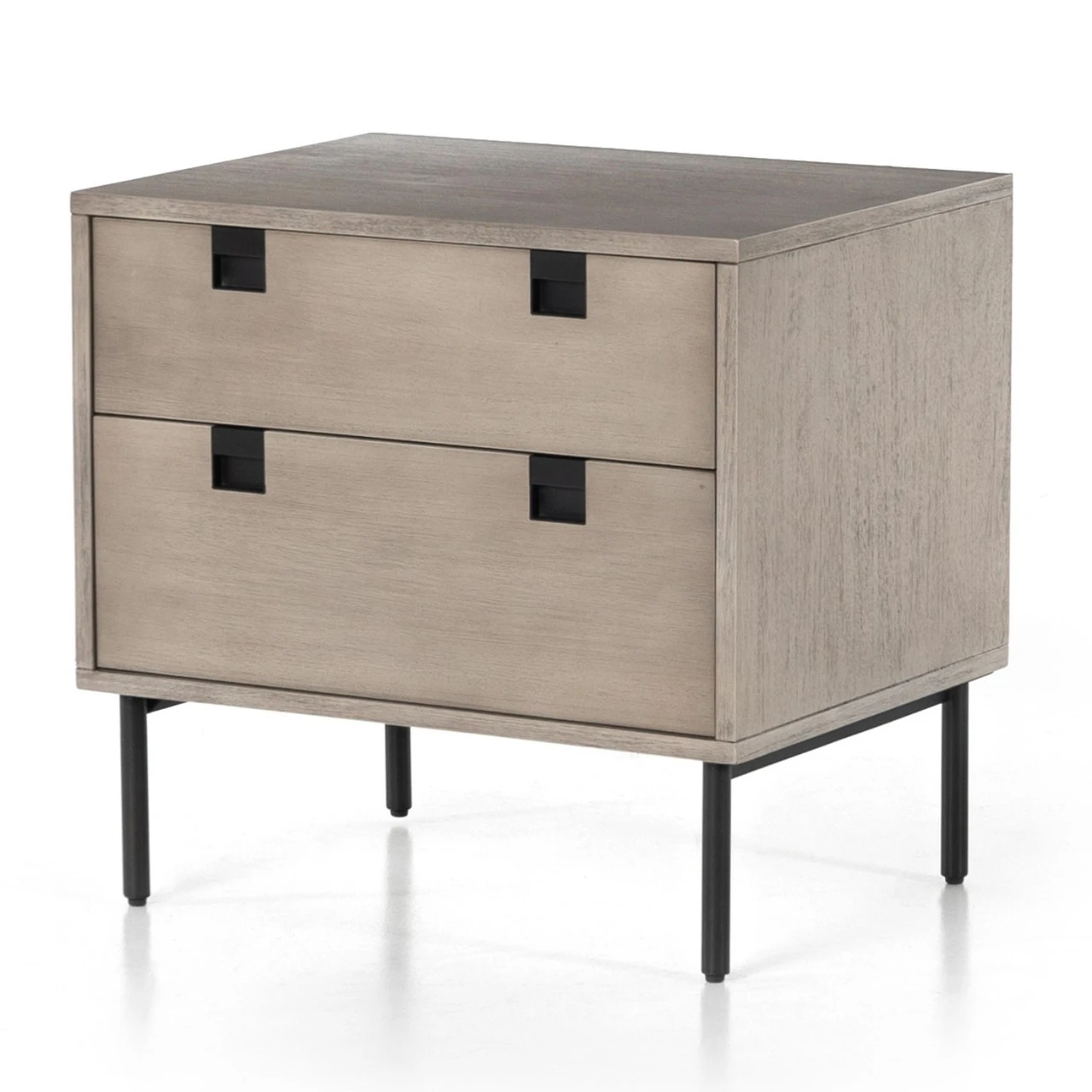 A clean, cubed shape brings a structured-yet-light look to bedside storage, with dual drawers of grey-washed acacia veneer perched atop iron legs finished in an antique bronze. Great solo, even better in pairs.