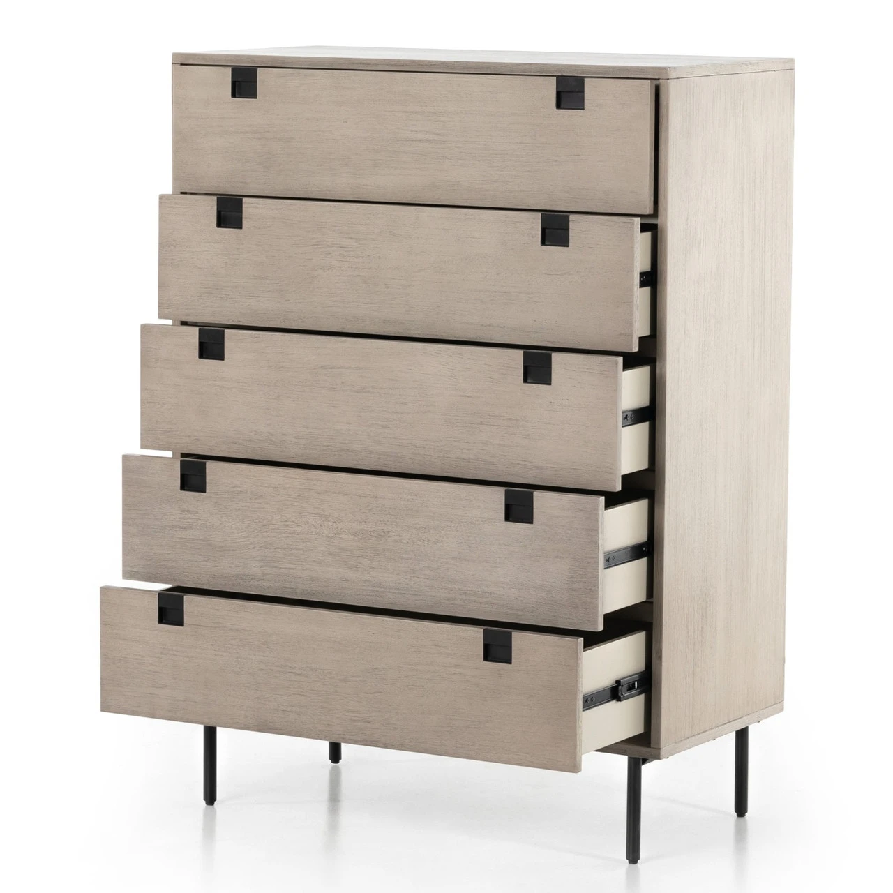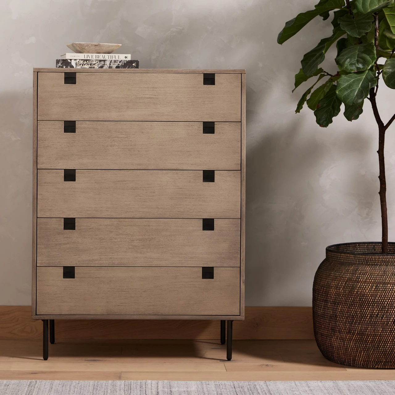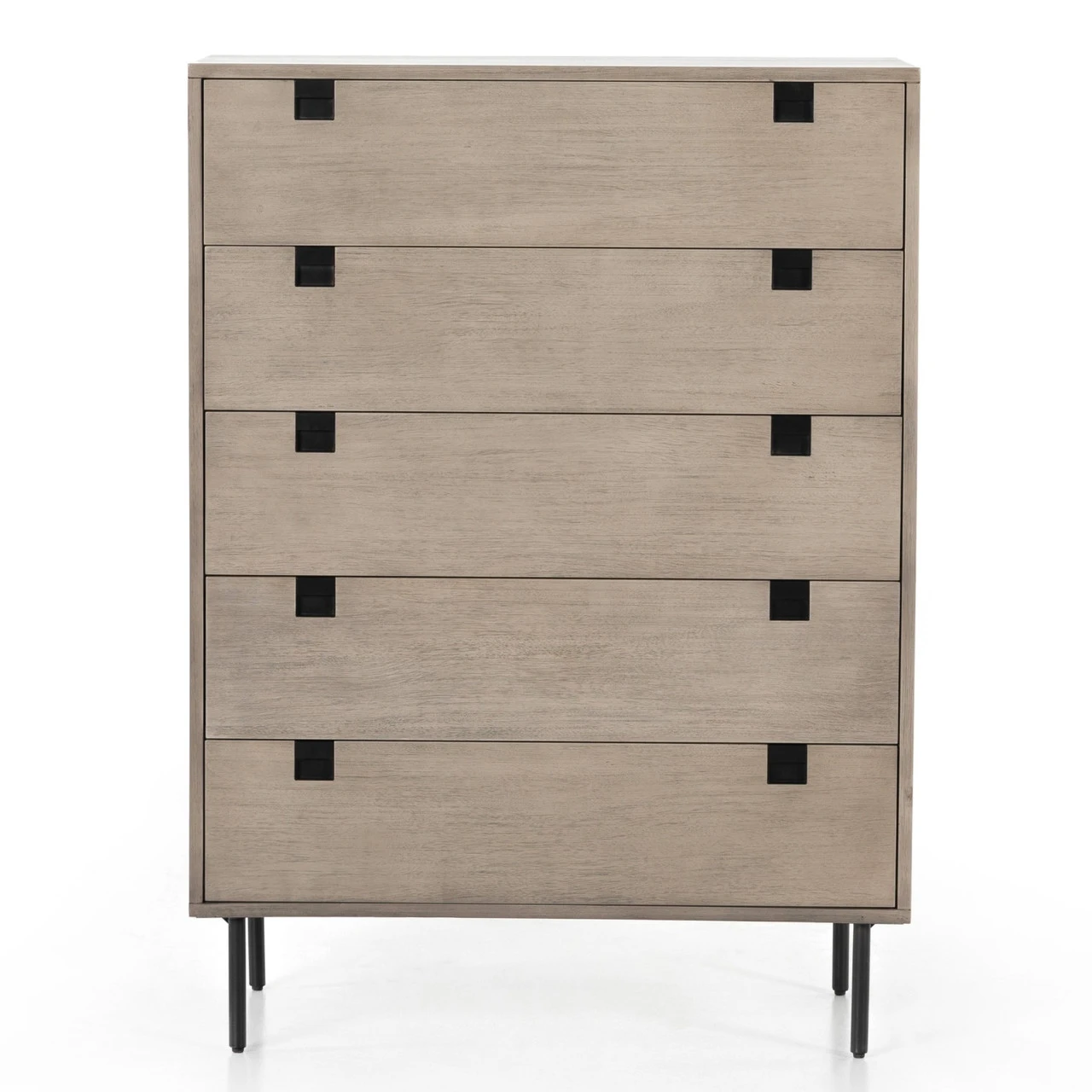 Clean, streamlined shaping brings a structured-yet-light look to bedroom storage, with five spacious drawers of grey-washed acacia veneer perched atop iron legs finished in an antique bronze.