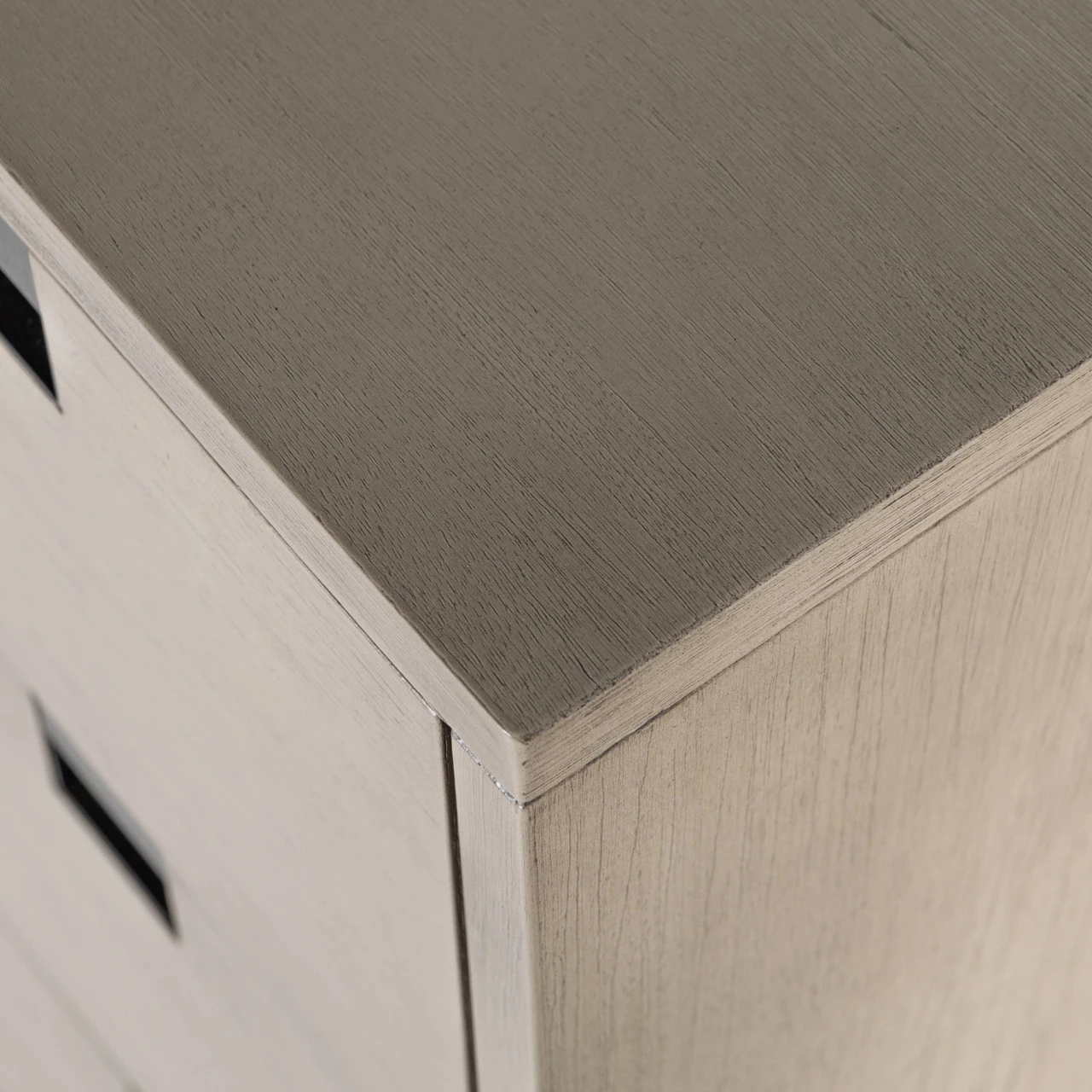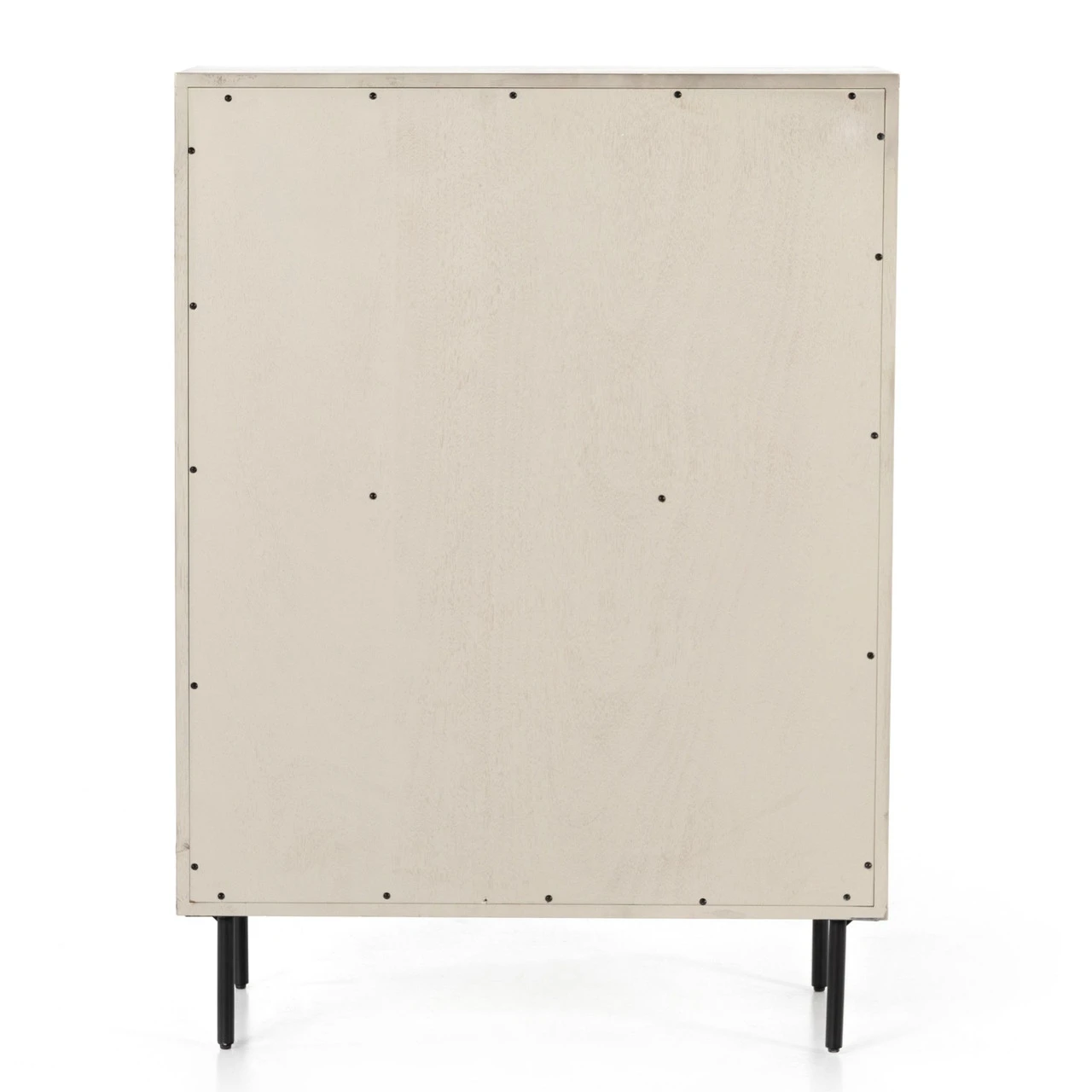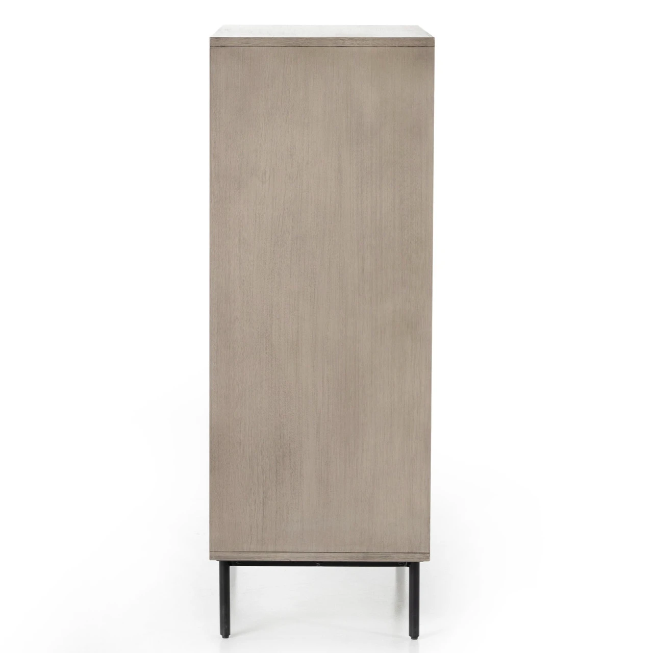 Clean, streamlined shaping brings a structured-yet-light look to bedroom storage, with five spacious drawers of grey-washed acacia veneer perched atop iron legs finished in an antique bronze.