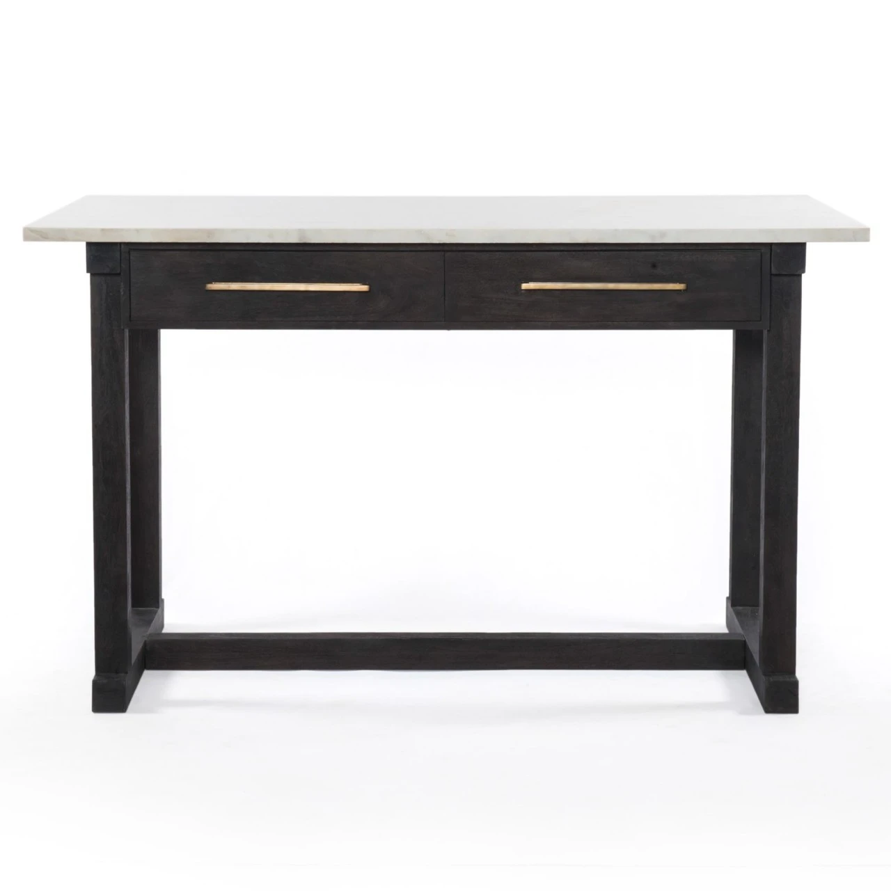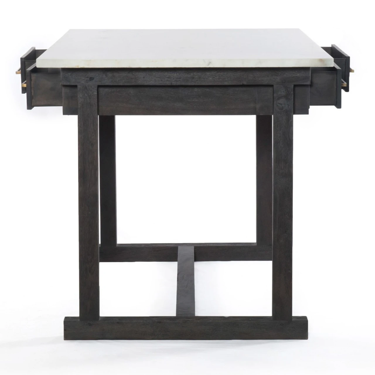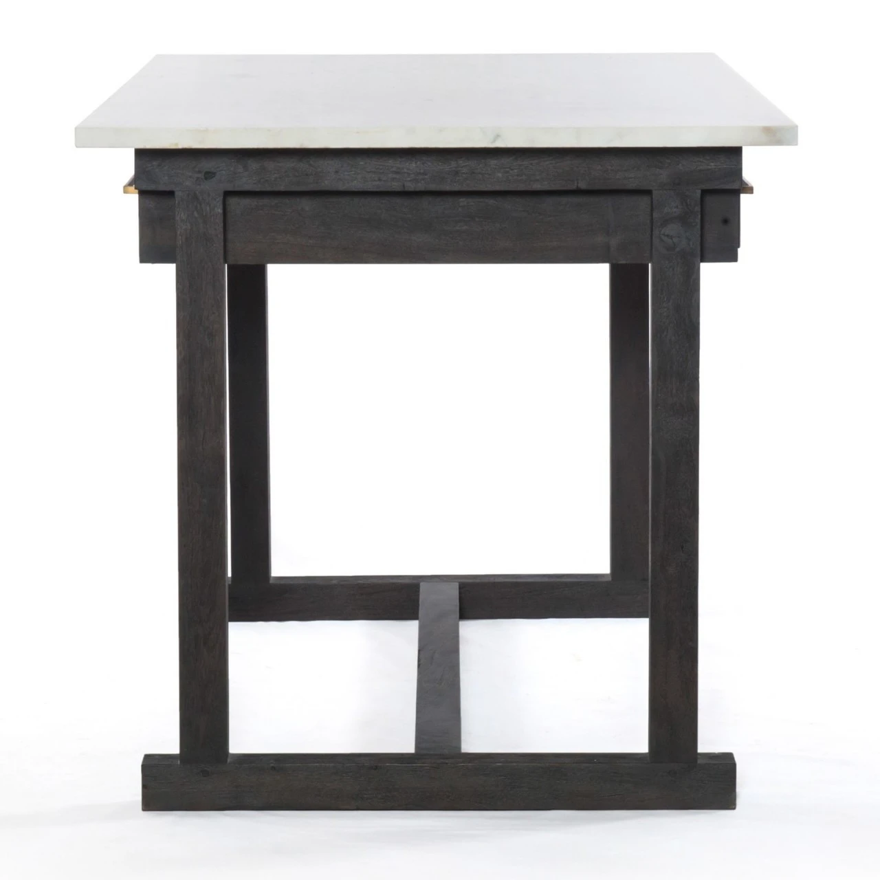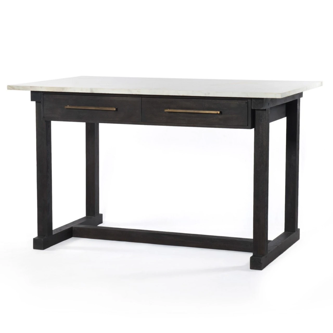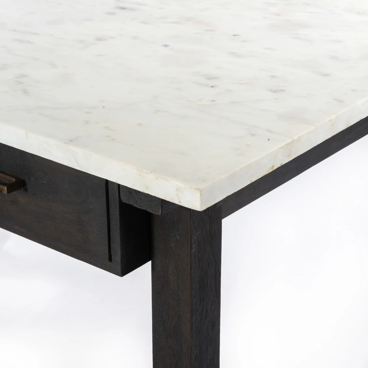 Sophisticated material mixes bring a classic French feel to the contemporary kitchen. Rich, coal-toned mango wood supports a top of polished white marble for a clean look with alluring contrast. Additions like brass drawer pulls bring vintage inspiration. Our Cayson French Country Marble Top Counter Table will transform any dining room or kitchen to a chic French coast luxury villa.
