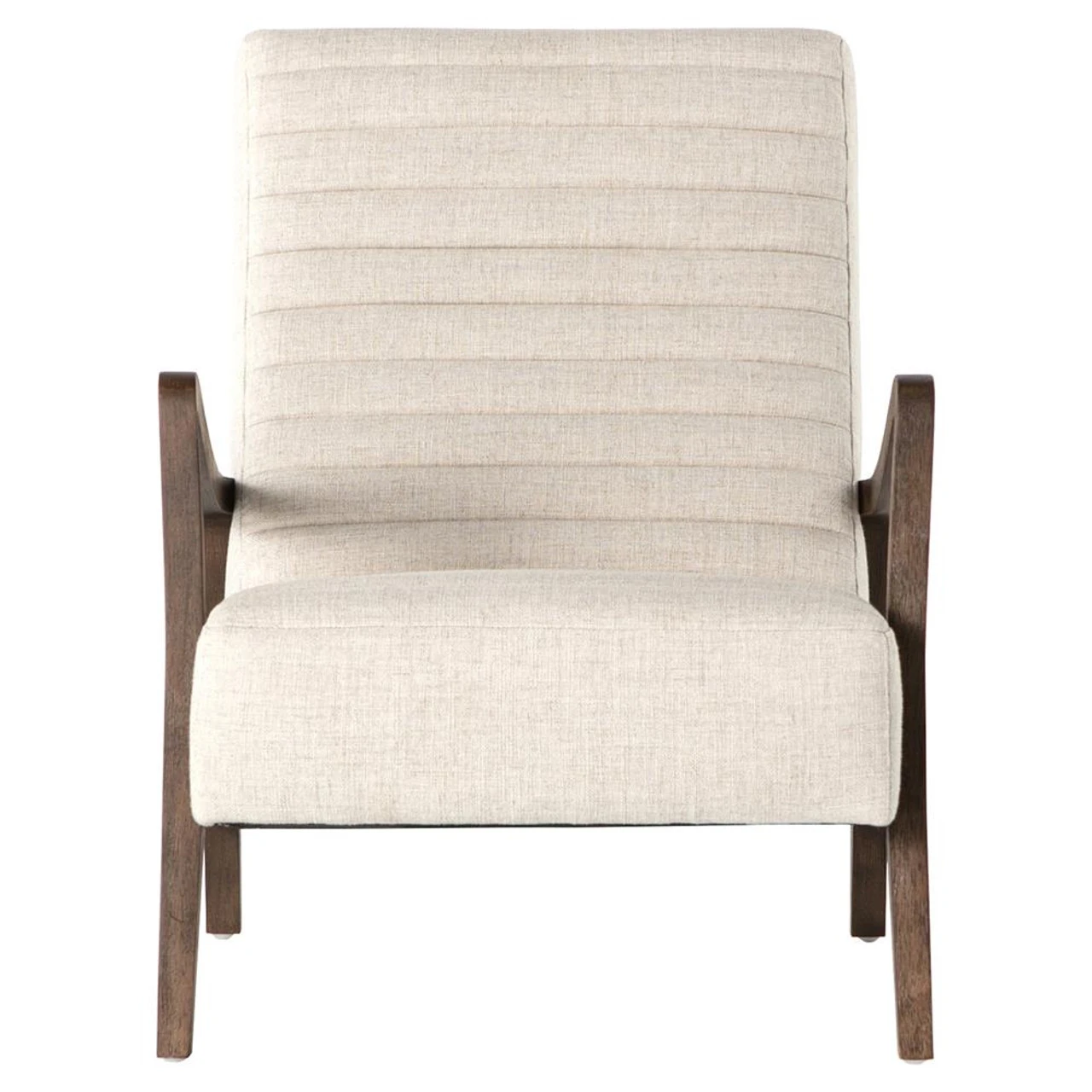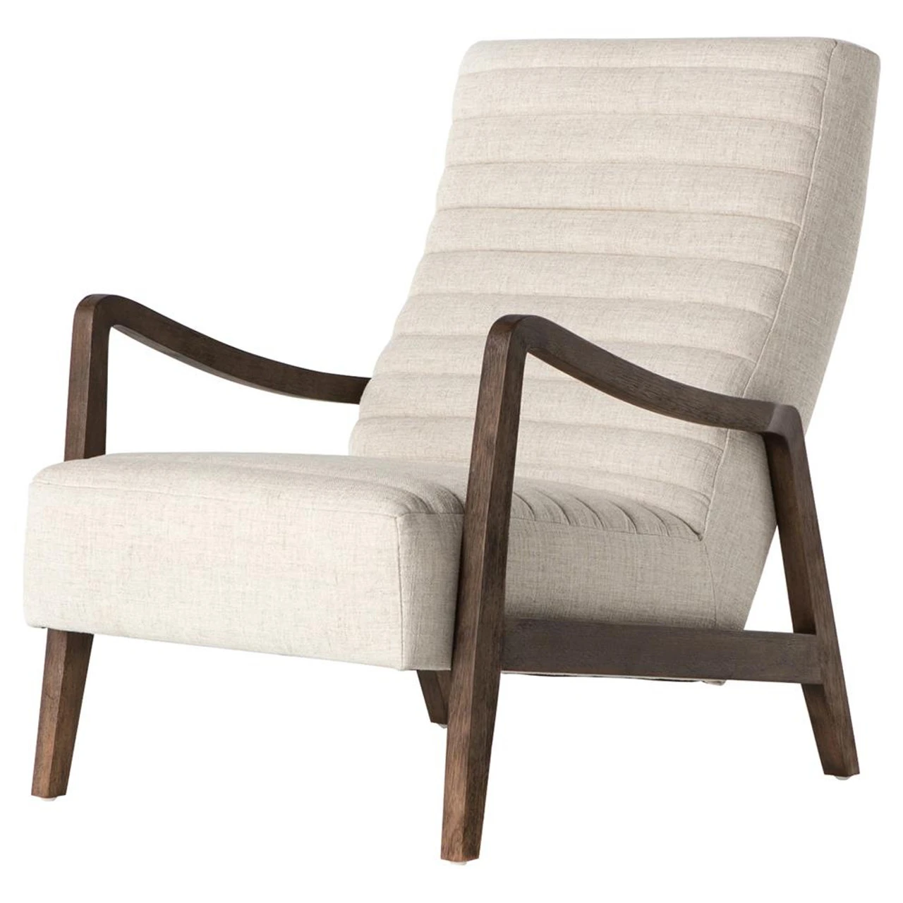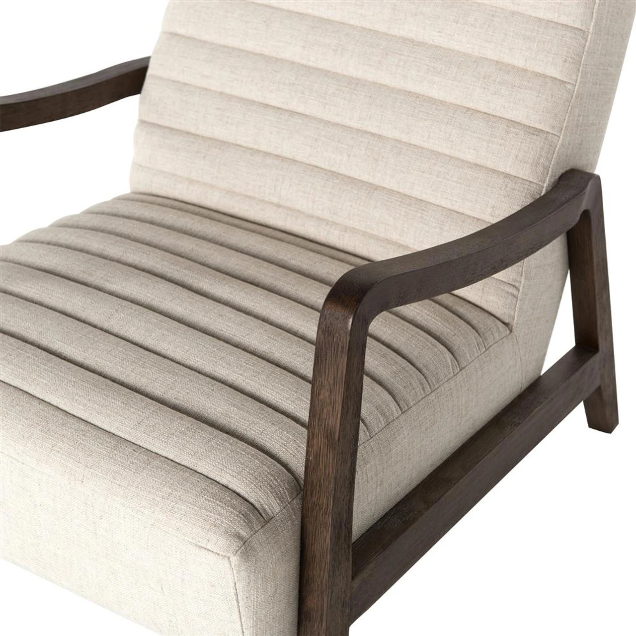 A dramatically shaped mid-century frame meets with on-trend channel tufting. Pale, neutral upholstery contrasts with dark sienna brown parawood. Complete your living room decor with our modern linen club chair!