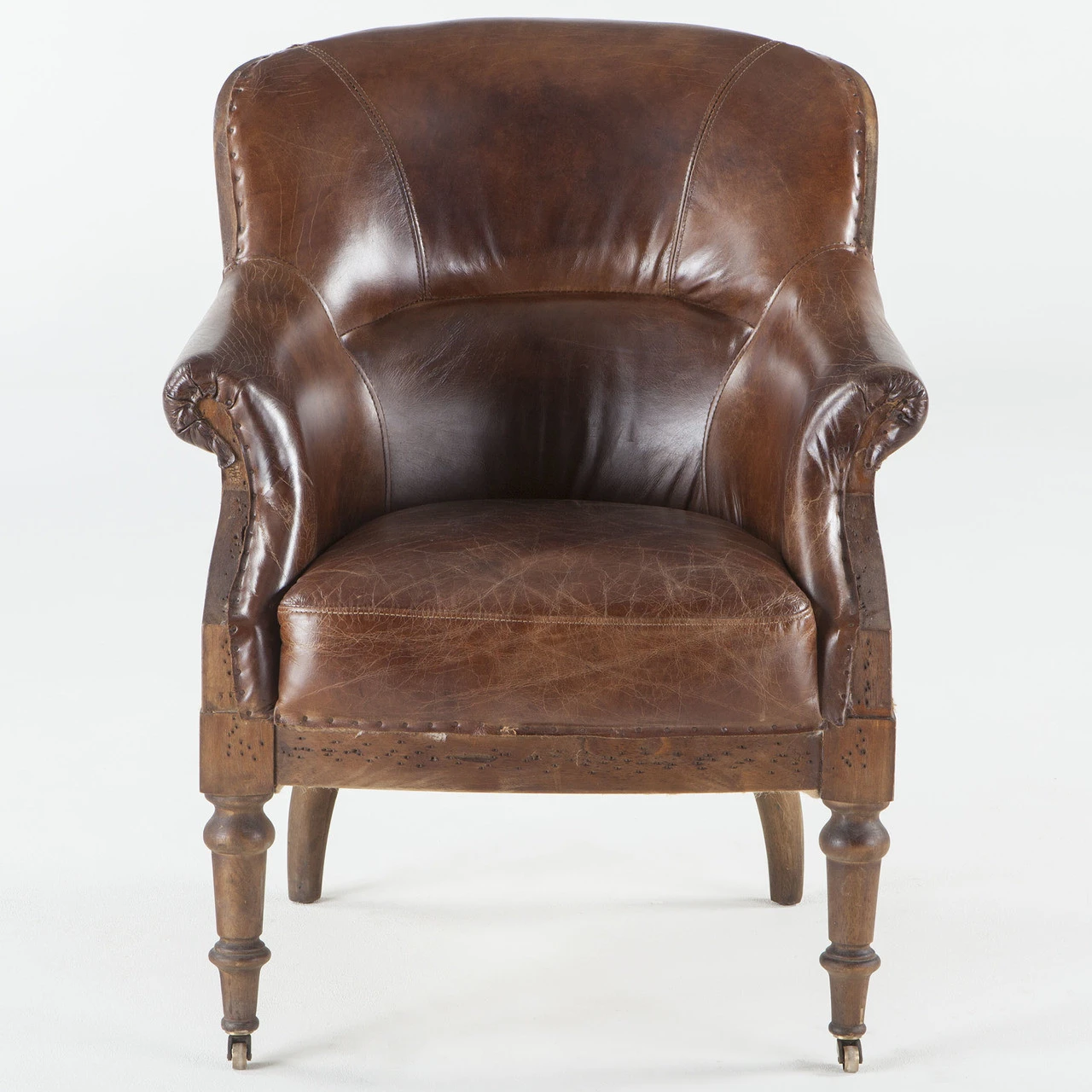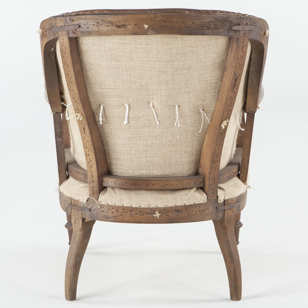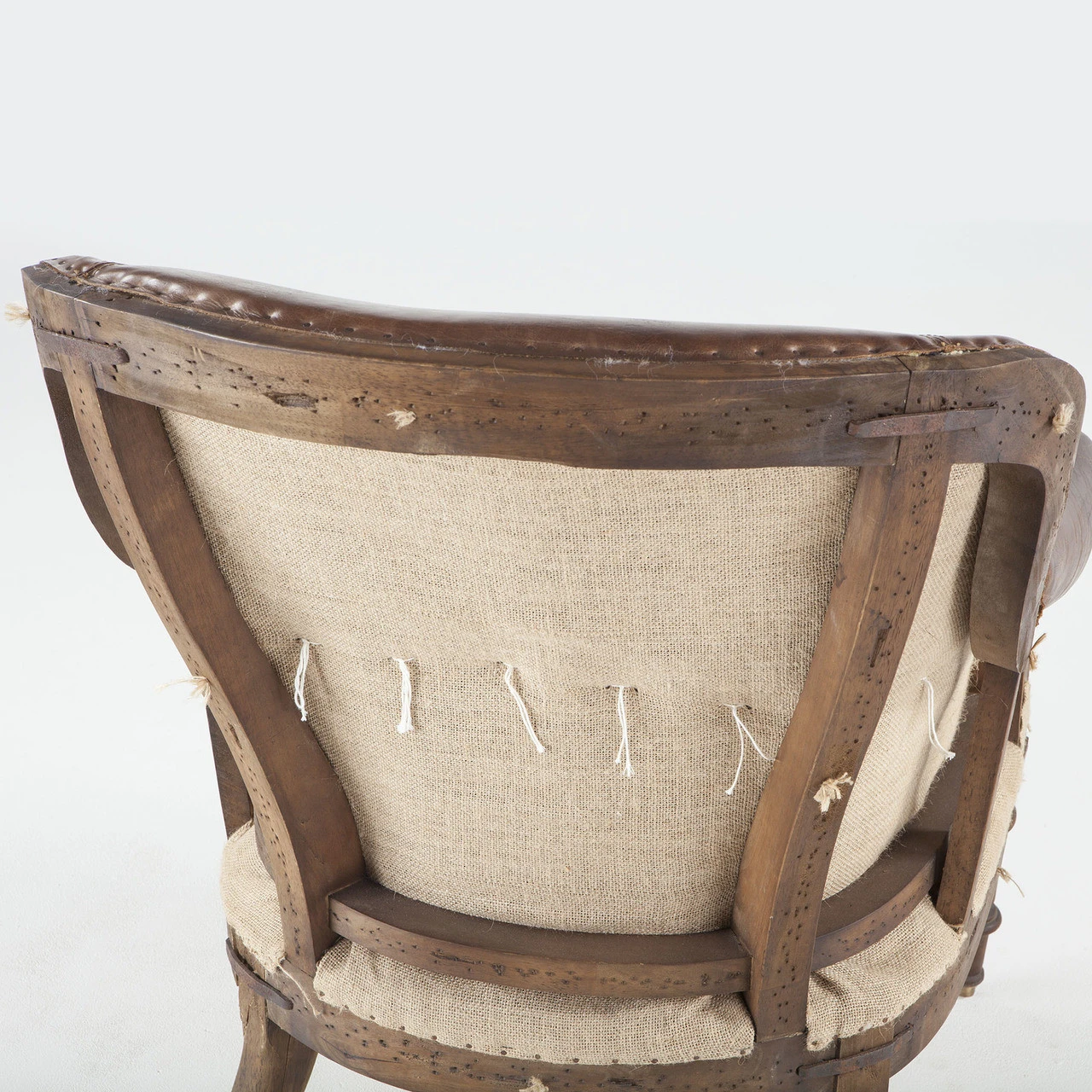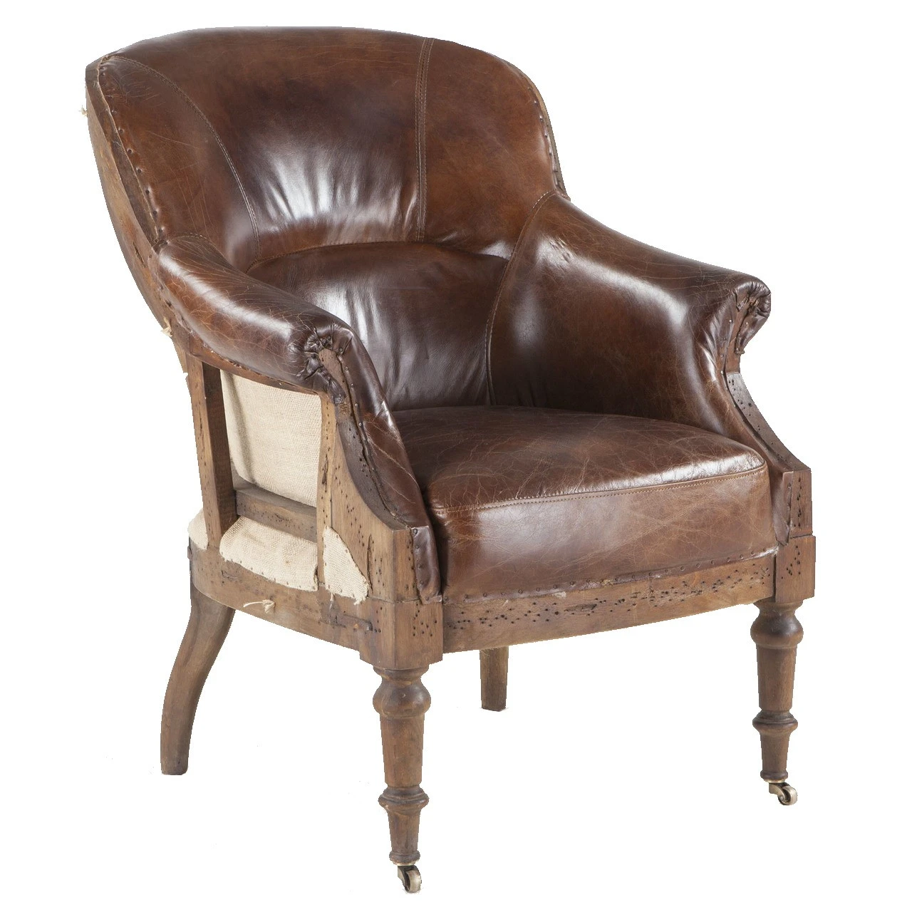 Churchill Deconstructed Vintage Leather Club Chair is upholstered in vintage cigar leather and accented with rustic nailheads. A solid hardwood dark walnut frame is left exposed along the chair’s sides and back, letting the hand finished wood grain shine through. Jute lines the back of the chair and adds a contrasting texture to the elegant leather. Though classic in style, our Deconstructed Vintage Leather Club Chairs are an attractive piece for any décor. Use it in a bedroom to create a cozy private nook, or add an extra seat to a living room, office or guest room.