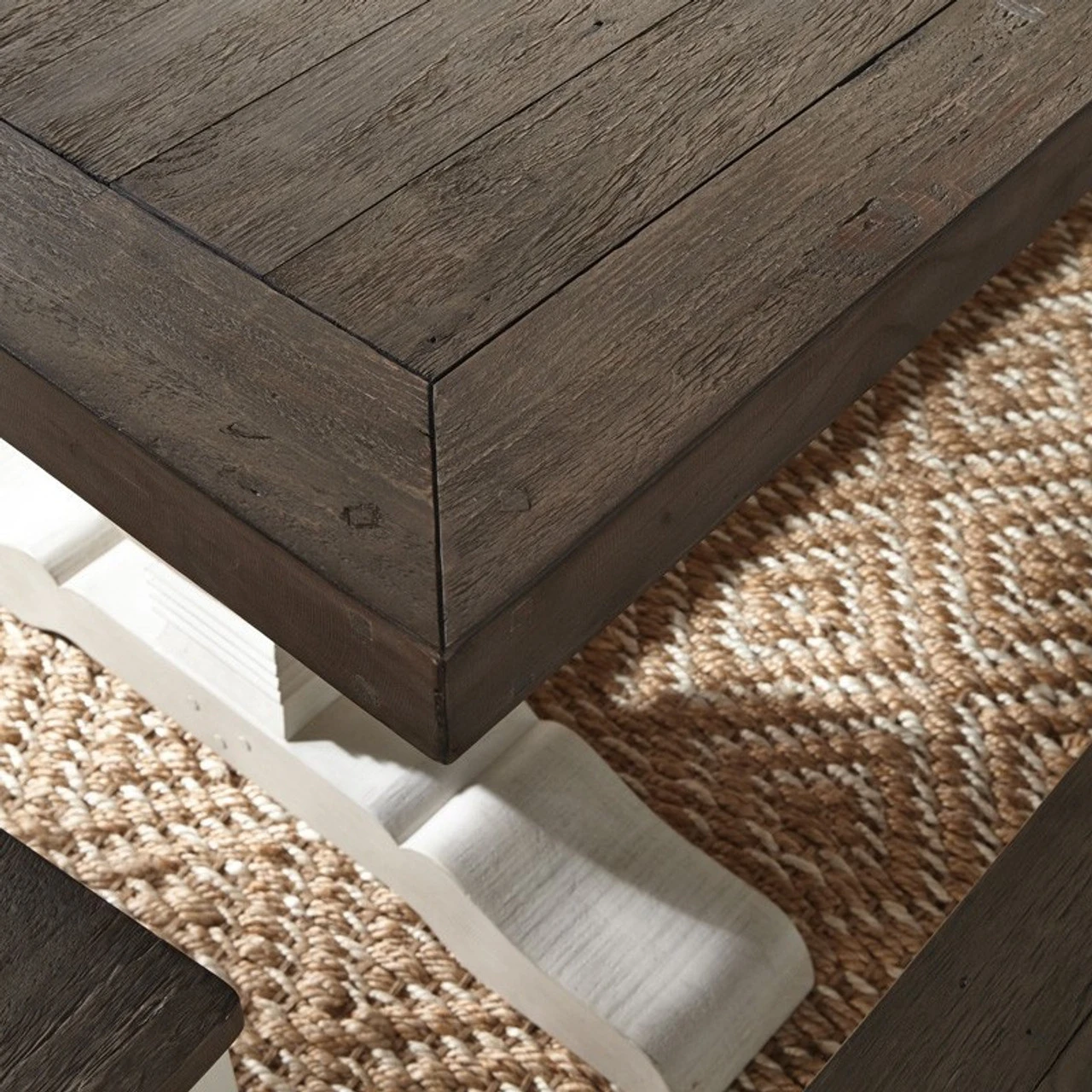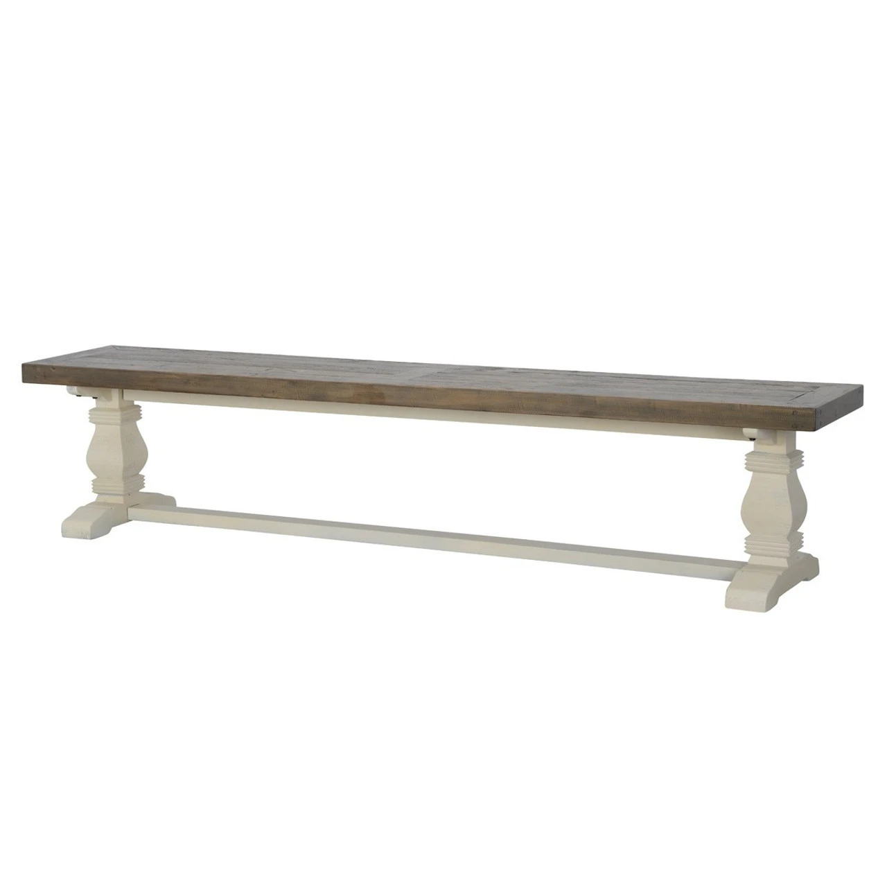 Rustic and majestic, this trestle dining room table brings classical elegance to any home. Meticulously hand-crafted from natural reclaimed pine wood in a two-tone finish, this double trestle dining table bench is sturdy and durable for everyday use and the perfect centerpiece for an elegant, rustic ambiance. Its seat is dark stained to contrast with the white trestle base. Hand carved legs add a sculptural look to the table. The Coastal Farmhouse Reclaimed Wood Trestle Dining Bench is in 83″ length, which allows you to comfortably seat up to 4 guests at the table.
