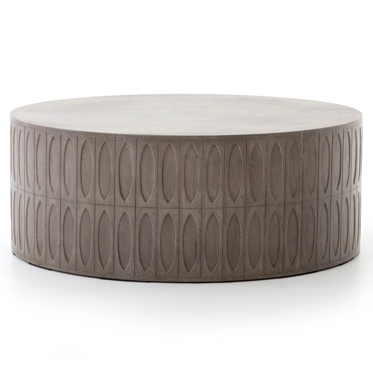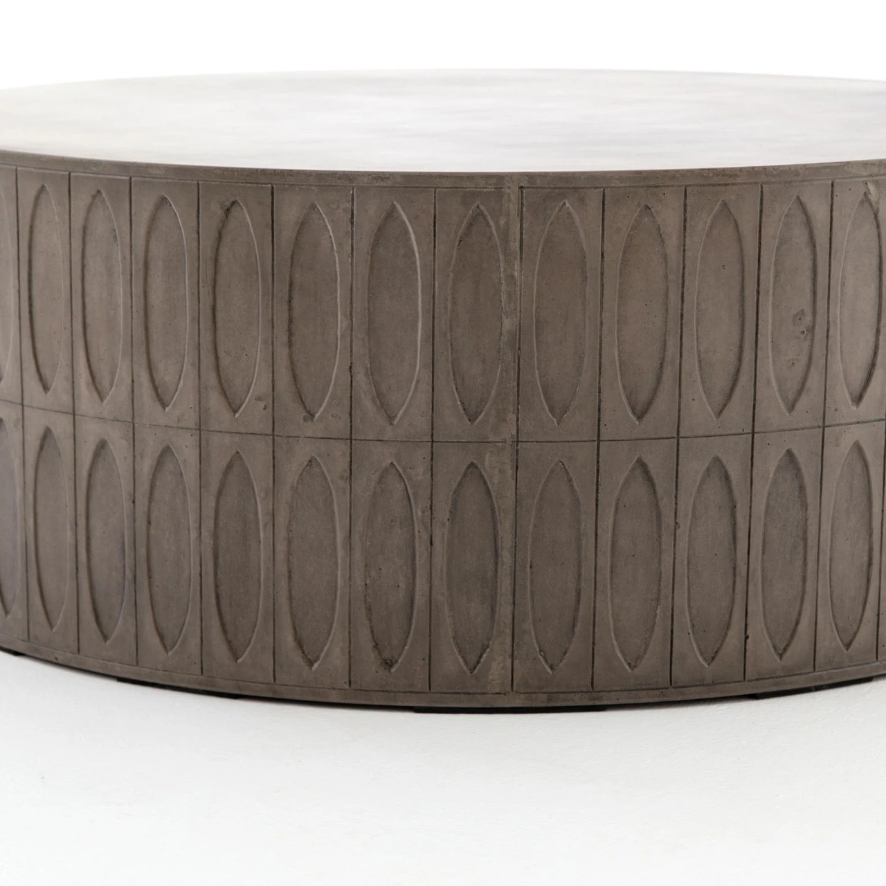 Concrete adopts alluring shapes as modern geometrics play with nature’s petal form. A hollowed drum of dark grey concrete is intricately etched for artistic intrigue. Safe indoors or out. Cover or store indoors during inclement weather or when not in use.