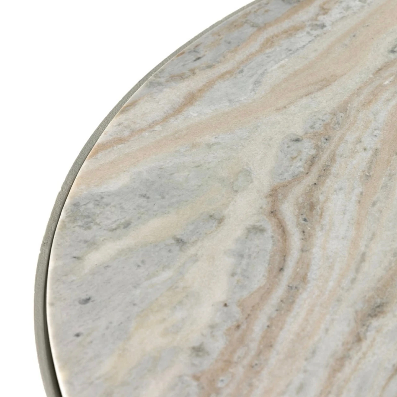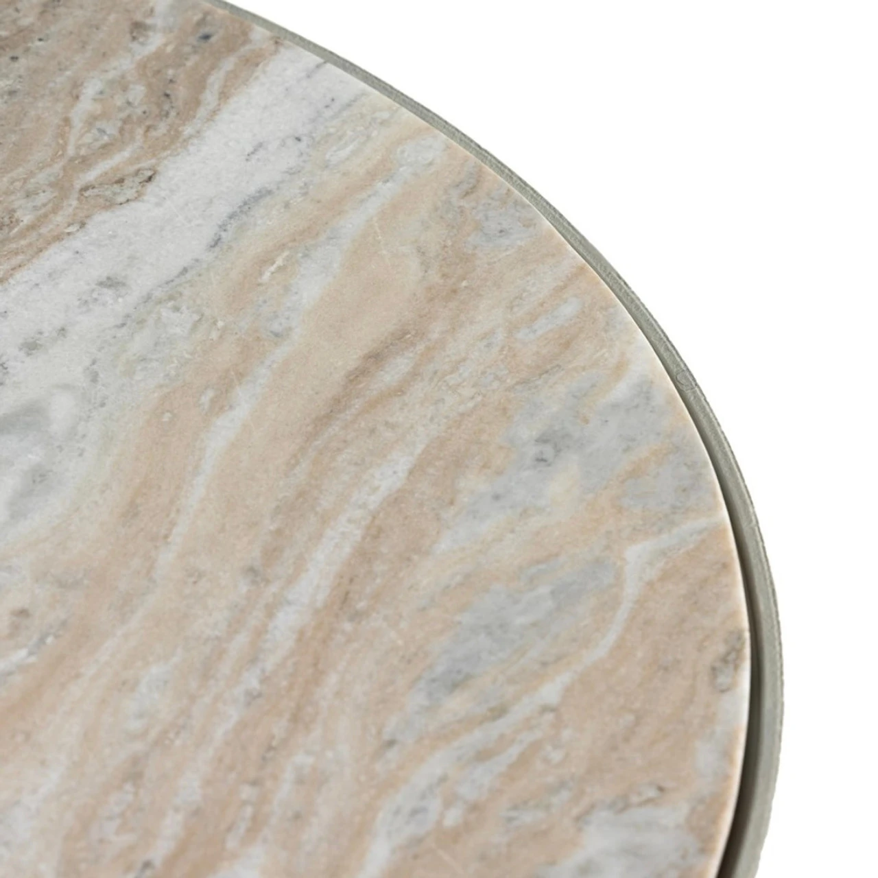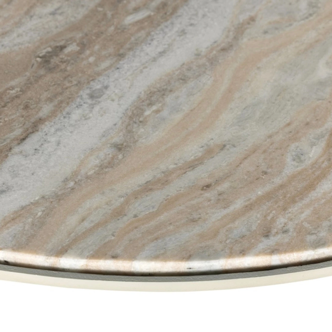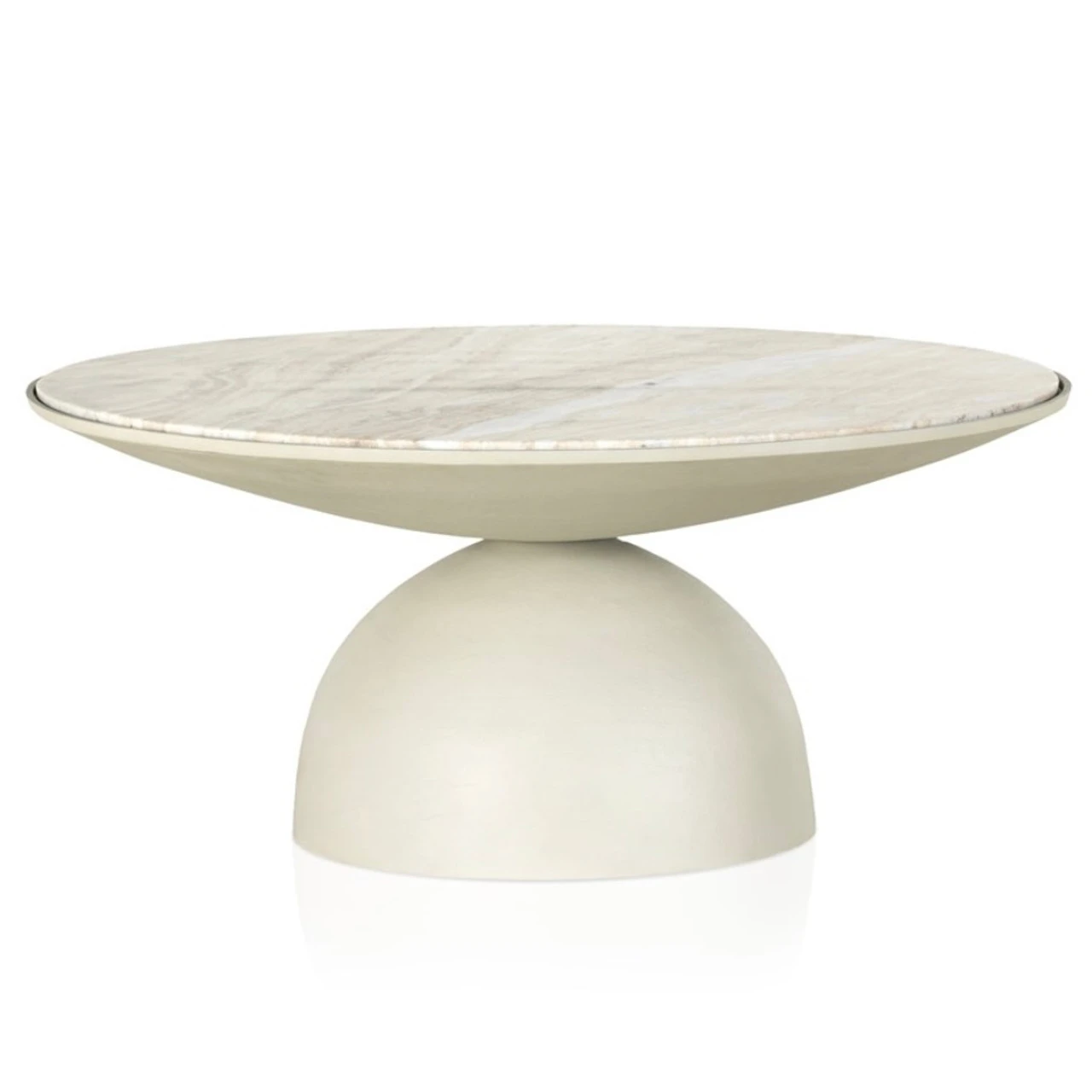 A sculptural play on shape. Textured matte white-finished aluminum base supports a grand, rounded tabletop of creamy taupe marble with beautiful natural veining.