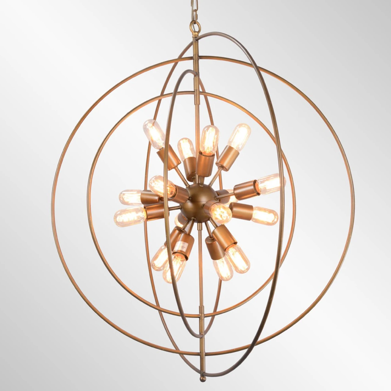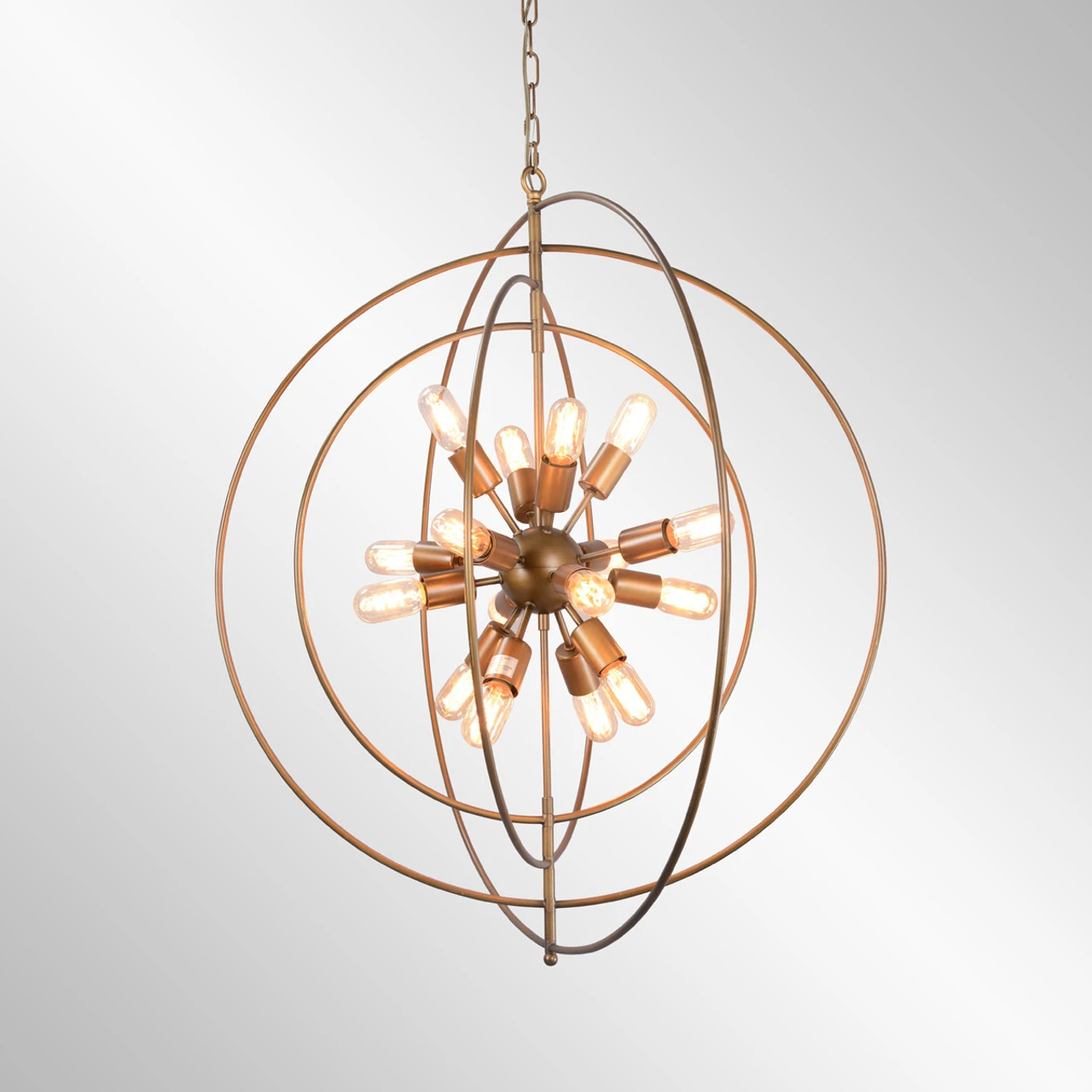 A gleaming brass finish highlights the alluring curves of this chandelier featuring 16 bulbs within concentric iron orbs. Available in two sizes, this chandelier makes a statement in any space with its eye-catching styling. Bulbs not included.