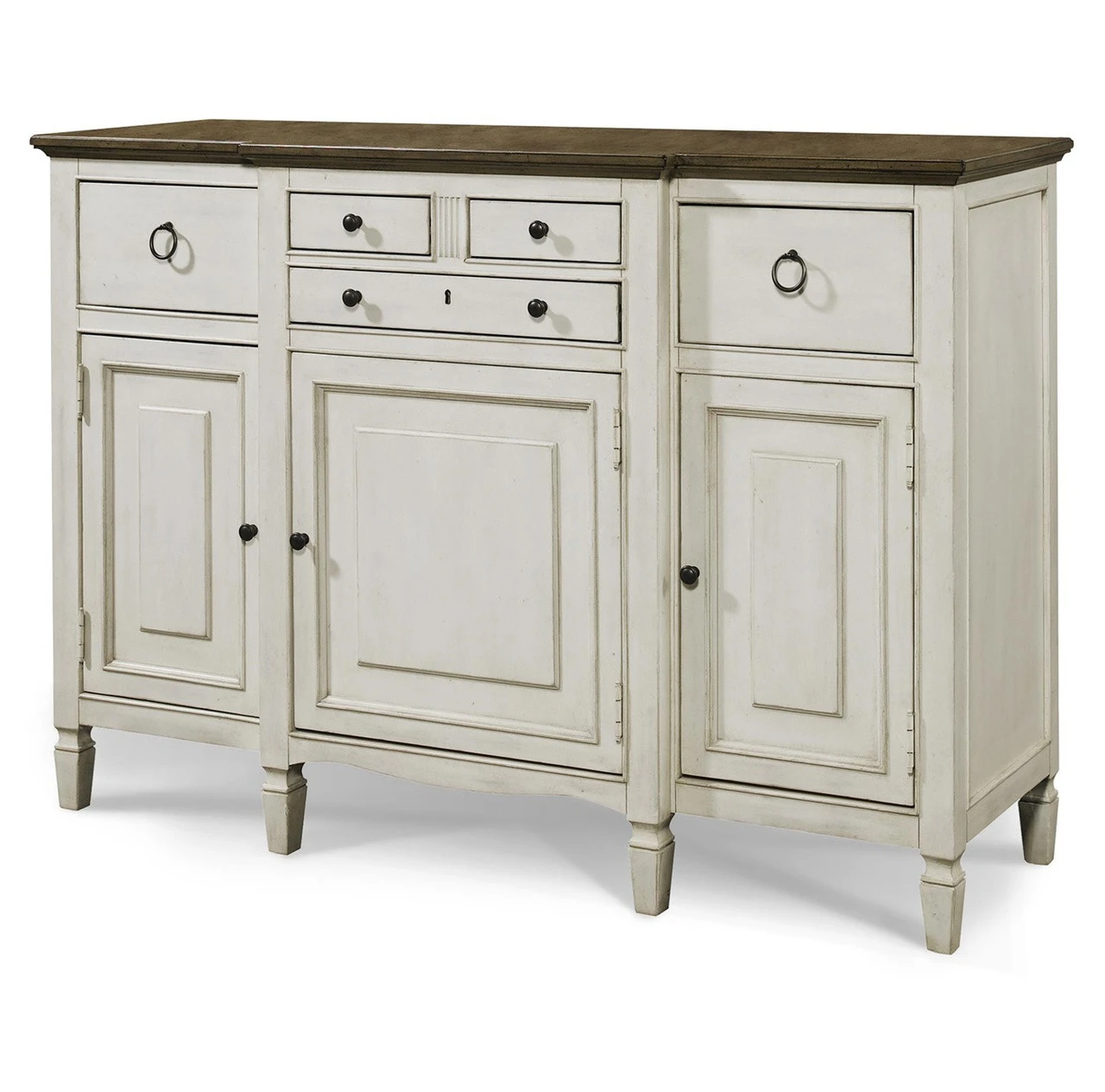 Stylish without being ostentatious, Country-Chic Maple Wood Buffet Server Cabinet brings a fresh and relaxed country-chic touch to your dining room or kitchen decor. Crafted of hardwood solids, maple veneers, and featuring lightly distressed Cotton finish legs and Driftwood finish server top. This white serving buffet feature 4 drawers with silverware tray insert, three cabinet doors that hide wine bottle storage and adjustable shelving for versatile storage.Â