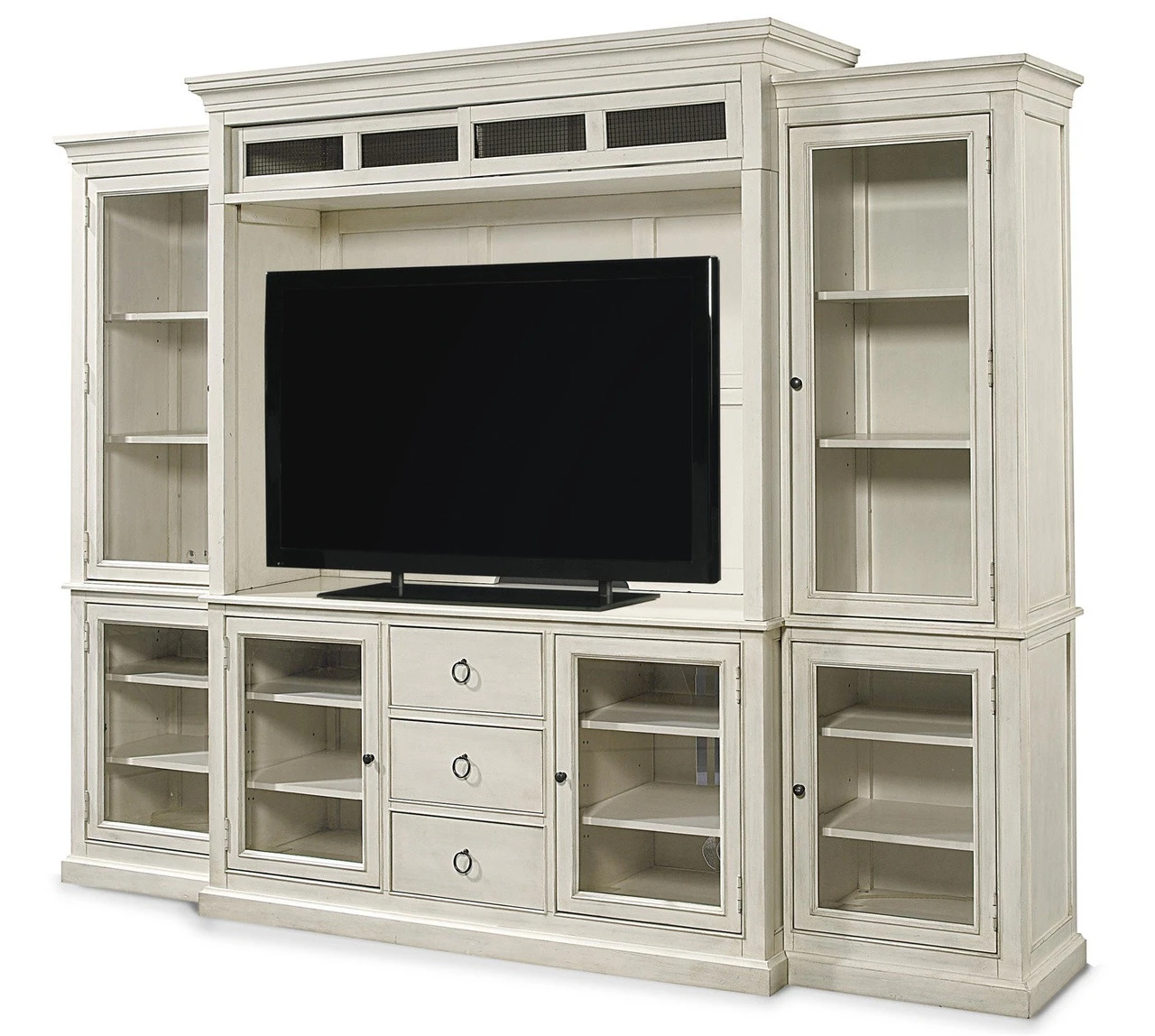 Stylish without being ostentatious, Country-Chic Maple Wood White TV Entertainment Wall Unit brings a fresh, breezy and relaxed country-chic touch to your living room or bedroom. Crafted of hardwood solids, maple veneers, and featuring lightly distressed Cotton finish. This white entertainment wall media system include, tv stand, media hutch and two glass door bookcases. Featuring Sliding top doors with metal grill accent for component storage, Six doors Adjustable shelves and Three drawers for ample storage for media and gaming consoles.