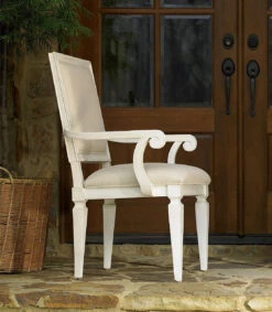 Stylish without being ostentatious, Country-Chic Woven Back Upholstered Dining Arm Chair brings a fresh and relaxed country-chic touch to your dining room decor. Crafted of hardwood solids, rattan and maple veneers, featuring lightly distressed Cotton finish and gingham fabric upholstery. This white Upholstered dining arm chair feature sophisticated details like Woven rattan back, Scrolled turned arms and Upholstered slip cushion.