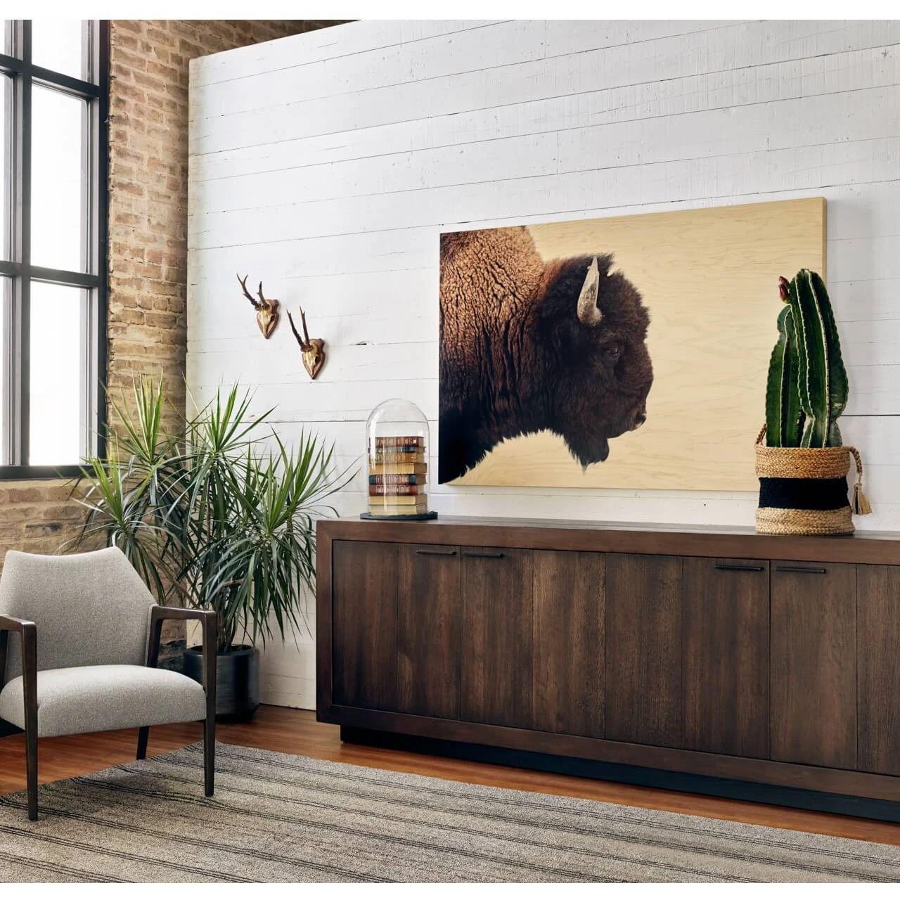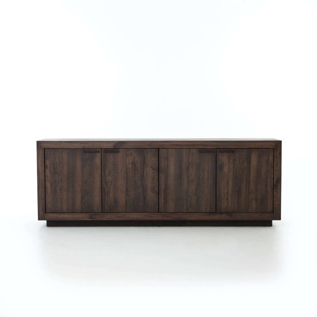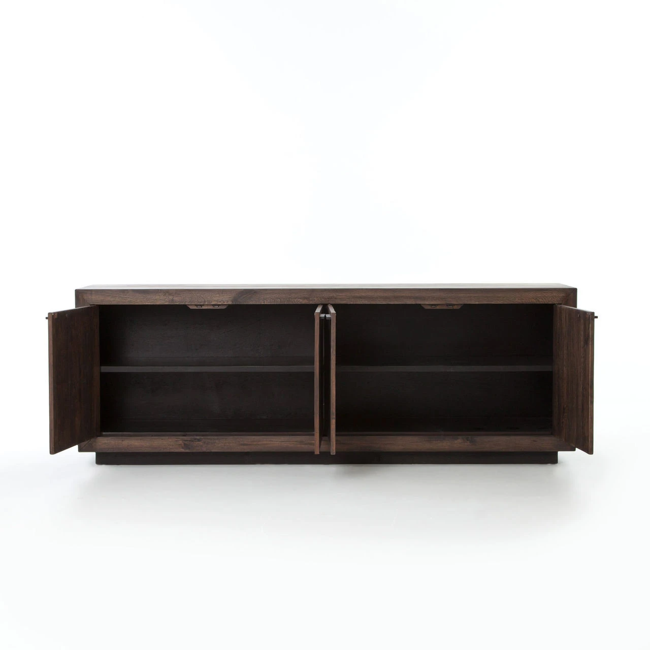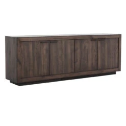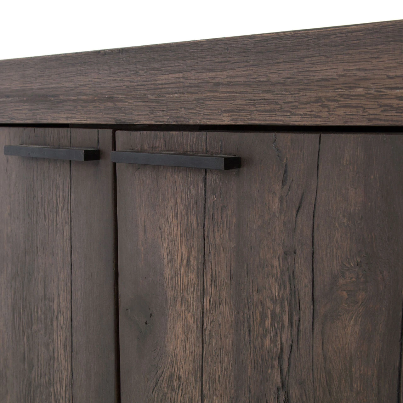 Reclaimed, textural oak with a square shape and a soft hand. Four, magnetic closure doors with streamlined iron handles, set on a plinth base. Modern lines and ample storage make our Couric Rustic Wood 4 Door Sideboard a beautiful addition to a dining room or kitchen.