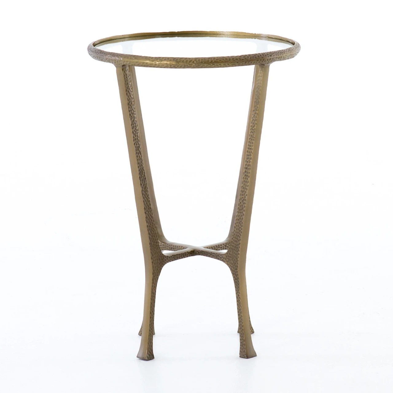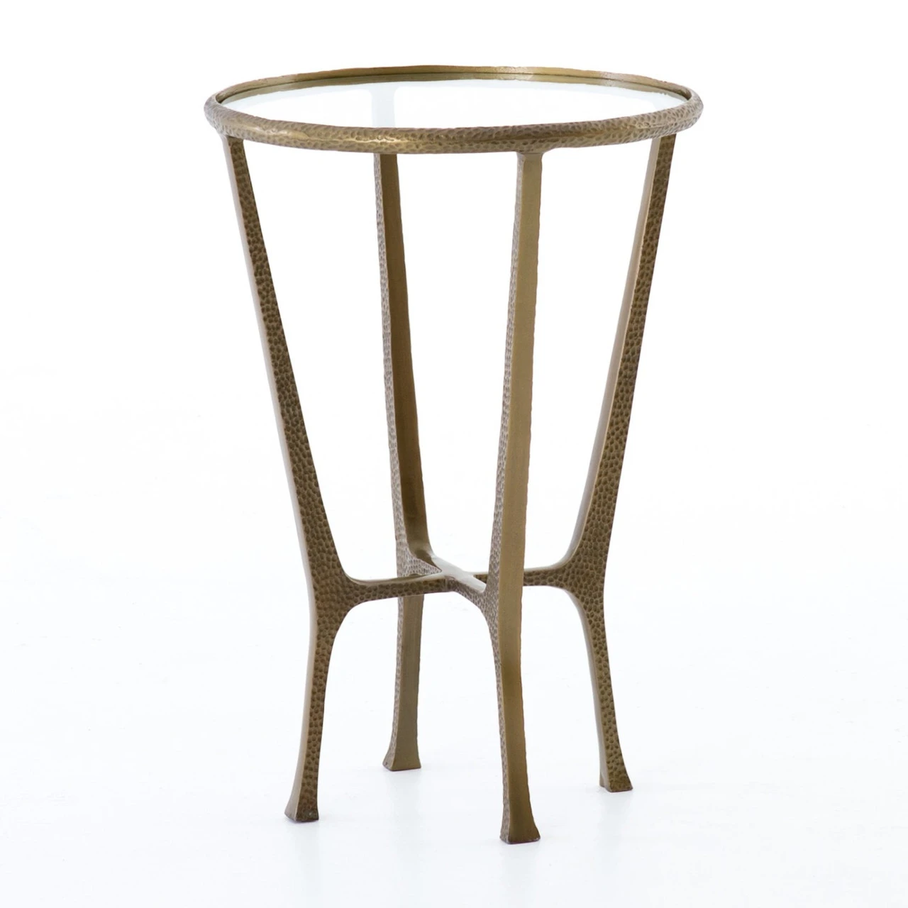 A minimalist design adopts fresh depth via structural spirit. An aged brass finish lends a vintage note to open-styled aluminum. A tempered glass tabletop rounds, bringing a touch of softness to the forward-thinking end table.