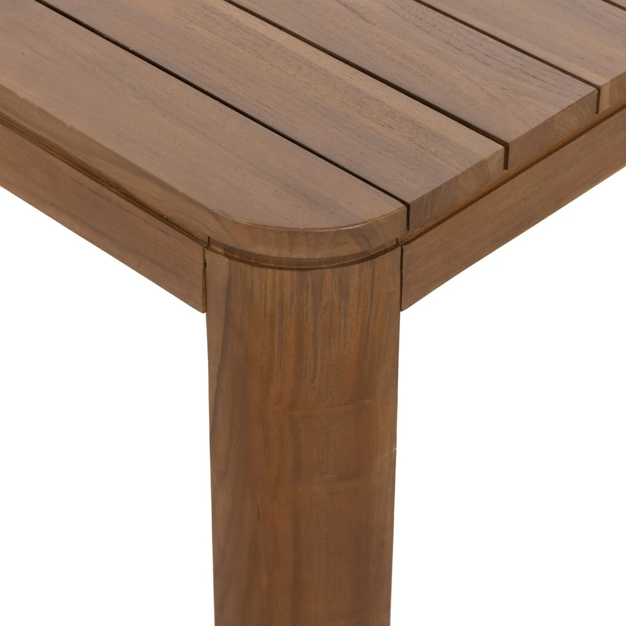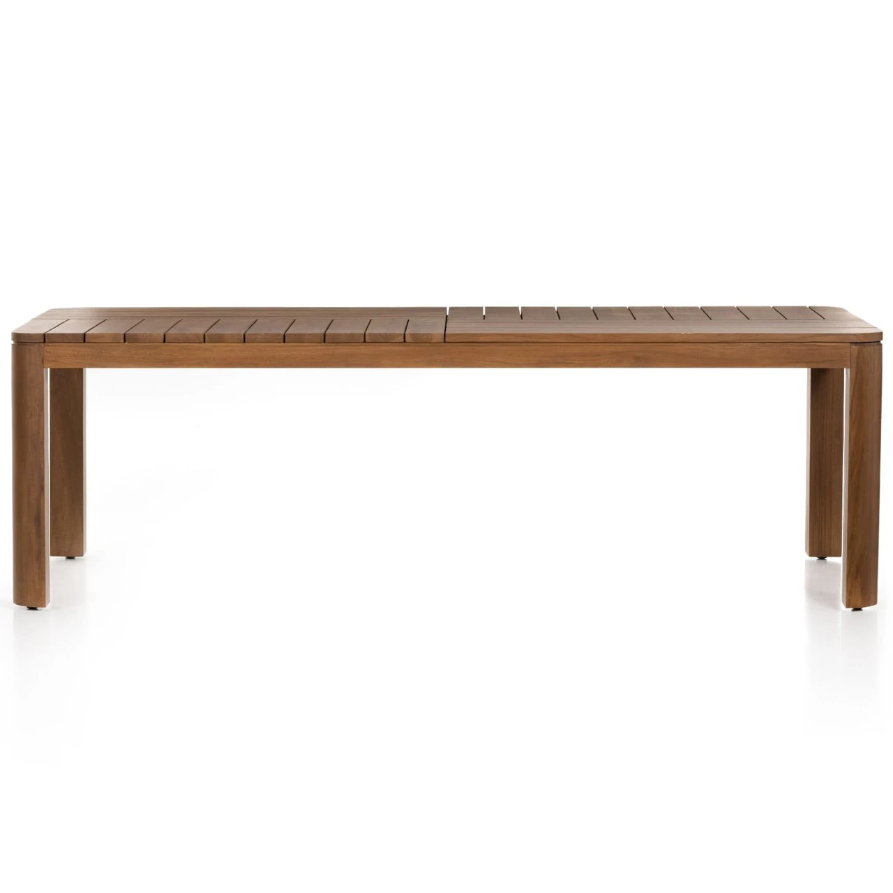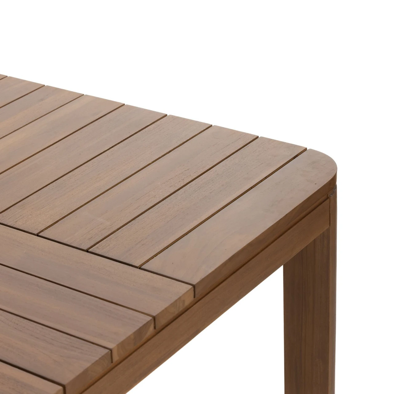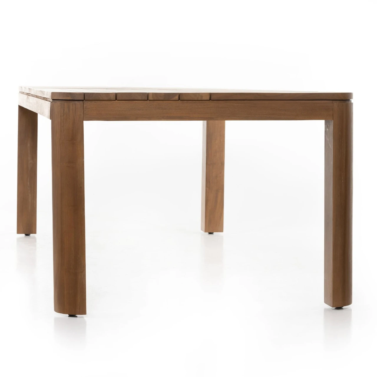 Made entirely from FSC-certified teak, a rectangular, Parsons-style dining table features top slatting plus subtly curved corners for a lighter look. Cover or store indoors during inclement weather and when not in use.