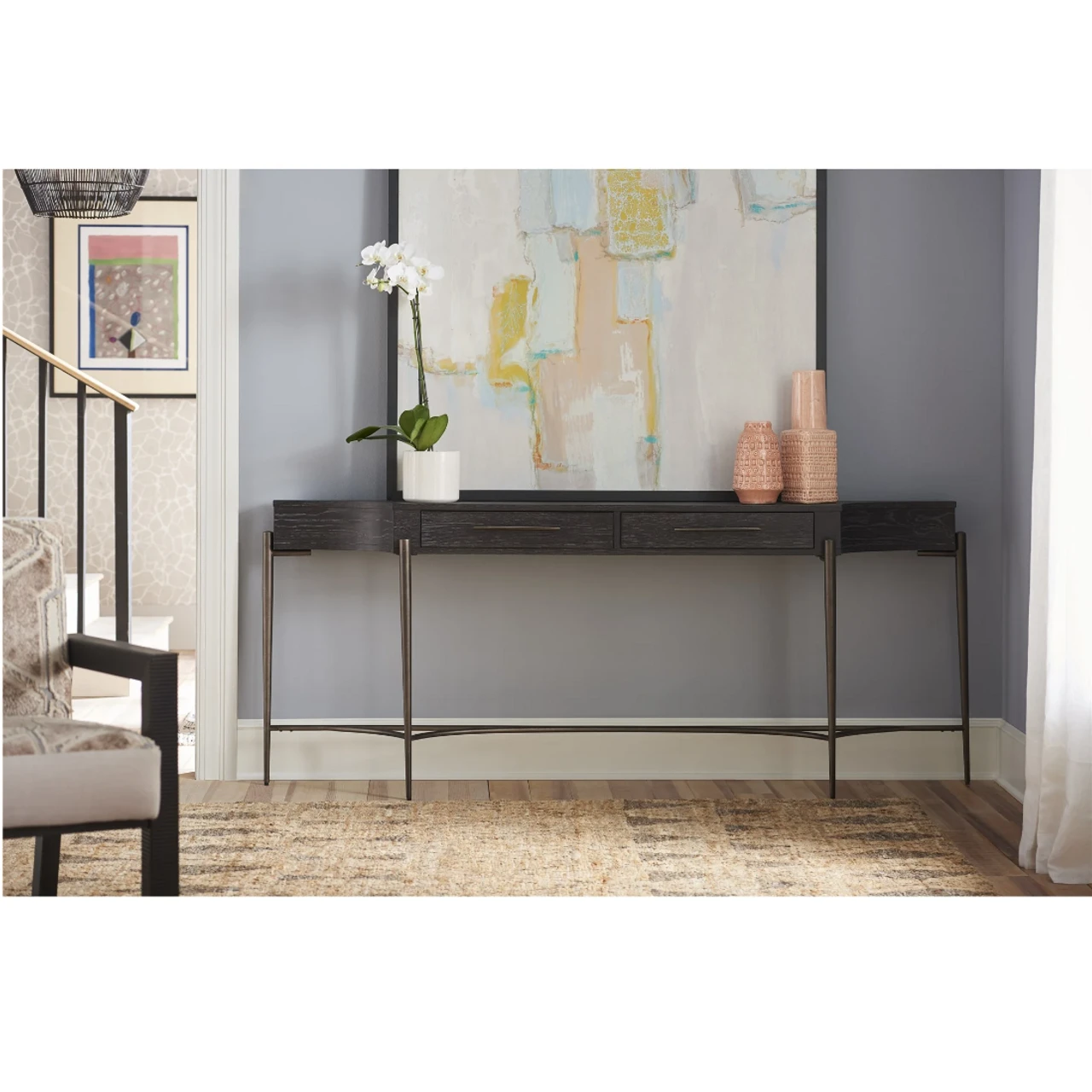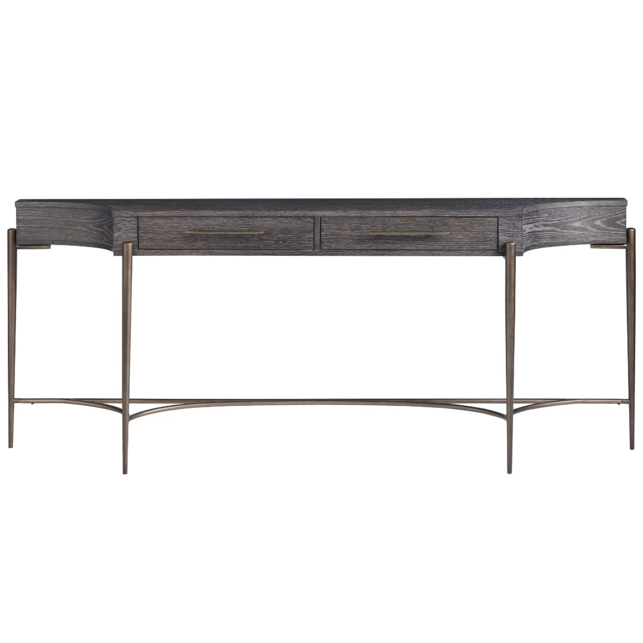 The Oslo Console Table introduces an airy, mid-century aesthetic into spaces, featuring a long, narrow body supported by tall, stately bronzed legs.