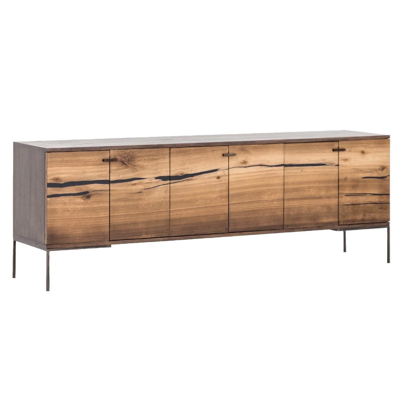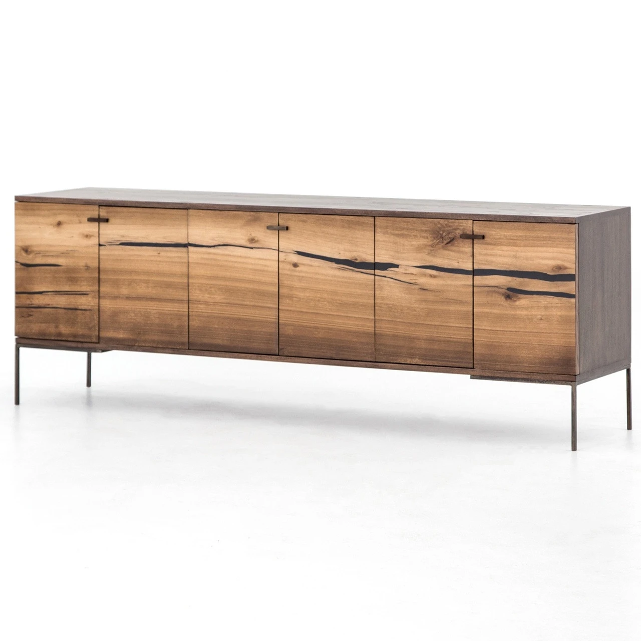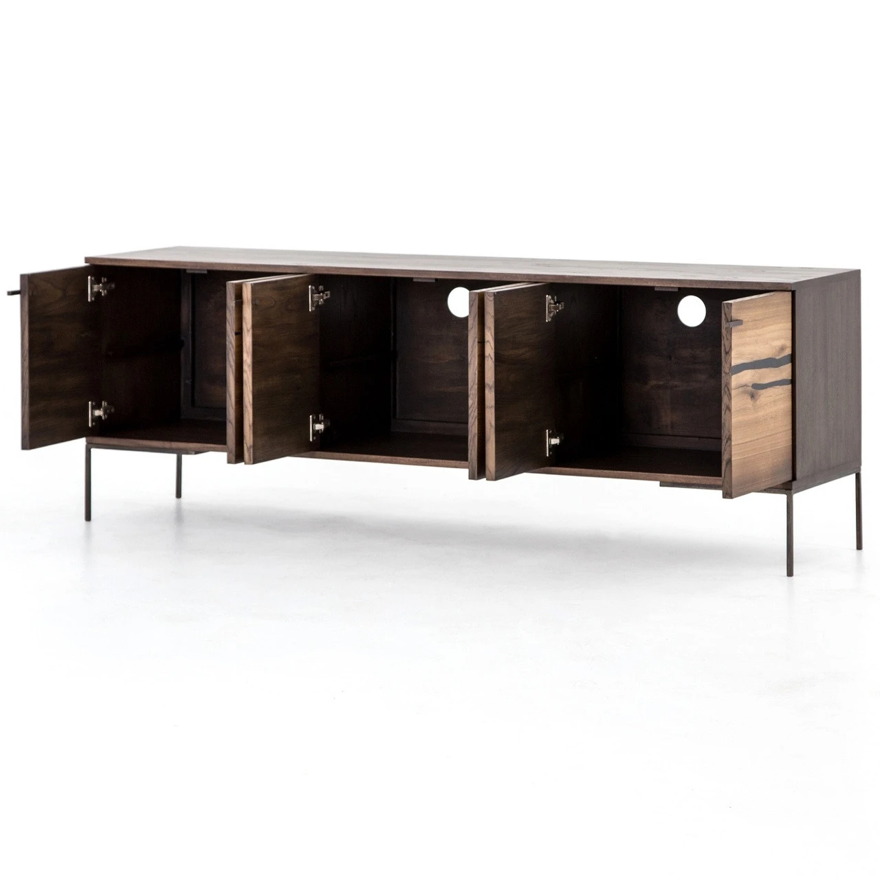 Plantation yukas deliver warmth to minimalist styling. Slender legs of bronzed iron support an ash-finished frame as resin fills yukas’ natural graining. Iron hardware adds a hint of modern edge to mid-century form. Six open-front doors offer ample storage. Given its handmade and hand-finished nature, variations and imperfections in the wood are to be expected and celebrated. Each media cabinet is an original and no two pieces are exactly alike.