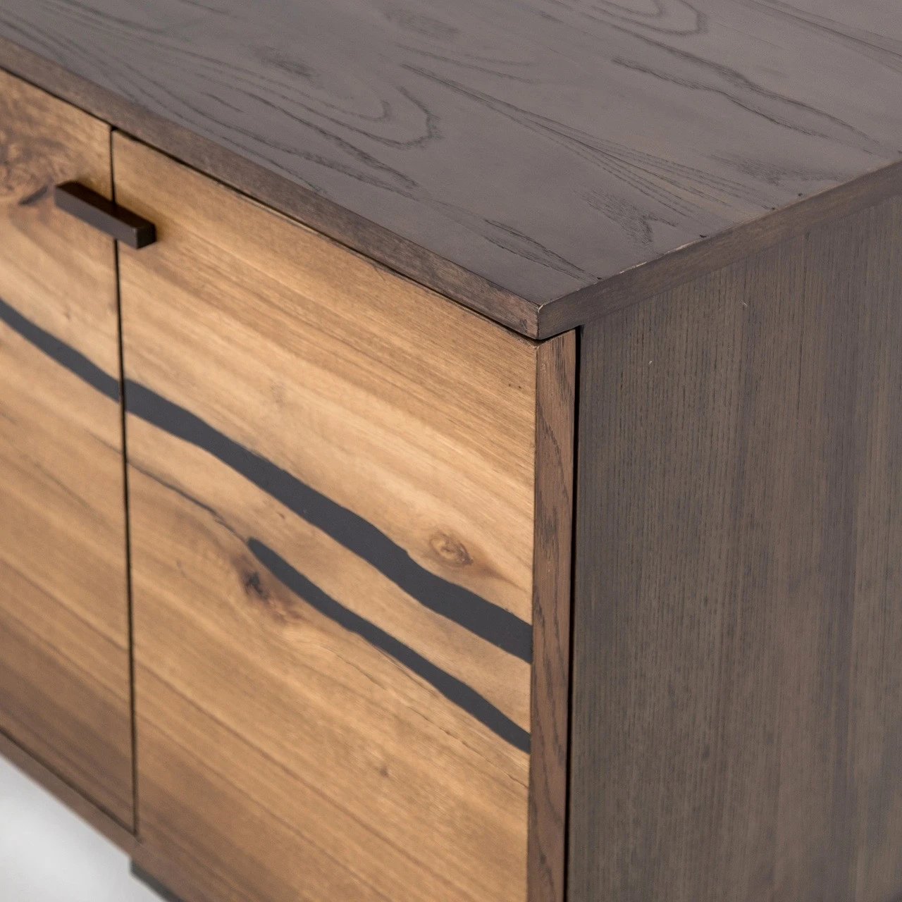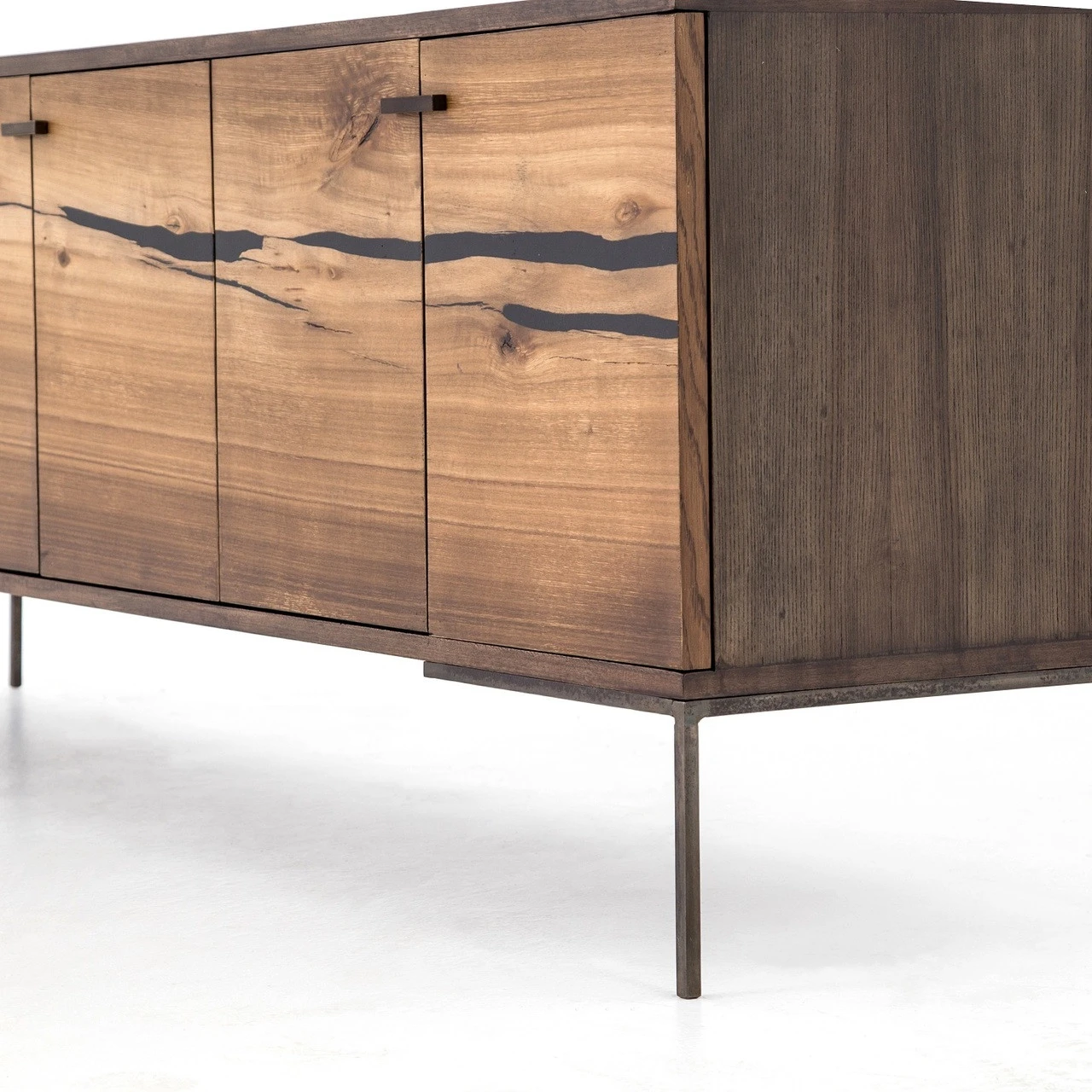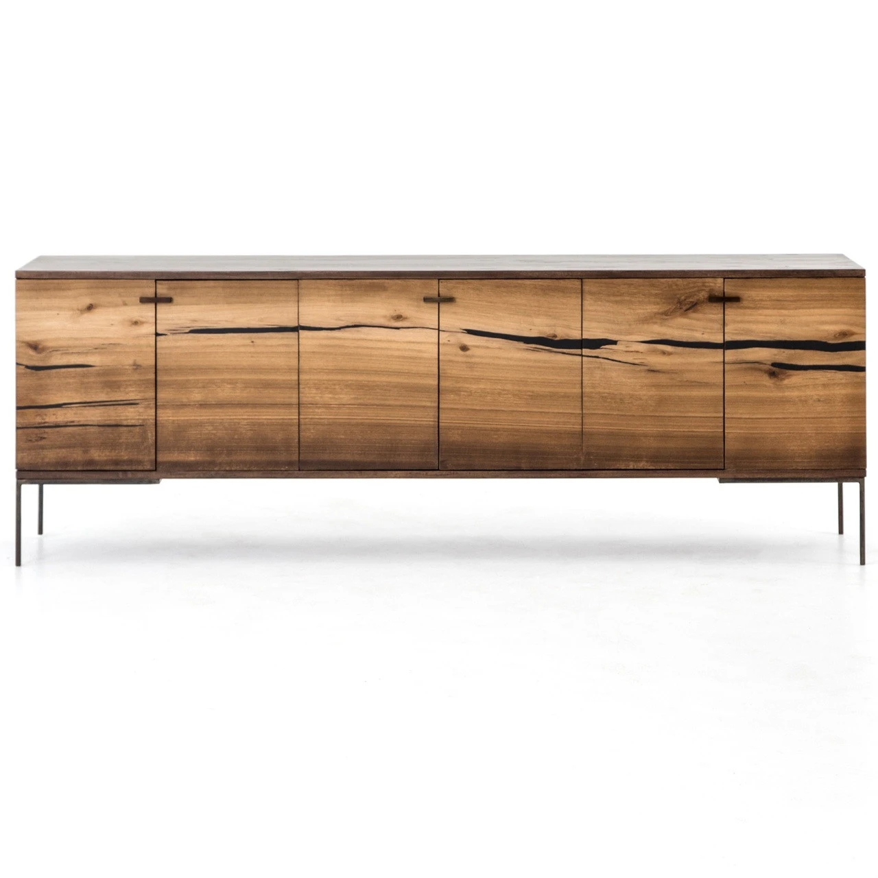 Plantation yukas deliver warmth to minimalist styling. Slender legs of bronzed iron support an ash-finished frame as resin fills yukas’ natural graining. Iron hardware adds a hint of modern edge to mid-century form. Six open-front doors offer ample storage. Given its handmade and hand-finished nature, variations and imperfections in the wood are to be expected and celebrated. Each media cabinet is an original and no two pieces are exactly alike.