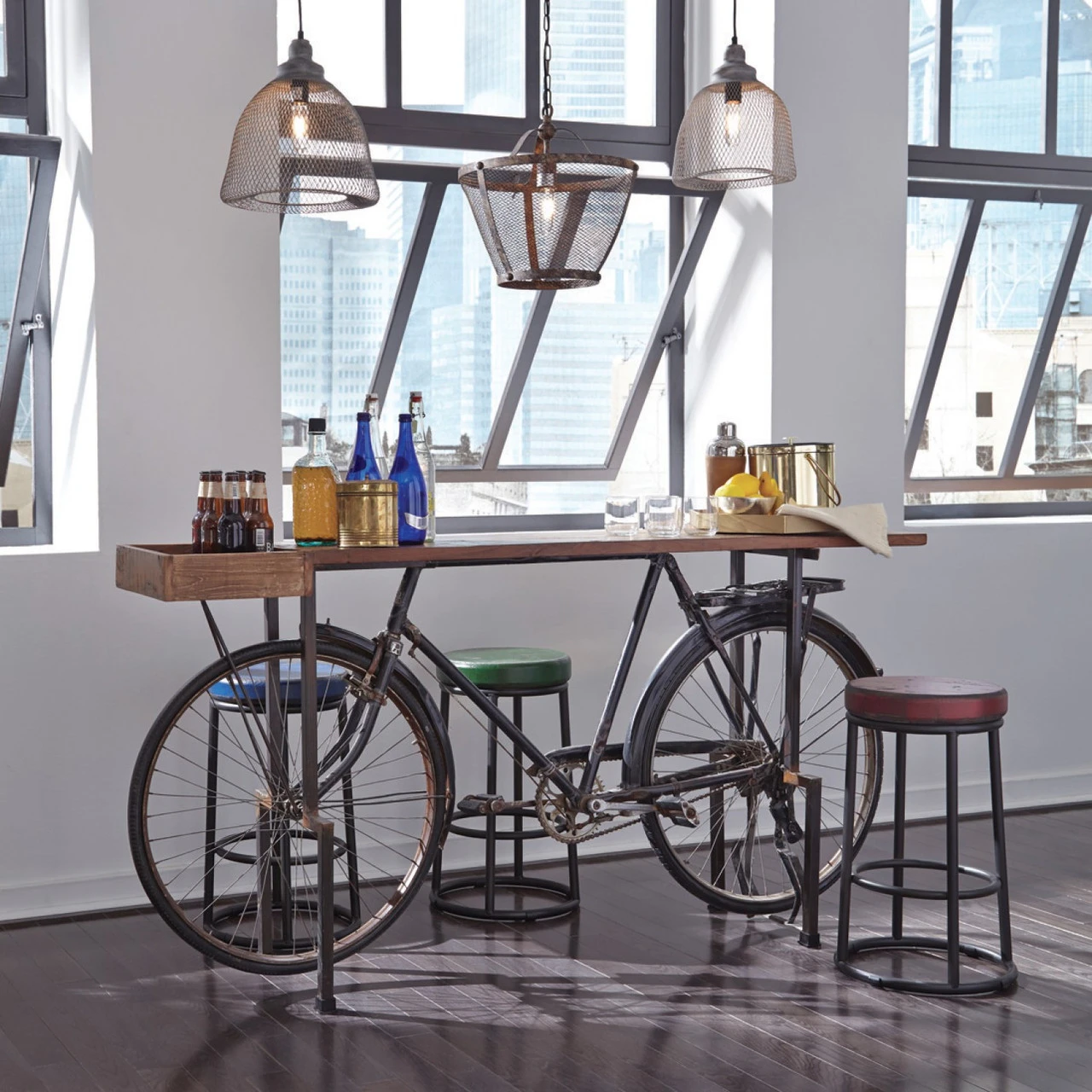 Inject fun and function into your space with this gathering table built on a bicycle frame. Using mixed reclaimed materials, this table makes a unique focal point in any room. The “bike basket” adds convenient storage for drinks, snacks, or serveware.
