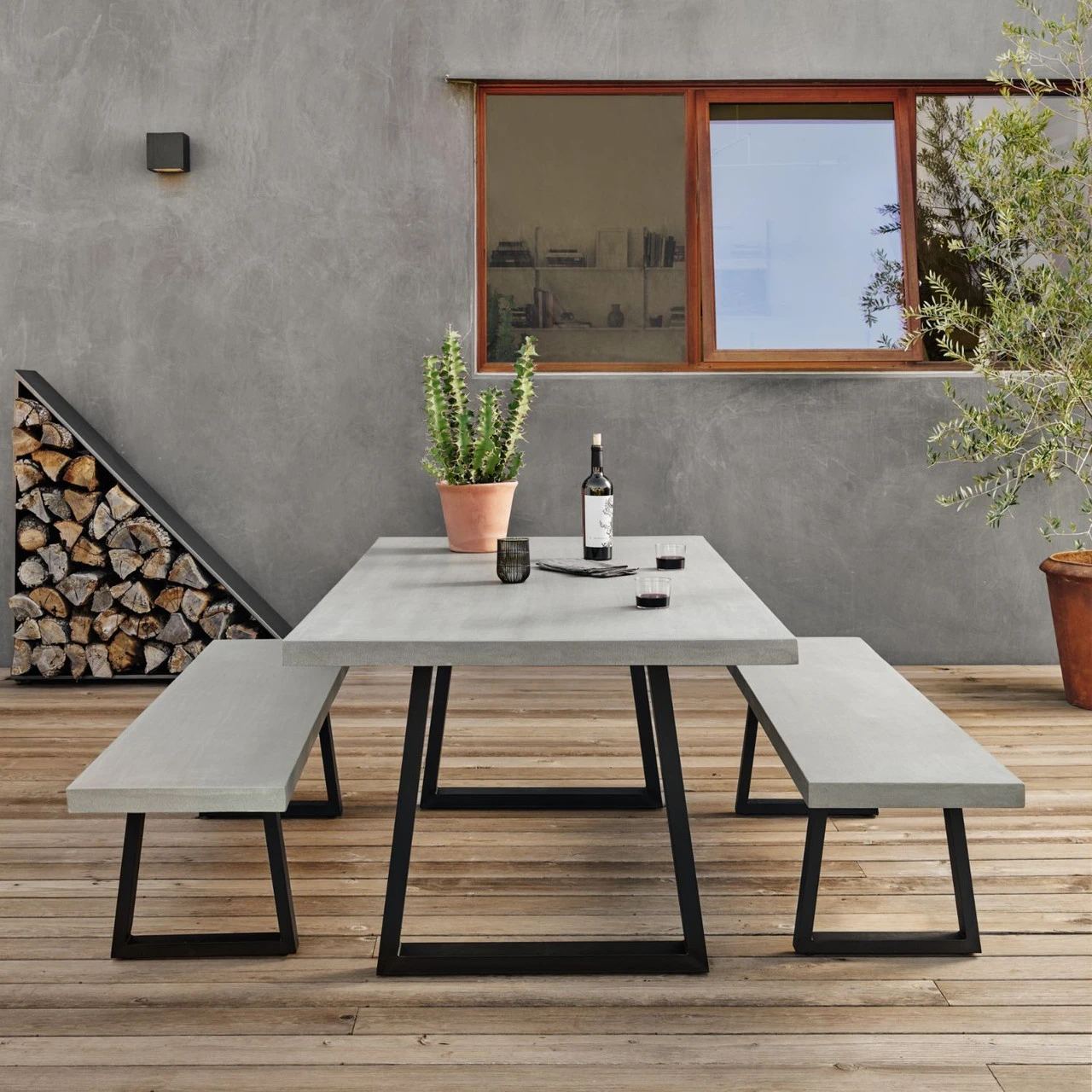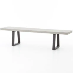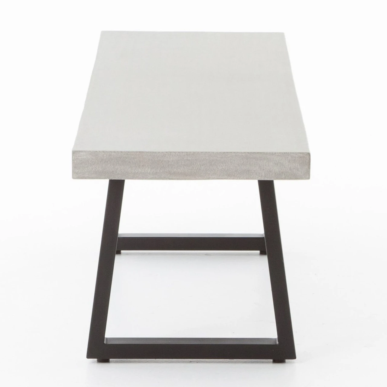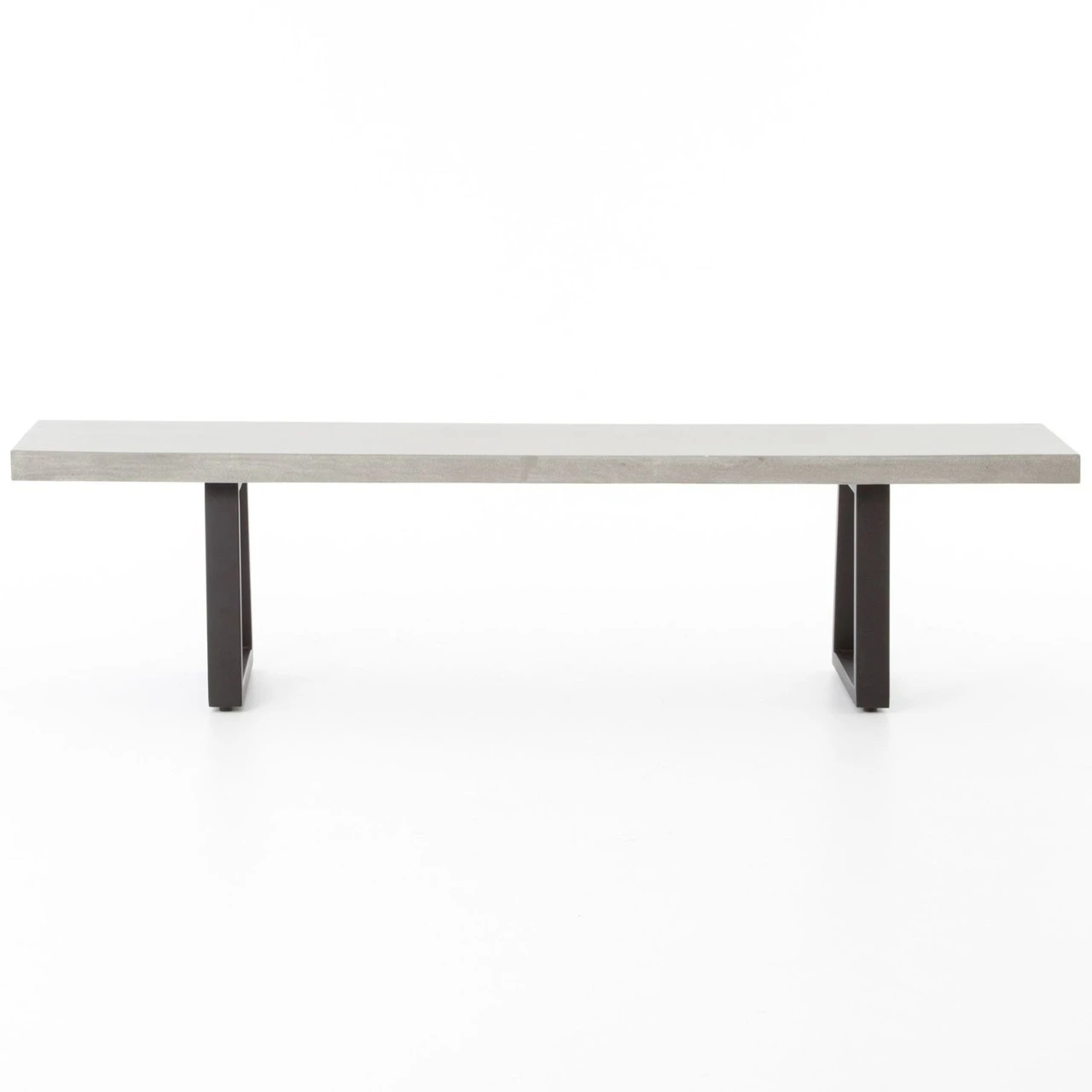 A strikingly simple poly-resin bench derived from river sand is polished to a smooth sheen. Angled, matte black iron legs add architectural appeal to bench-style seating. Great solo or paired with Cyrus Dining Table, indoors or out. Slight color variance is to be expected, and speaks to lava stone’s organic nature. Cover or store indoors during inclement weather and when not in use.