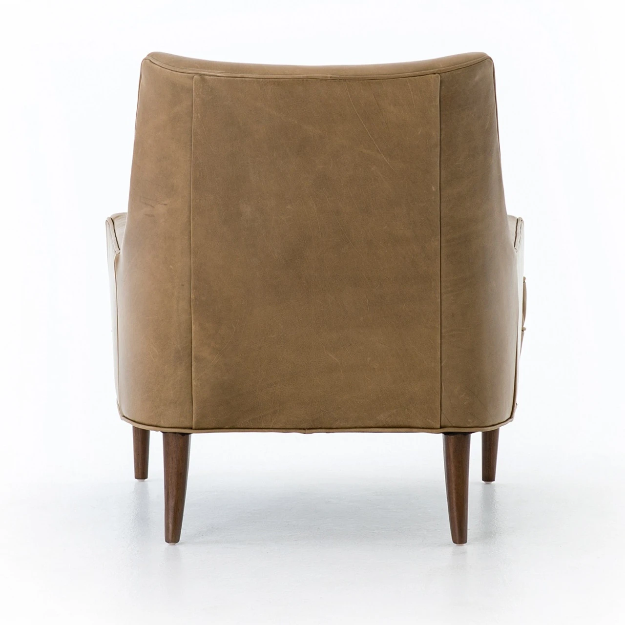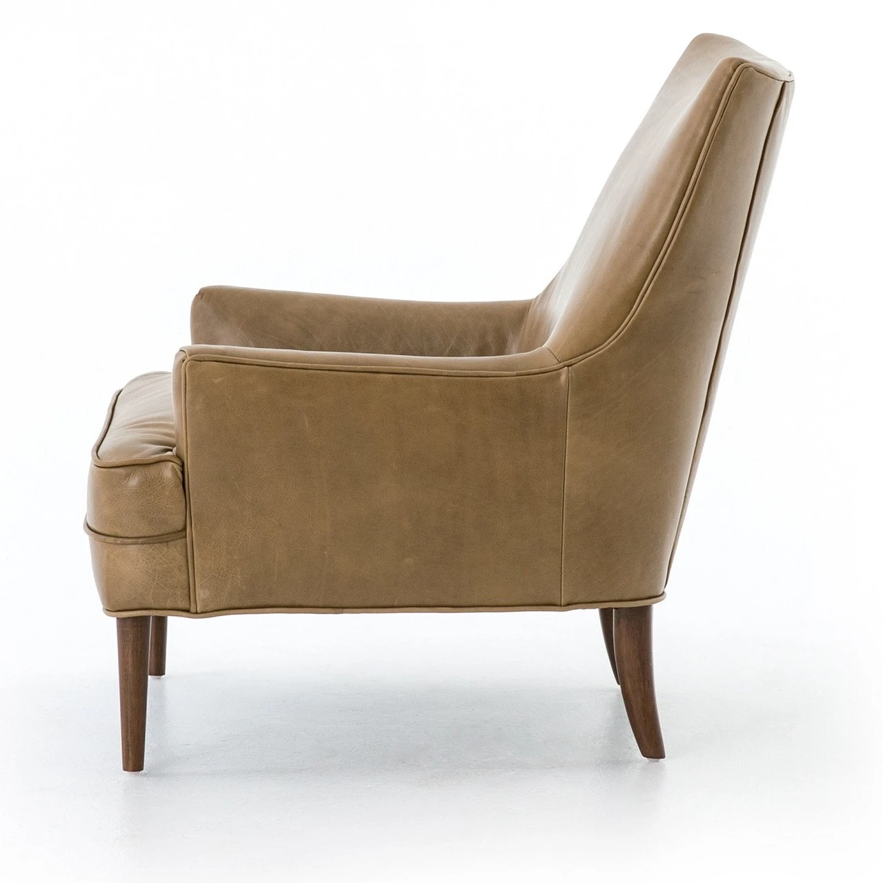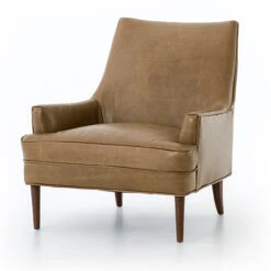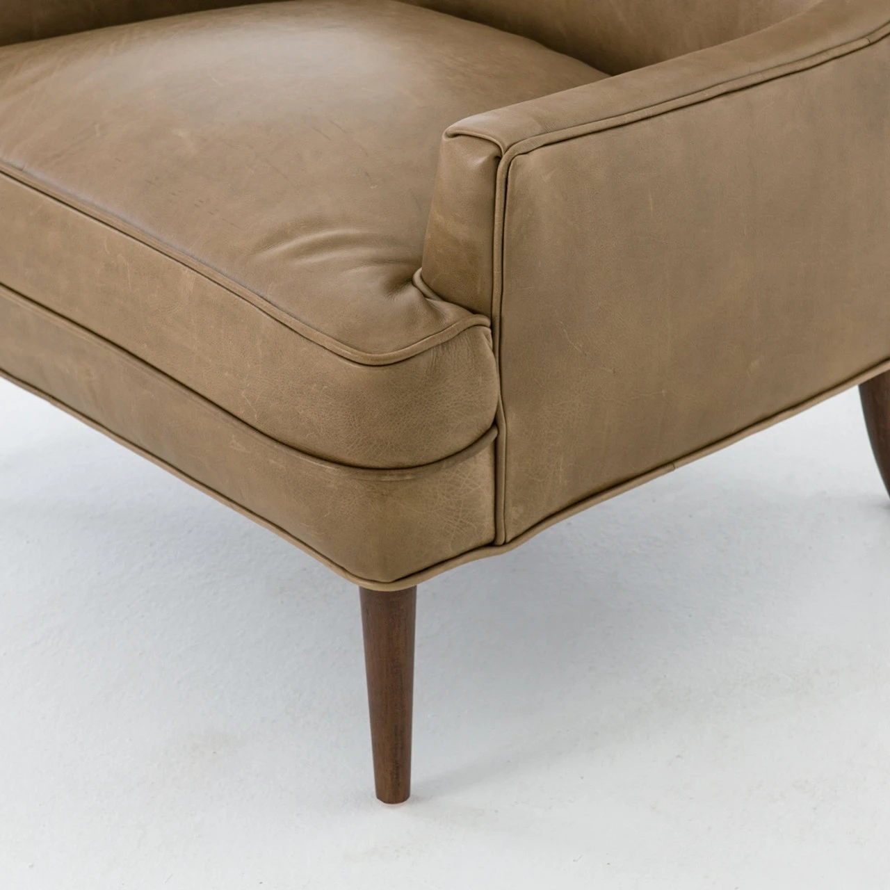 Mid-century shaping offers comfortably molded curves to the wing chair. Handpicked hides and hand-staining techniques celebrate the natural hallmarks of nature. Soft, buttery top-grain leather in rich camel pairs with classicly tapered legs. Complete your living room decor with our leather club chair!