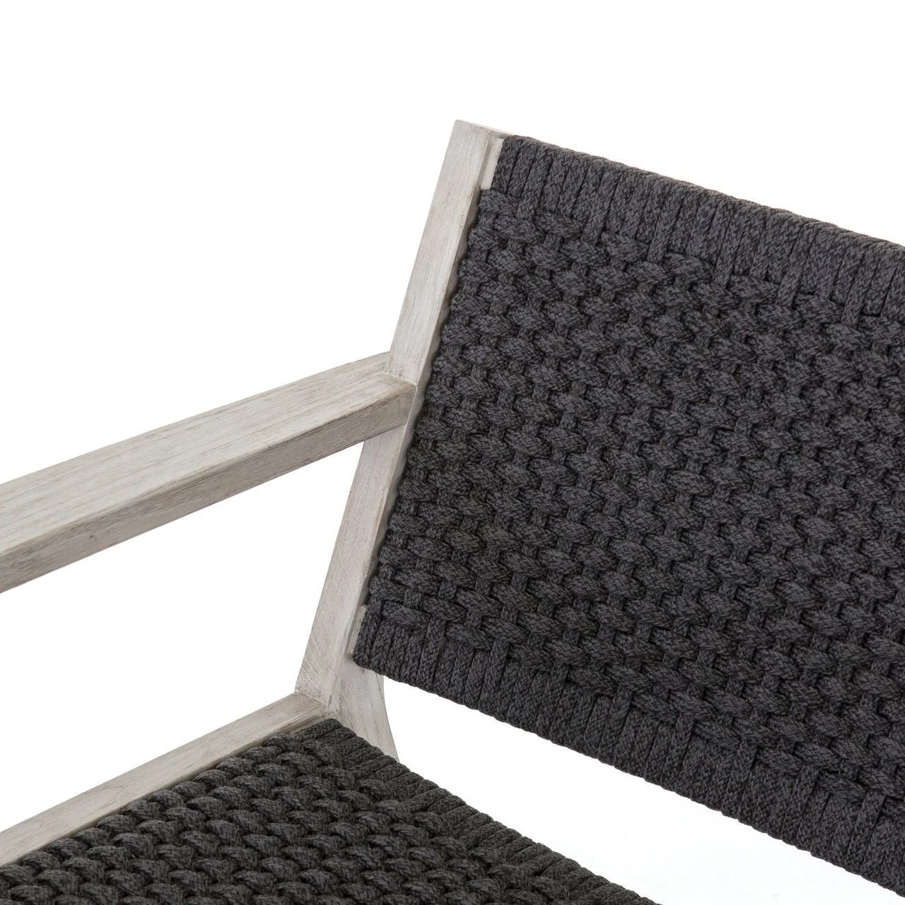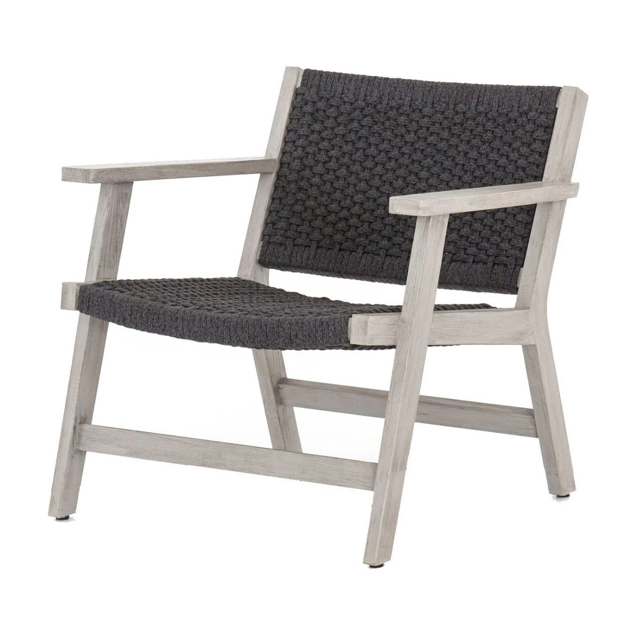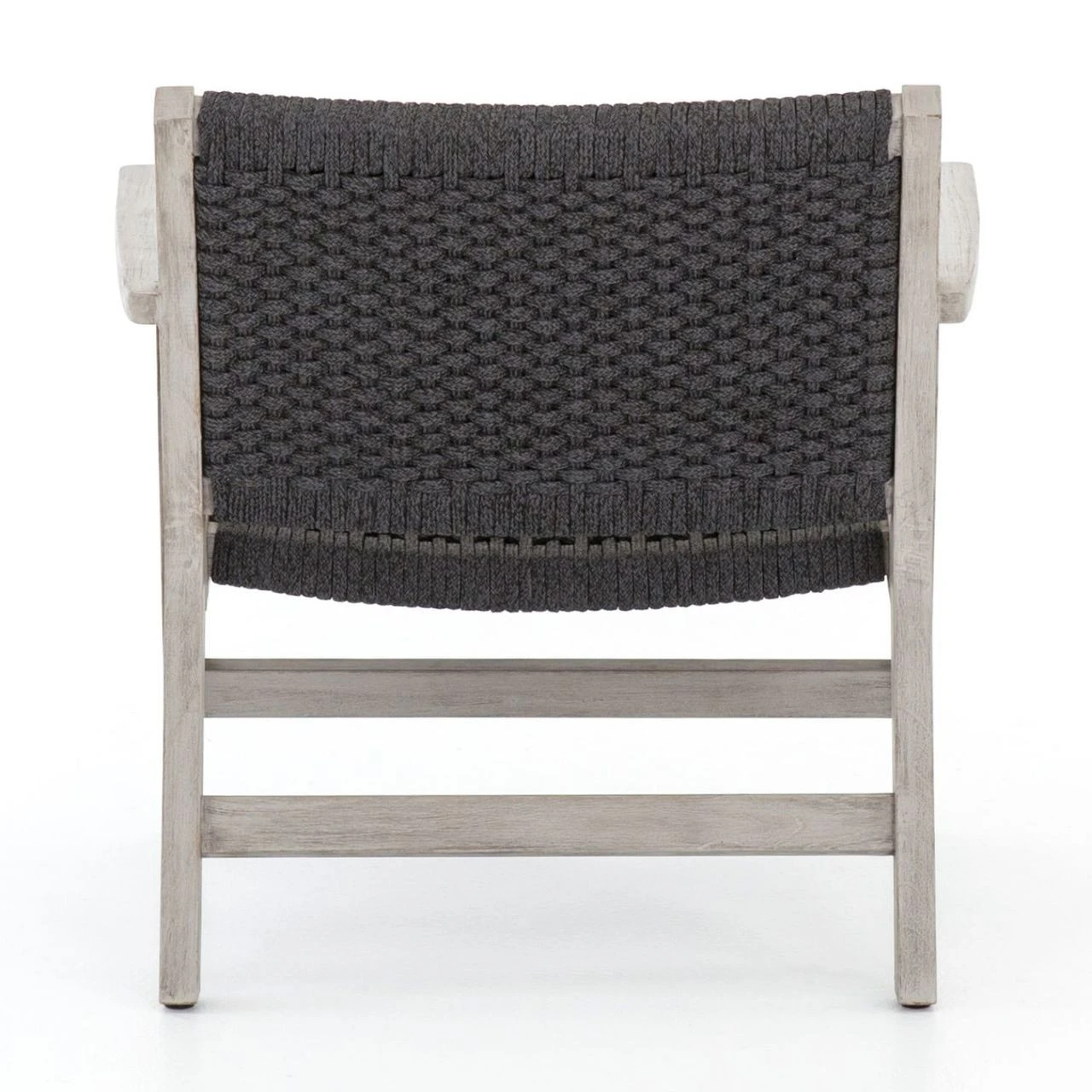 A textural take on the classic patio rope armchairs. Built from solid, Weathered Grey finished teak wood, our outdoor lounge chair lends warm, modern style to outdoor gatherings. The wide back and deep seat is wrapped with handwoven rope in an inviting dark grey color for relaxed comfort, eliminating the need for a cushion. Our Delano Grey Teak Outdoor Rope Chair is ideal for modern patios, porches and decks. Matching ottoman available.