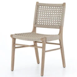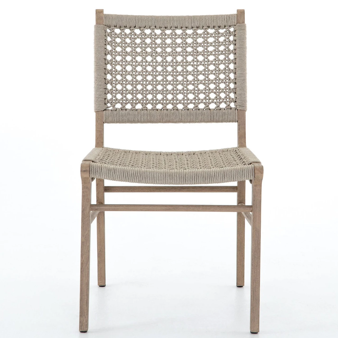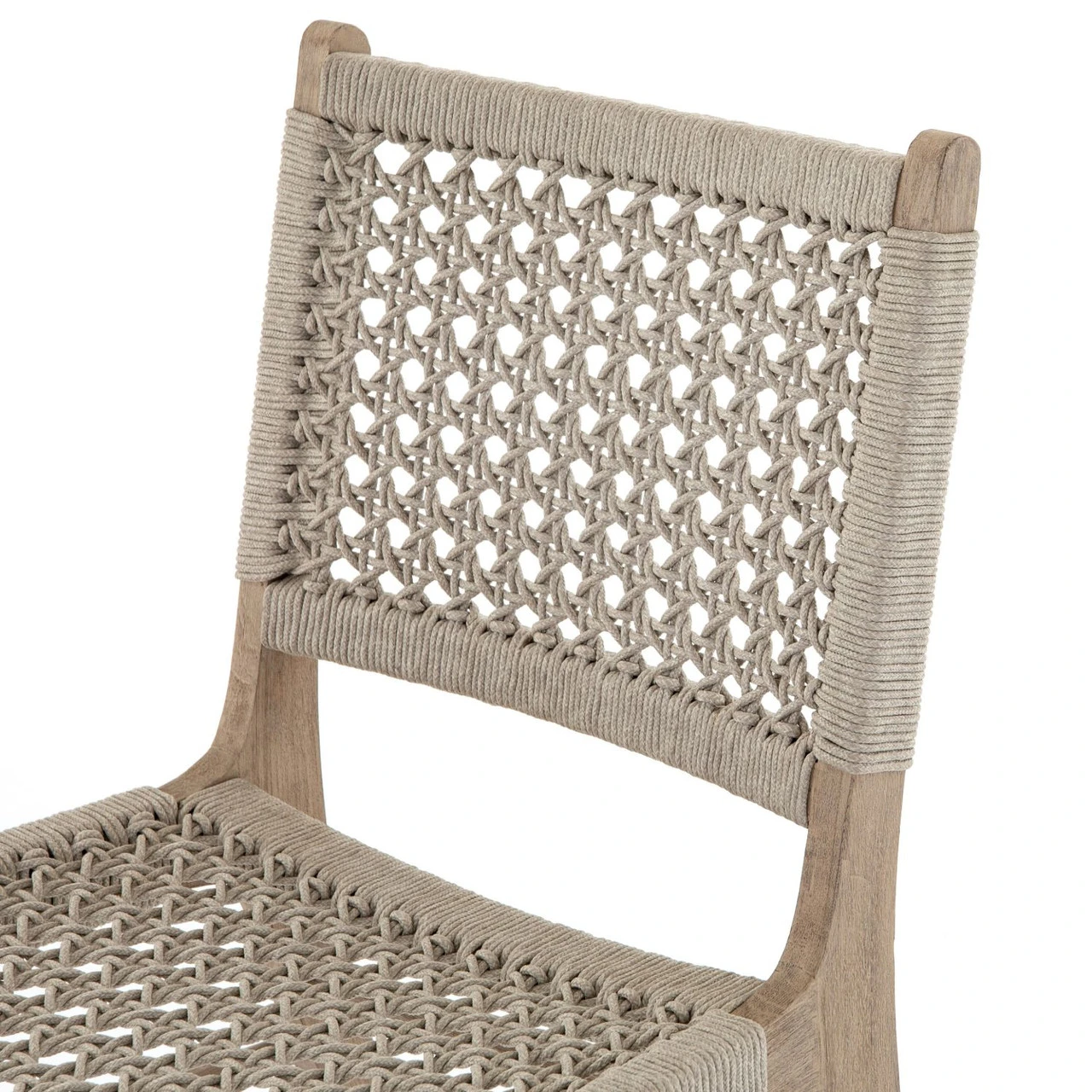 Simply stylish, indoors or out. Washed brown teak frames woven ivory rope, making a texture-driven statement. Cover or store inside during inclement weather and when not in use.