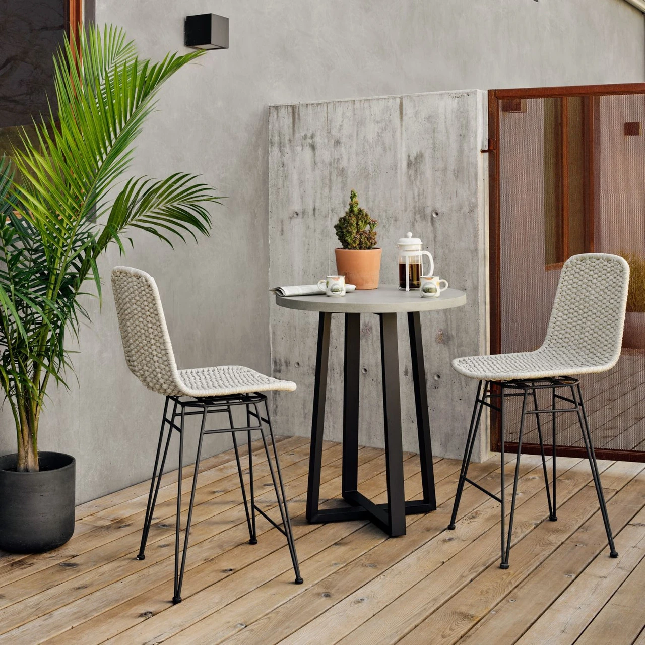 Armless rope seating weaves for fresh texture, with charcoal hairpin legs and a swivel for a fashion-forward touch. Cover or store indoors during inclement weather and when not in use.
