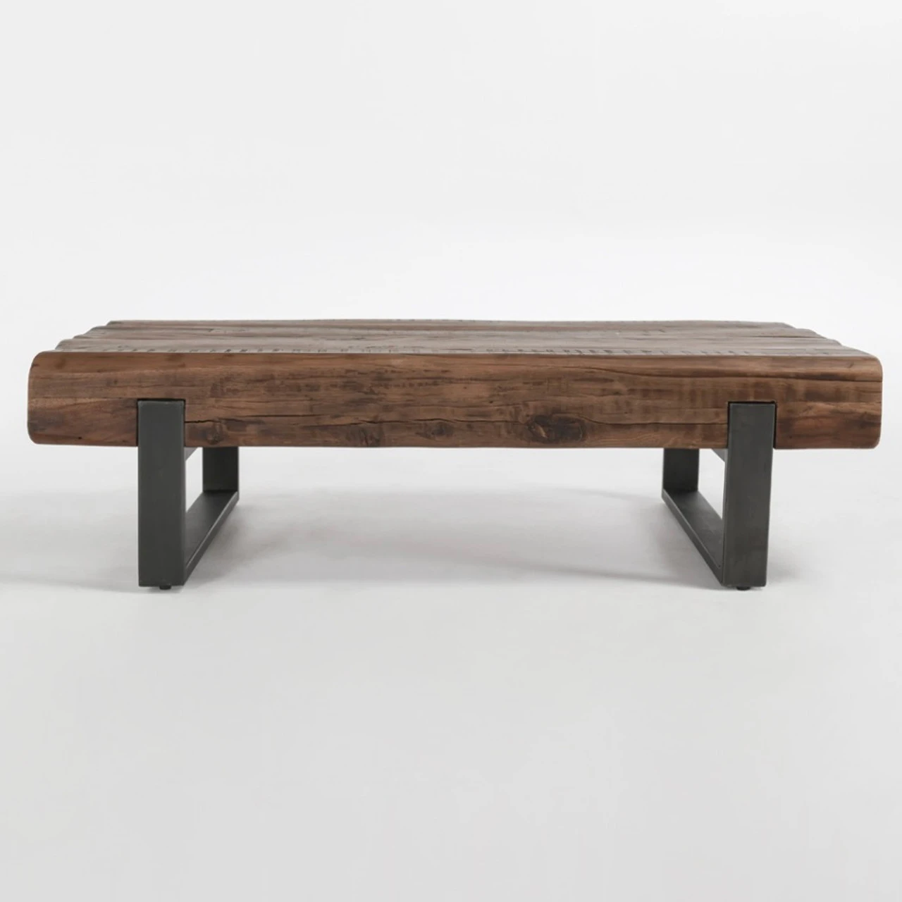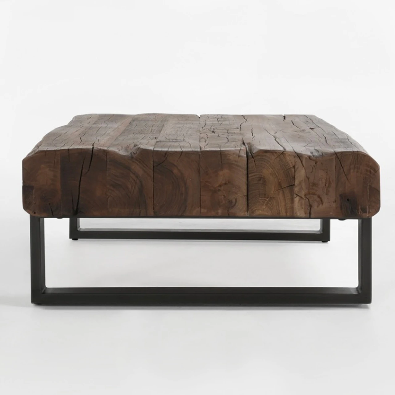 Reclaimed materials bring distinctive energy to any space when crafted into a sophisticated piece such as this coffee table. Thick beams of wood lend rugged texture within the angular metal frame. Pair with matching pieces for a cohesive effect.