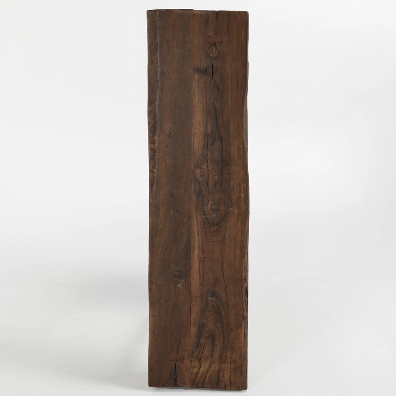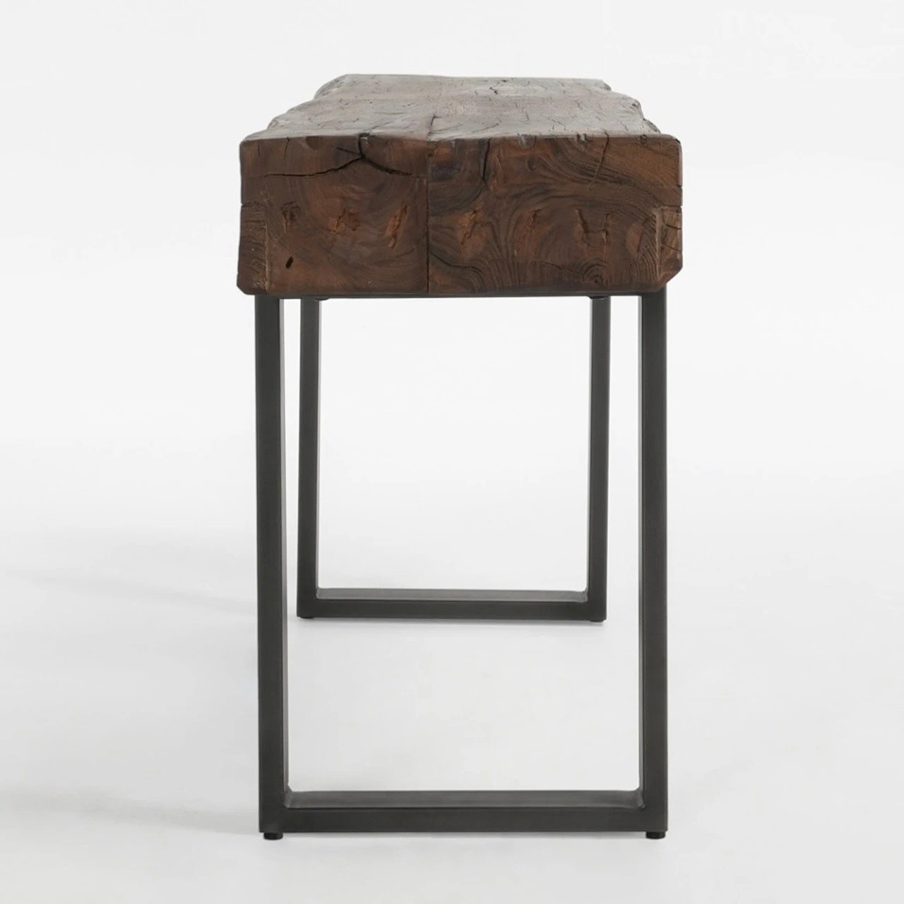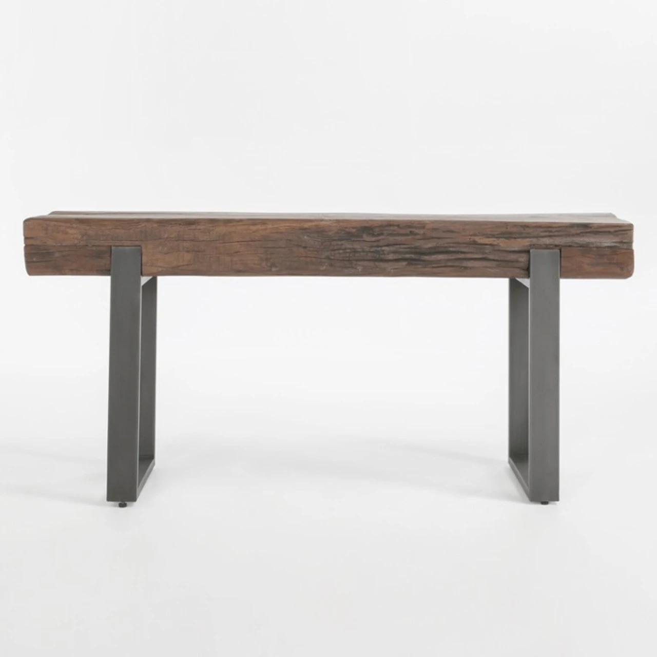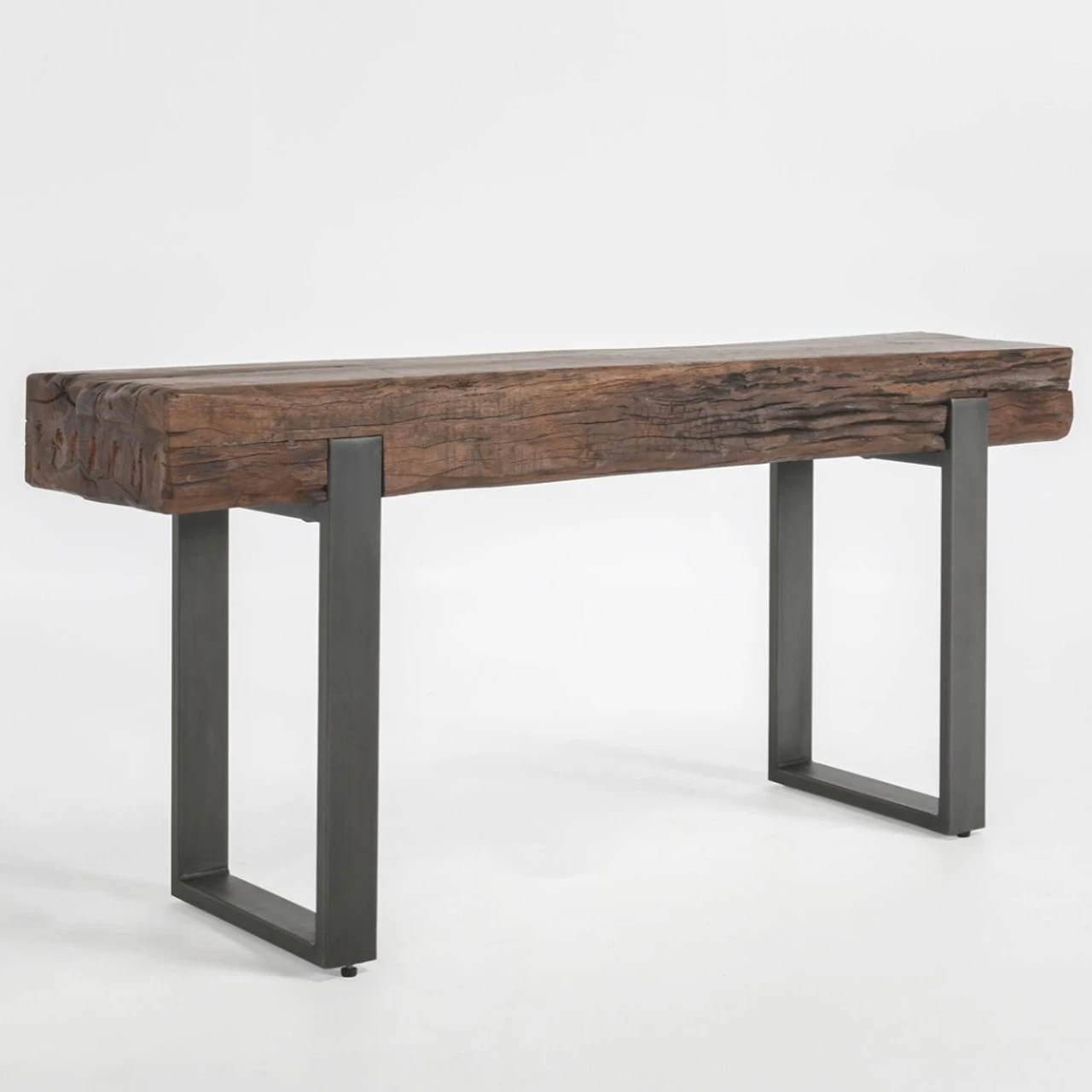Reclaimed materials bring distinctive energy to any space when crafted into a sophisticated piece such as this console table. Thick beams of wood lend rugged texture within the angular metal frame. Pair with matching pieces for a cohesive effect.