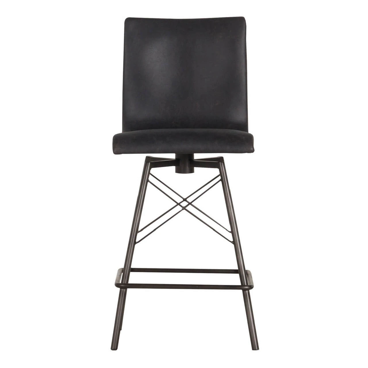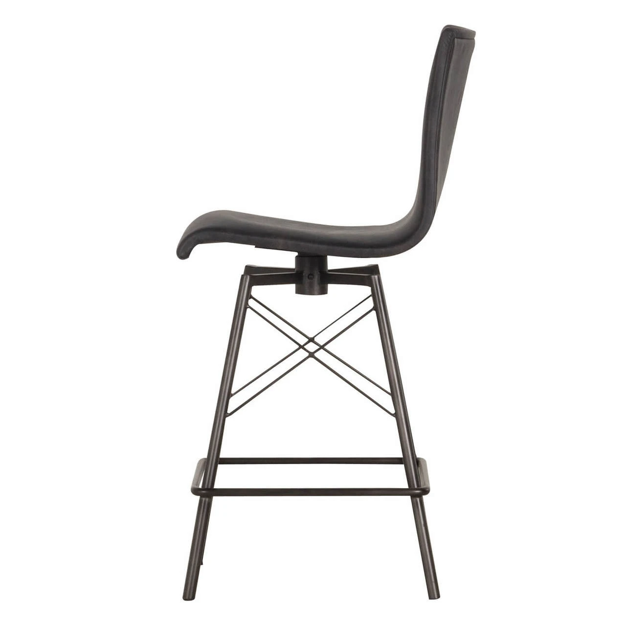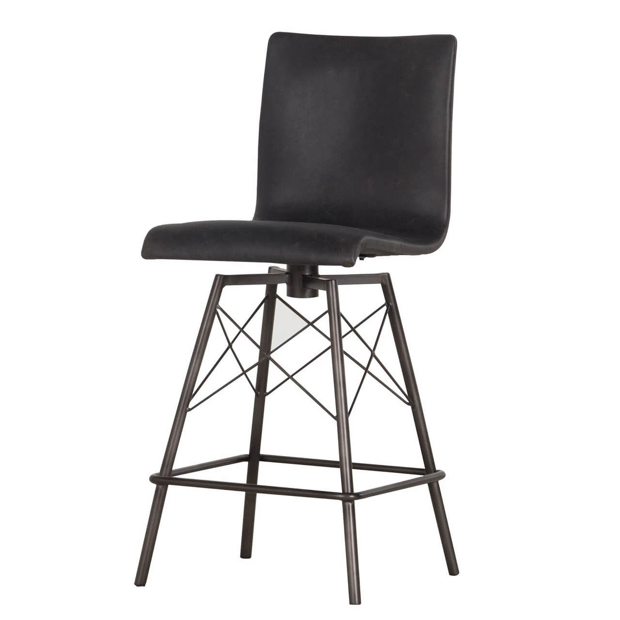 Mid-century styling brings beauty to the bar or breakfast nook. Modern S-curves in distressed black leather swivel 360 degrees above an architectural, black-waxed iron base.