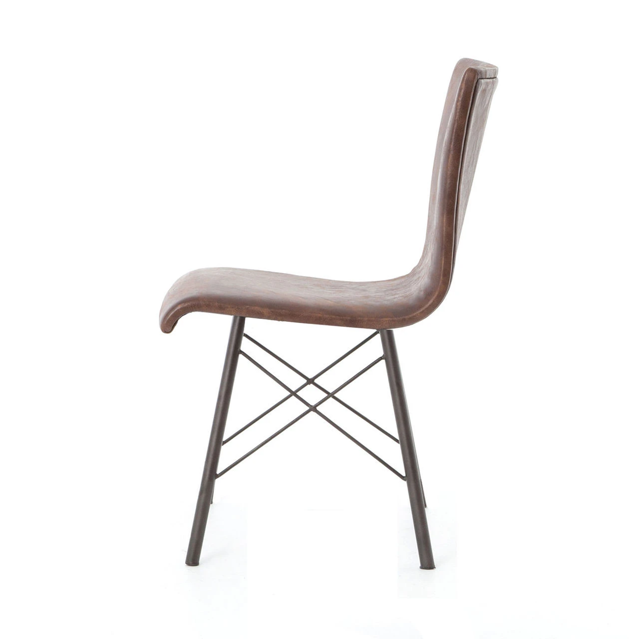 Mid-century modern and industrial chic bring beauty to the table. Modern S-curved chair seat upholstered in distressed brown leather mounted on an architectural, black-waxed finished iron base. Complete your dining room desing with our