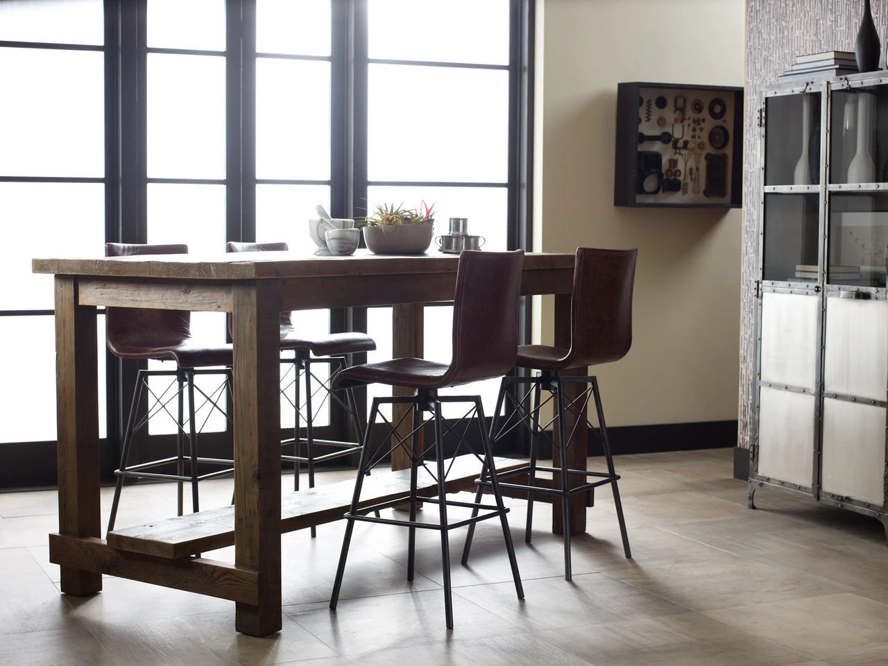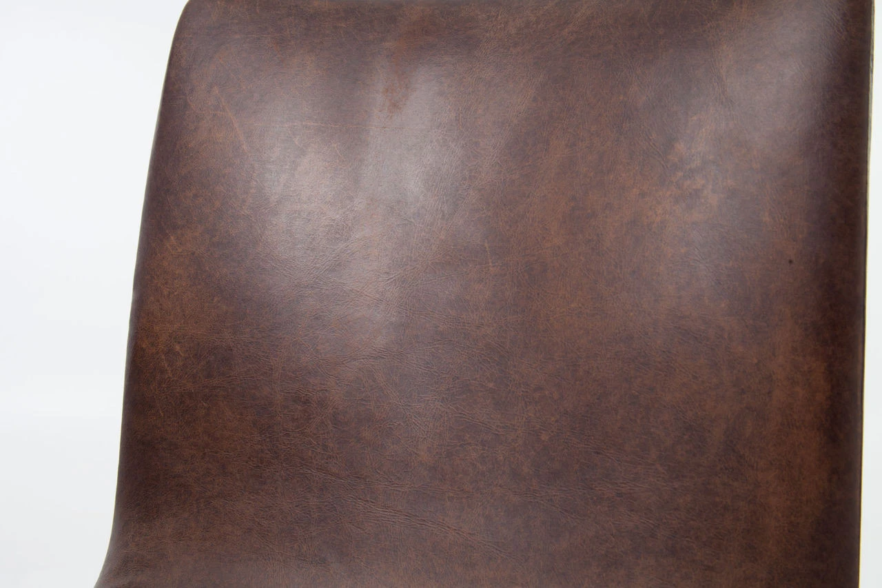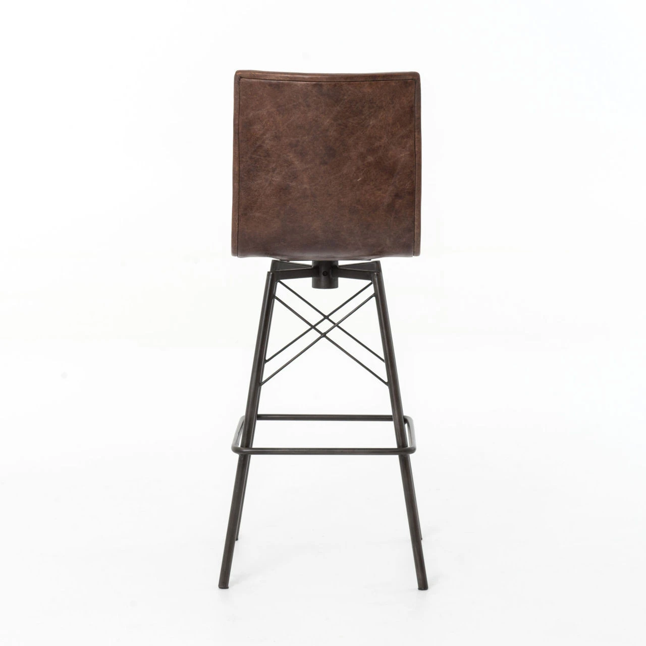 Mid-century modern and industrial chic bring beauty to the table. Modern S-curved chair seat upholstered in distressed havana finished leather, mounted on an architectural shaped swivel iron base with a black-waxed finish. Complete your dining room or kitchen design with our Diaw Distressed Leather Swivel Barstool.