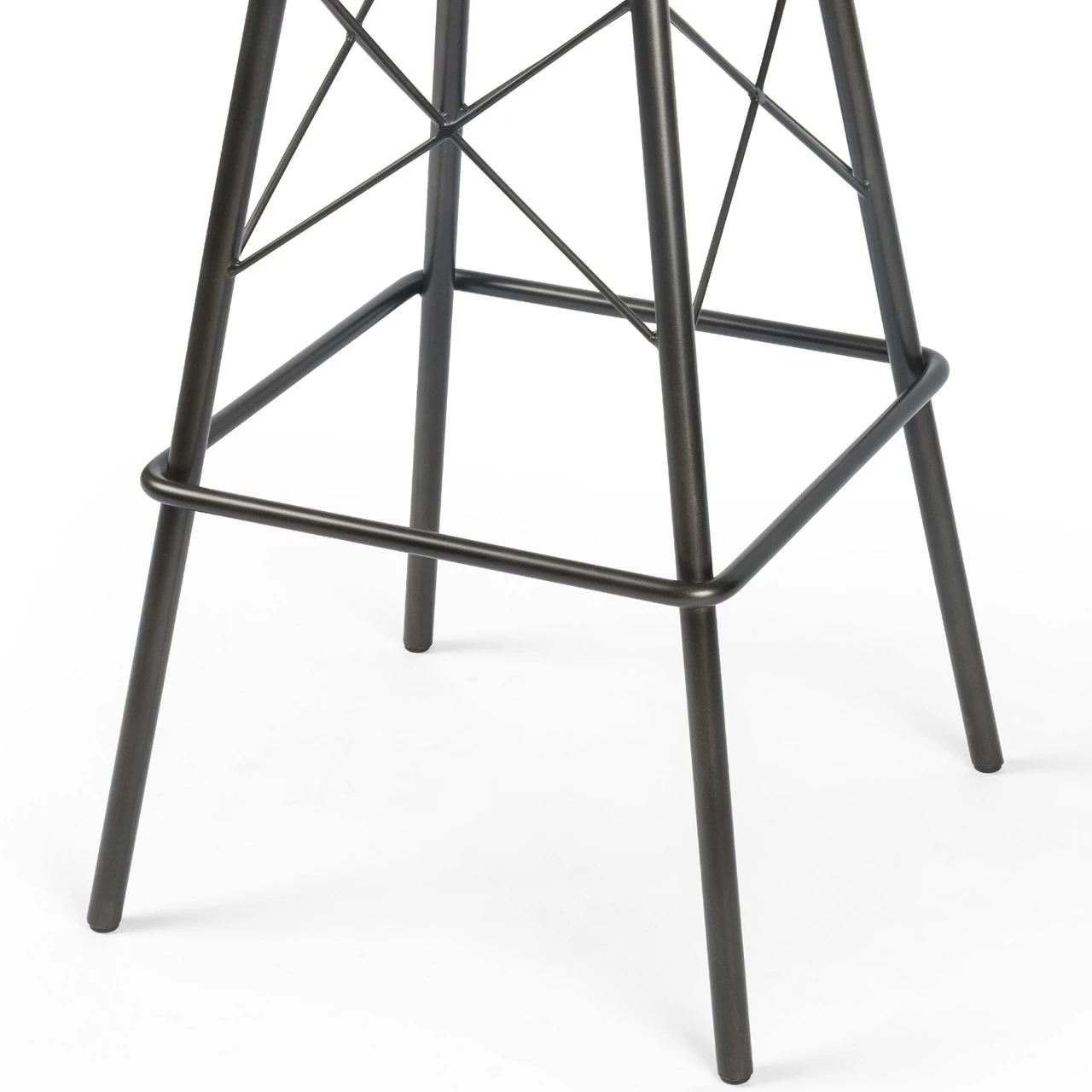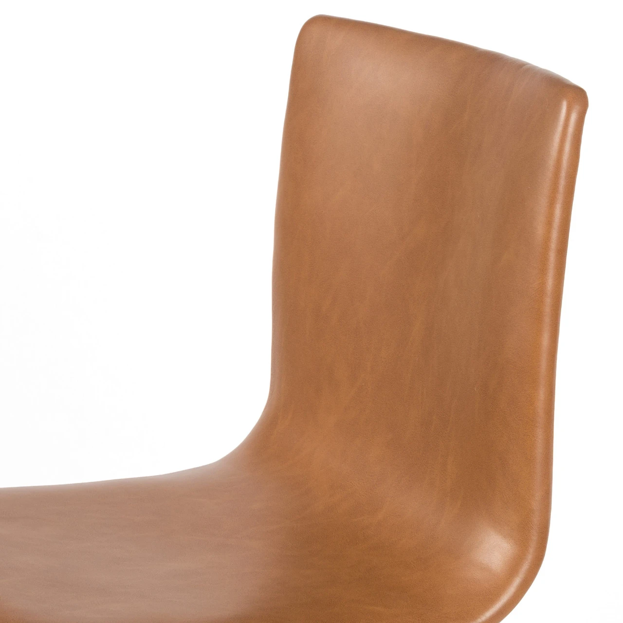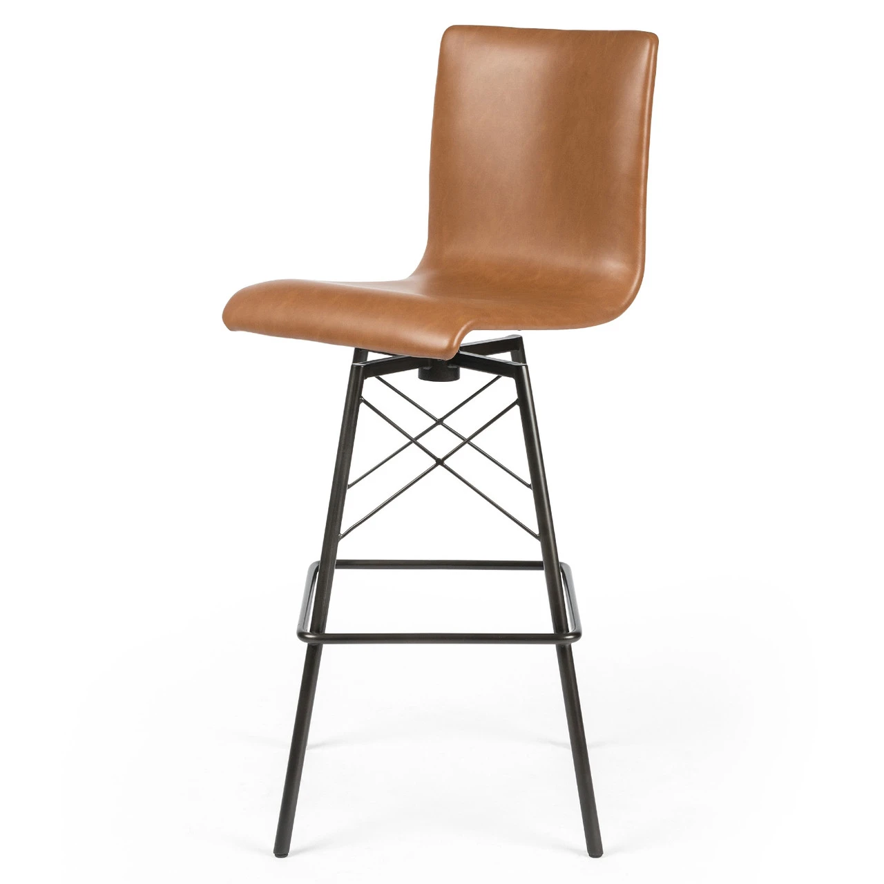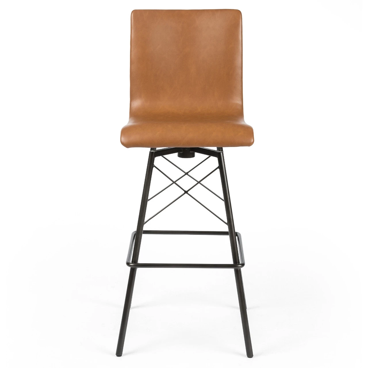Mid-century styling brings beauty to the bar. Modern S-curves in distressed faux leather swivel 360 degrees above an architectural, black-waxed iron base.