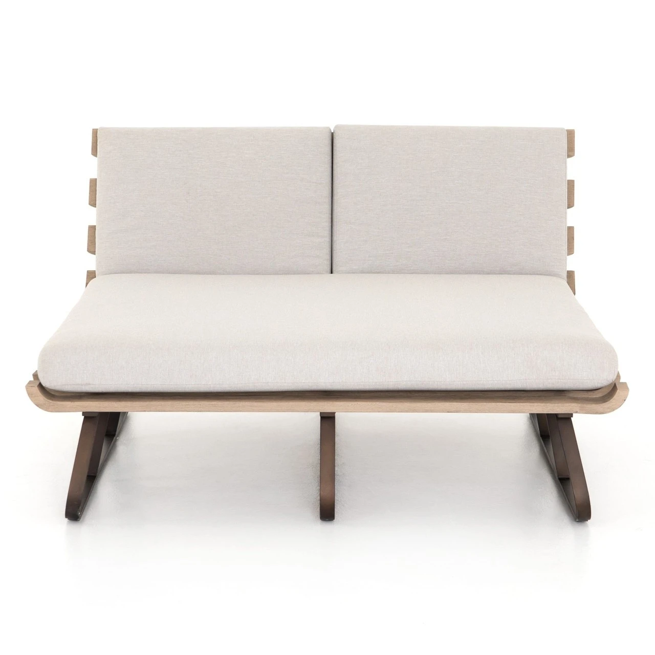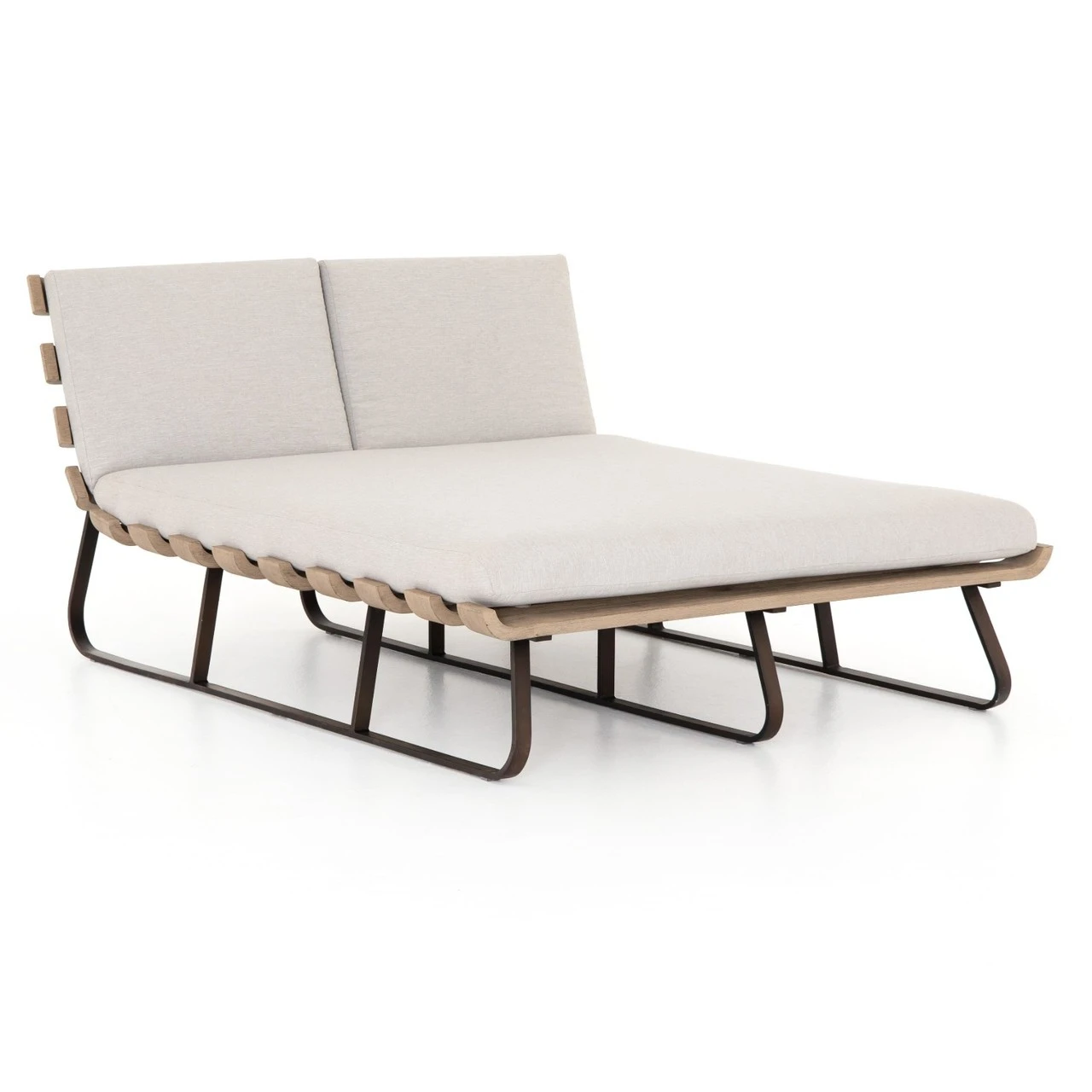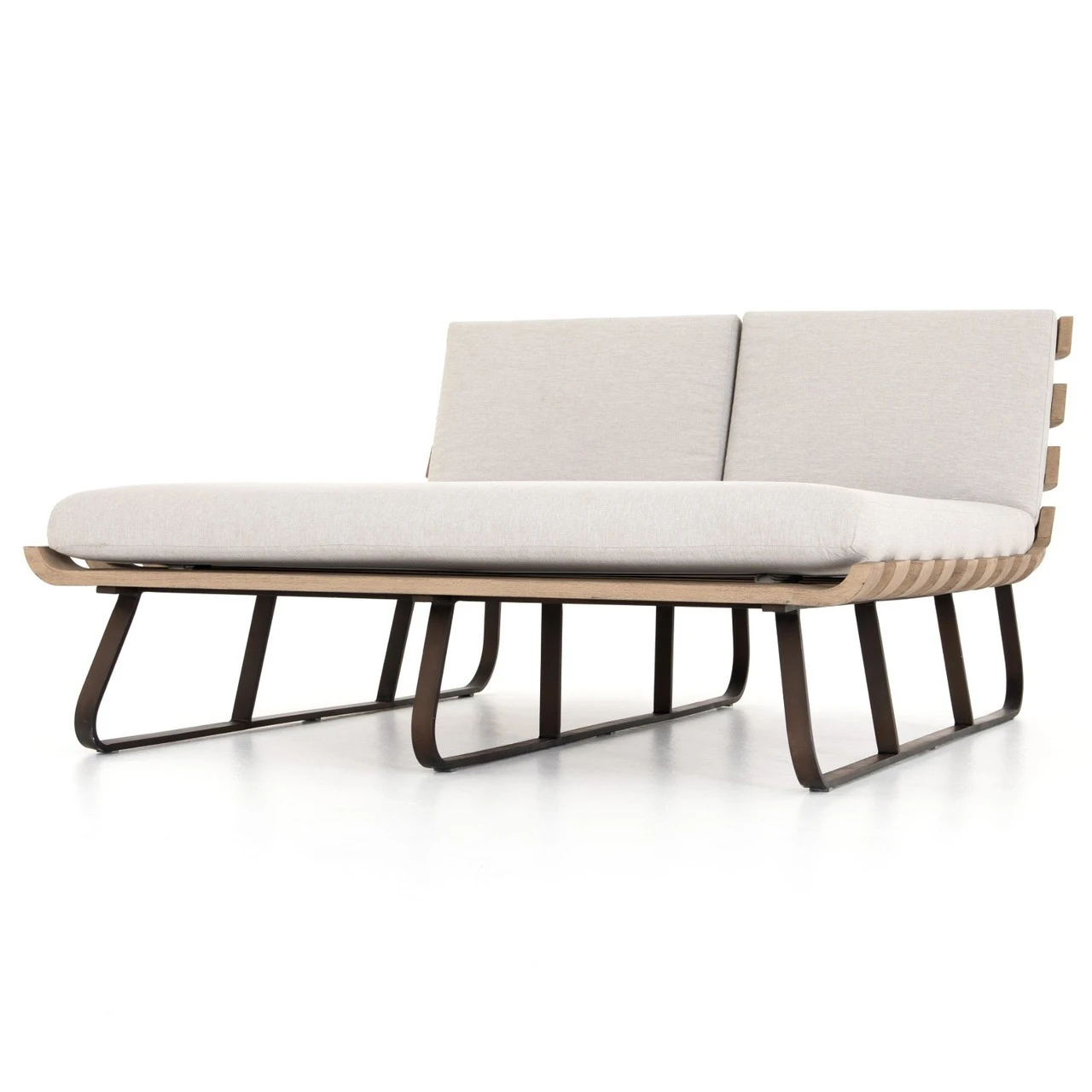 Crafted of washed brown finished teak wood frame, metal legs, curved and cushioned with UV-resistant and water-repellent weather-friendly stone grey color olefin fabric, this retro modern inspired armless outdoor double daybed lounger brings style and comfort to porches, decks and outdoor areas. This double chaise daybed is perfect for cuddling or laying out in pairs.