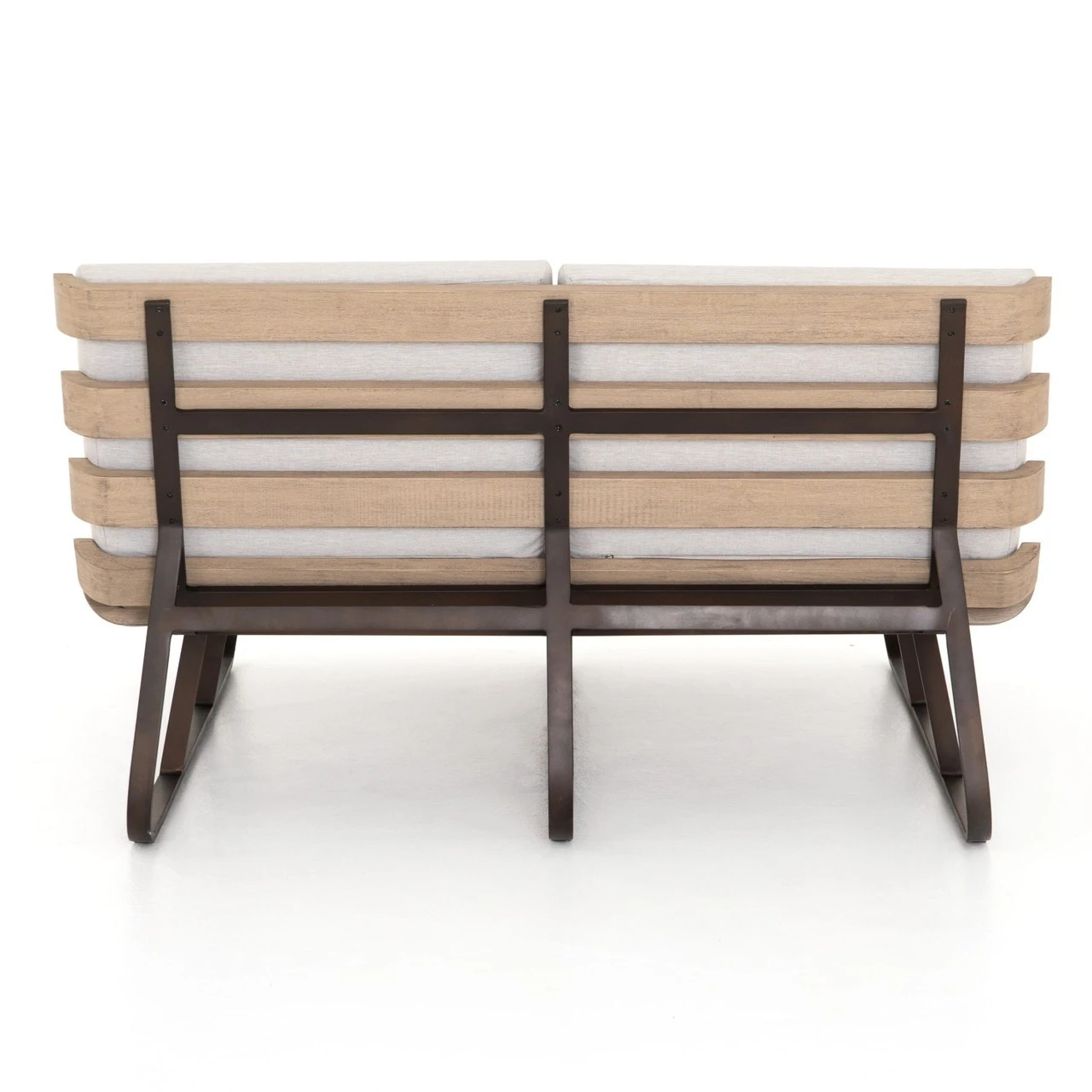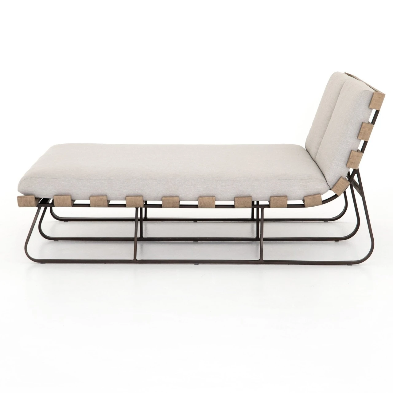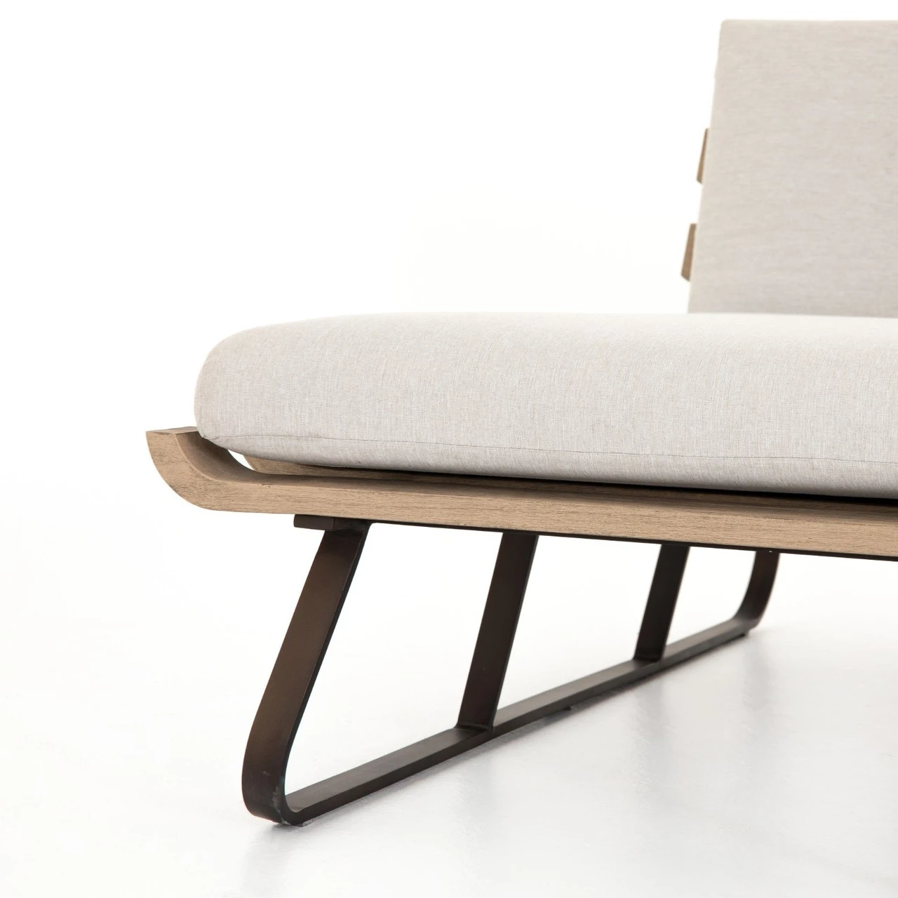 Crafted of washed brown finished teak wood frame, metal legs, curved and cushioned with UV-resistant and water-repellent weather-friendly stone grey color olefin fabric, this retro modern inspired armless outdoor double daybed lounger brings style and comfort to porches, decks and outdoor areas. This double chaise daybed is perfect for cuddling or laying out in pairs.