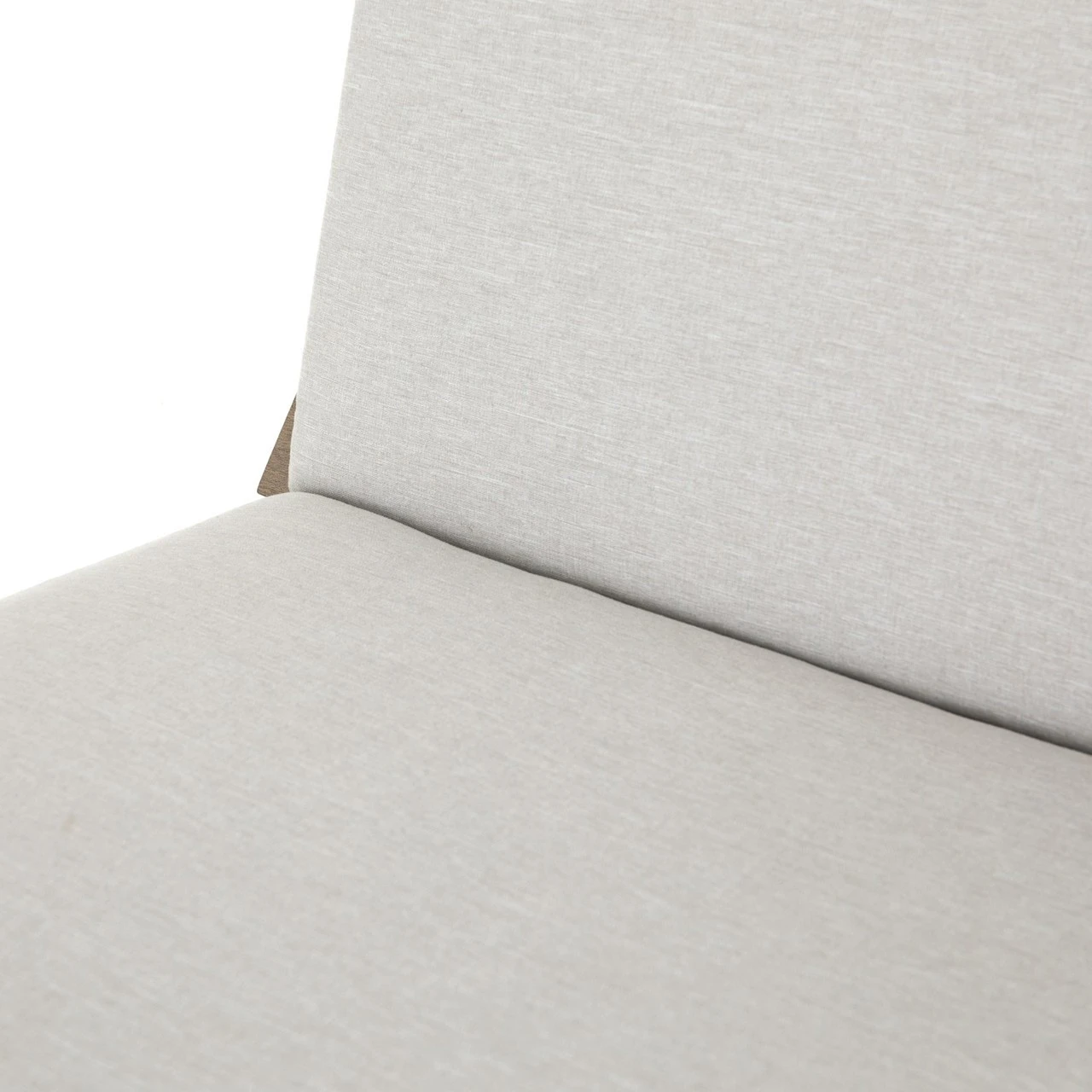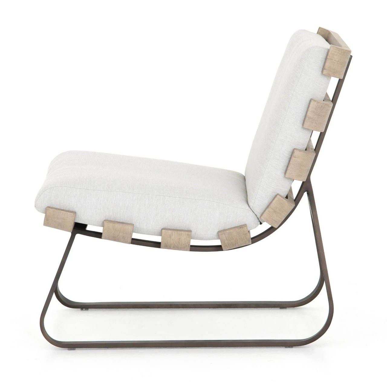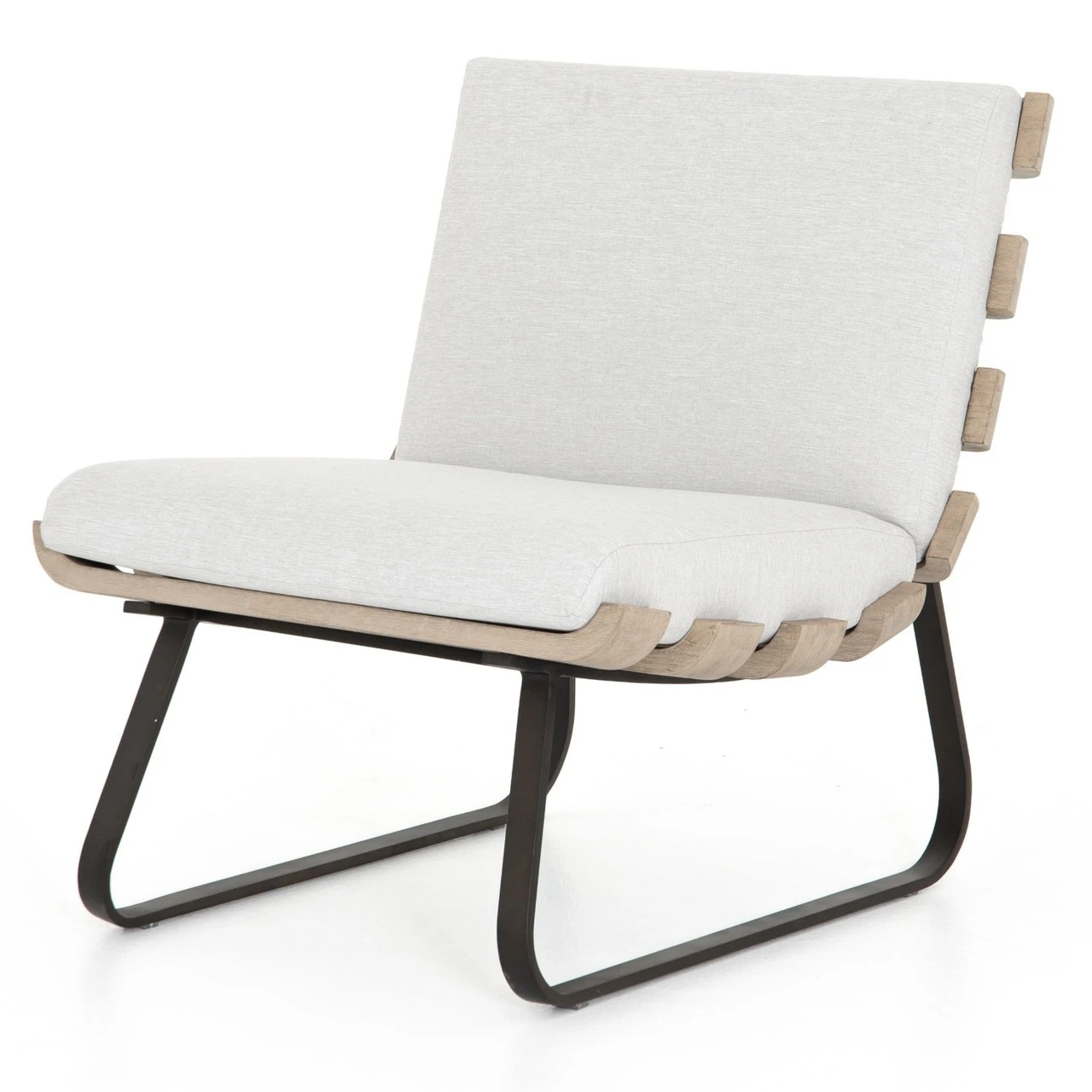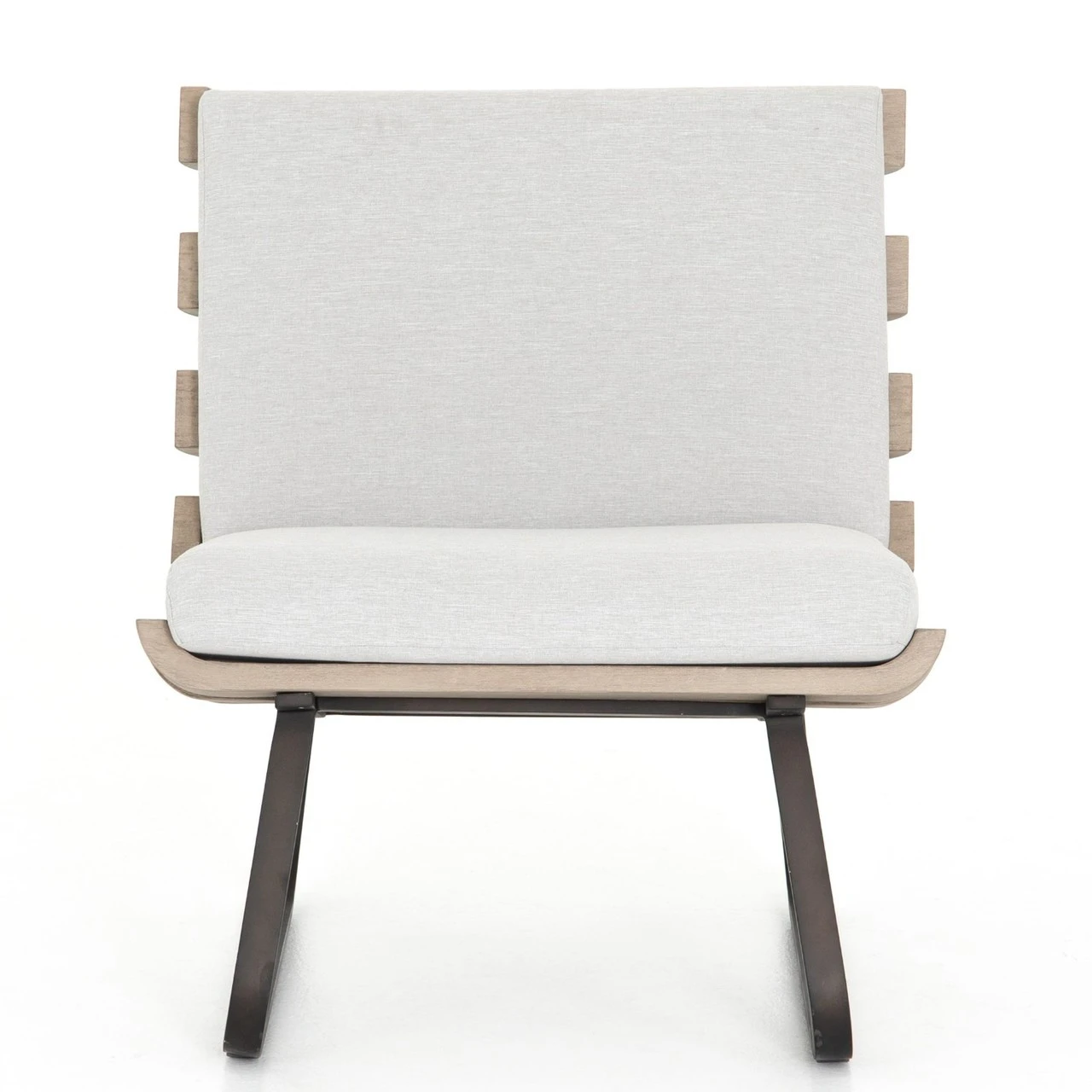 Crafted of washed Brown teak wood frame, metal legs, curved and cushioned with UV-resistant and water-repellent weather-friendly stone grey color olefin fabric, this retro modern inspired armless outdoor lounge chair brings style and comfort to porches, decks and outdoor areas.
