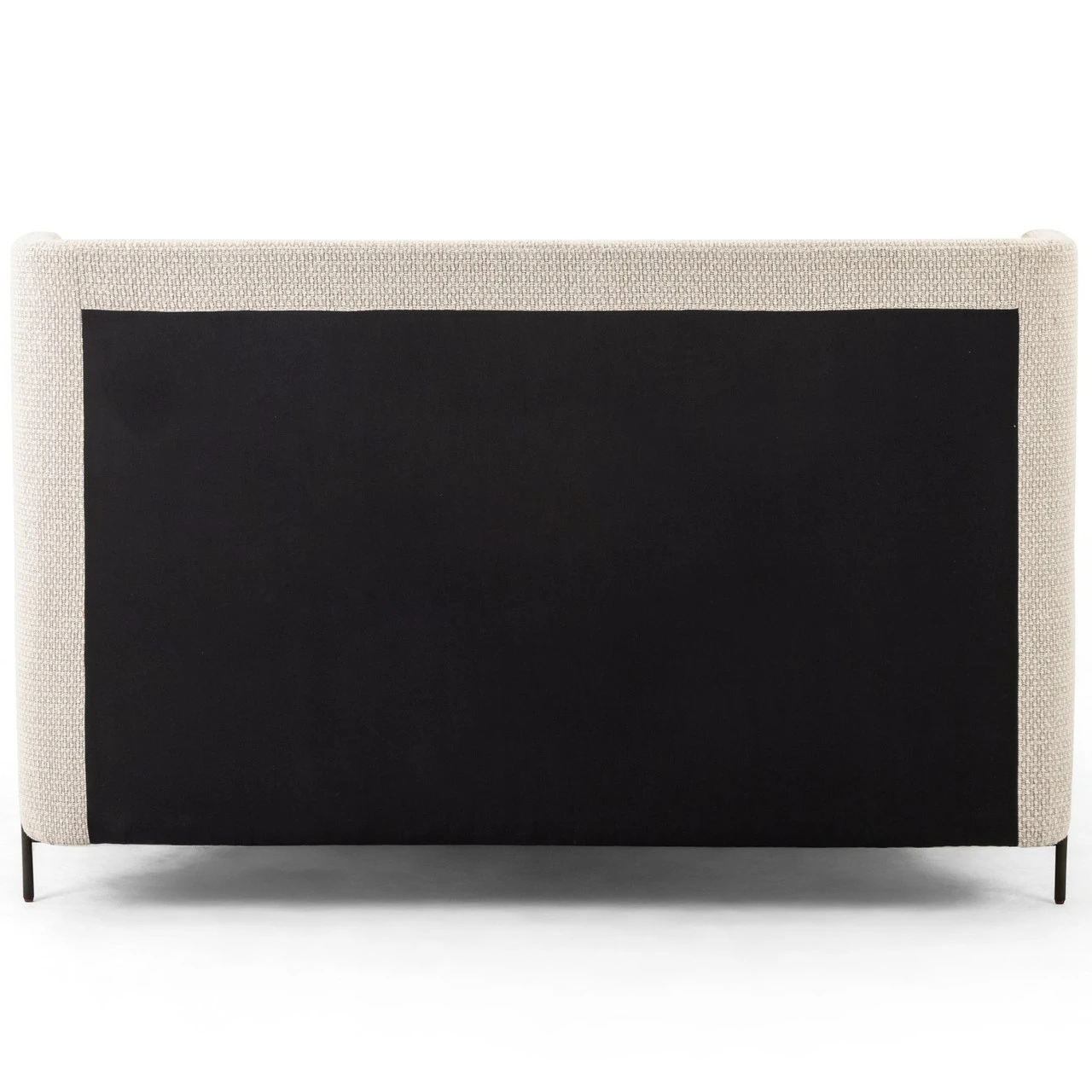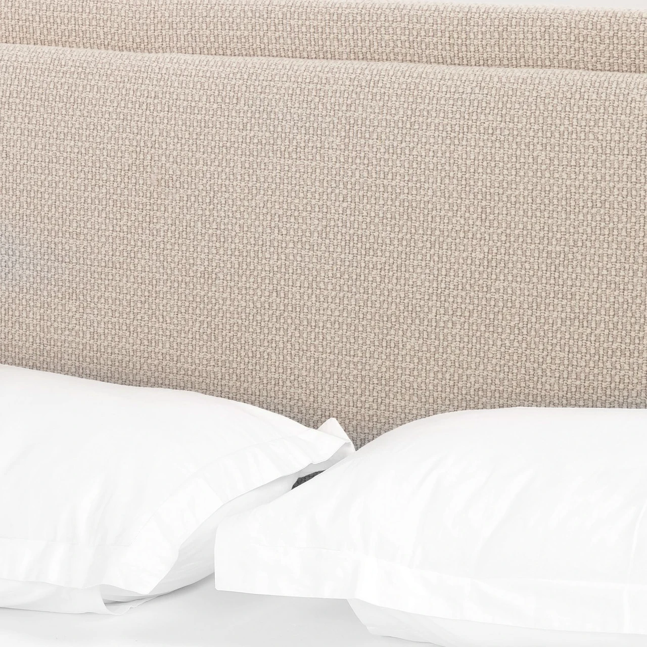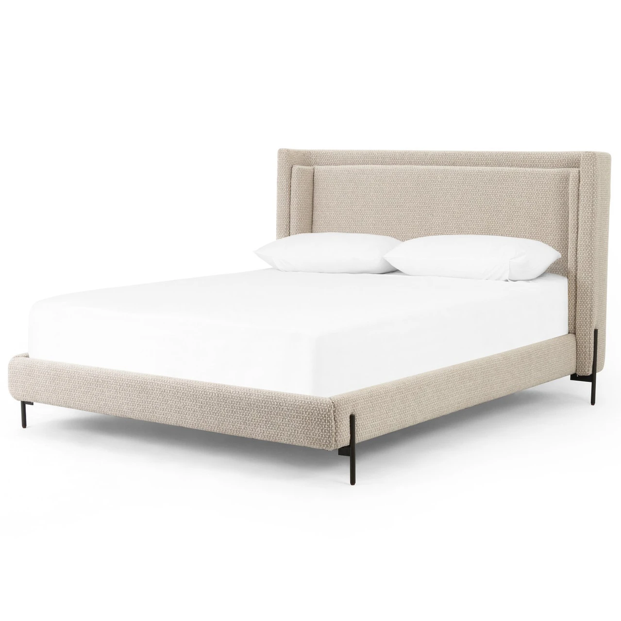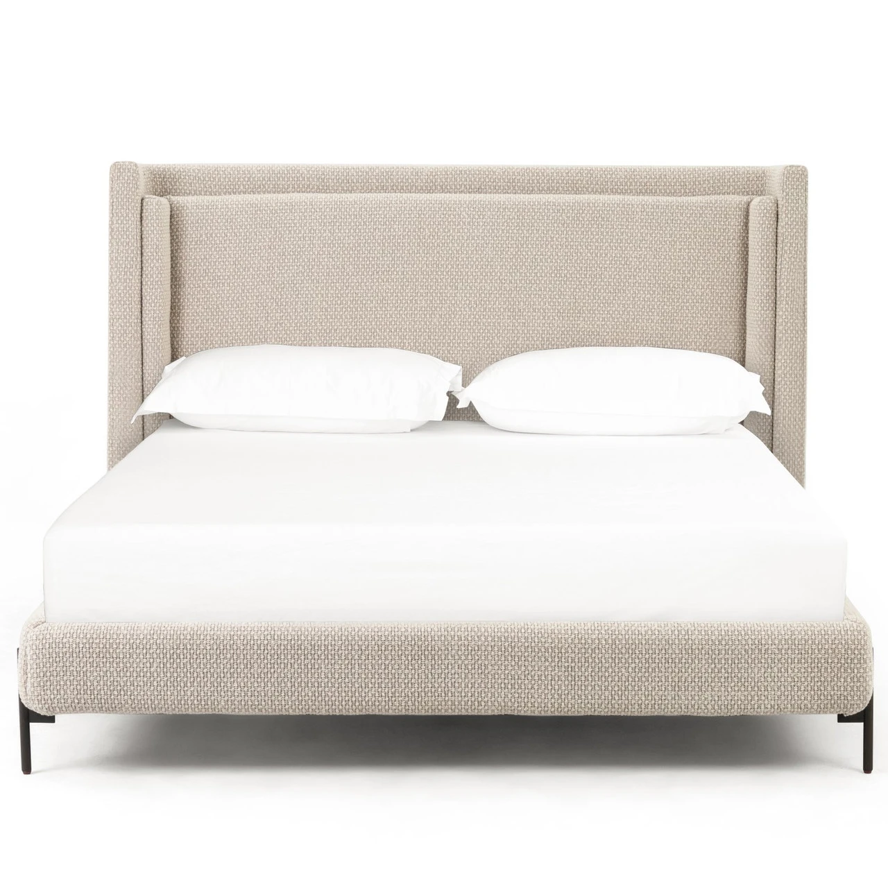 Talk about texture. Am upholstered shelter-style headboard is layered for a look of great depth, balanced out by cradle legs of gunmetal-finished iron. Performance fabrics are specially created to withstand spills, stains, high traffic and wear, ensuring long-term comfort and unmatched durability.