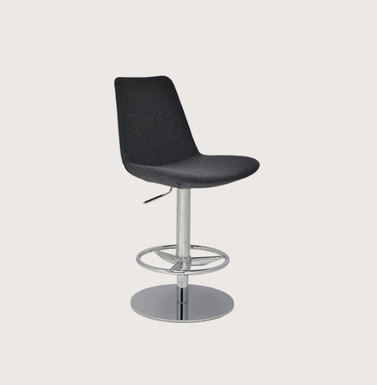 Eiffel Piston is a unique stool with a comfortable upholstered seat and backrest on an adjustable gas piston base which swivels and also adjusts easily from a counter height to a bar height with a lever that activates the gas piston mechanism. The solid steel round base is available in chrome or stainless steel. The seat has a steel structure with “S” shape springs for extra flexibility and strength. This steel frame molded by injecting polyurethane foam. Eiffel seat is upholstered with a removable velcro enclosed leather, PPM or wool fabric slip cover.