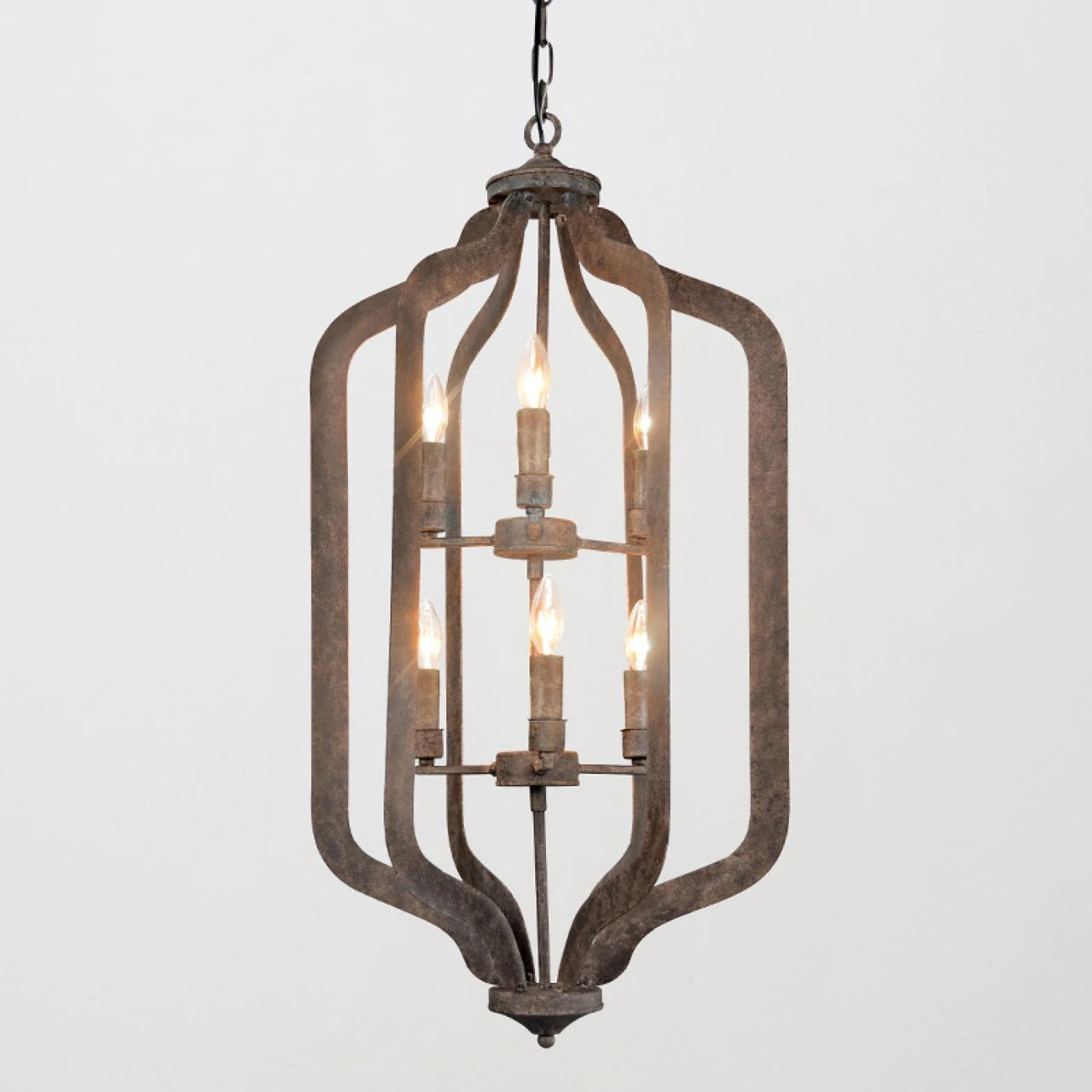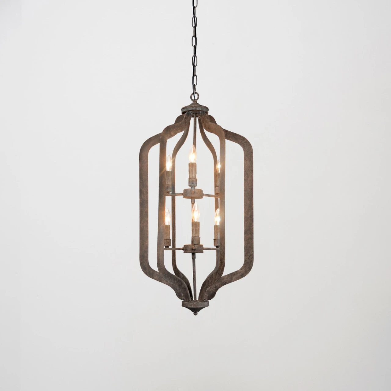 Stencil cut iron creates a candelabra-style chandelier holding six bulbs. With its worn finish and classic, elongated silhouette, this piece brightens any space with an antique look that transcends trends to be timelessly elegant. Bulbs not included.