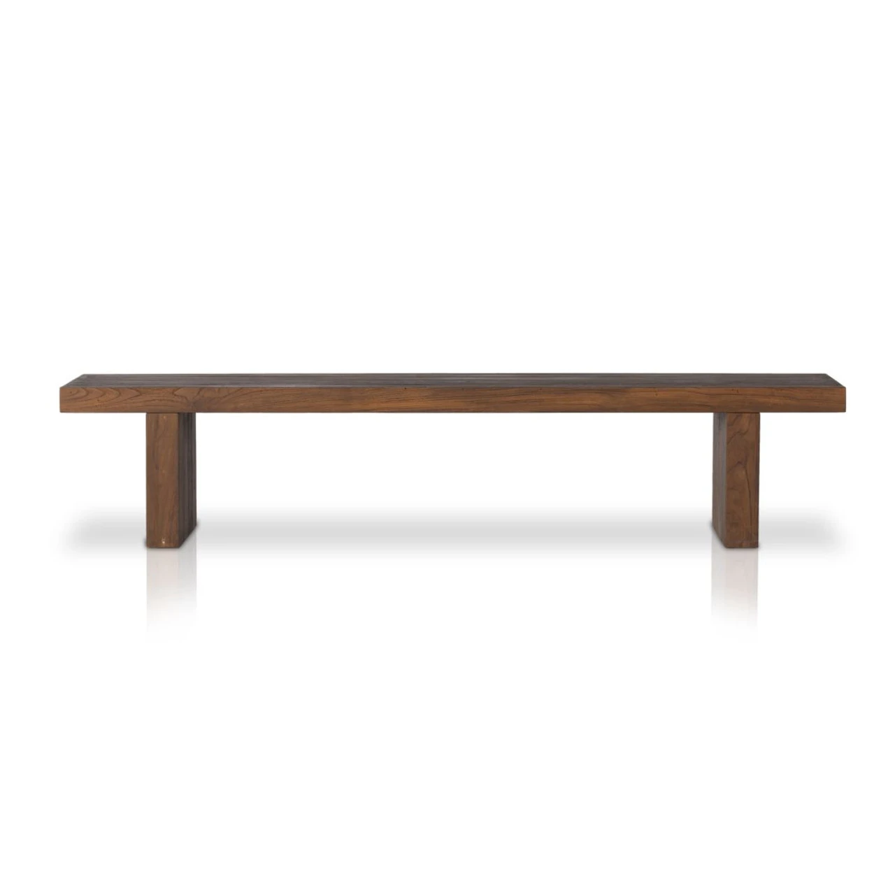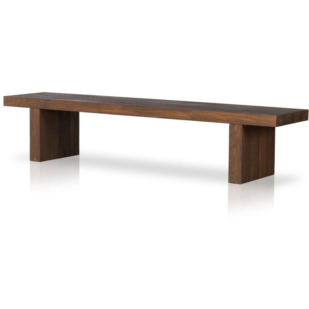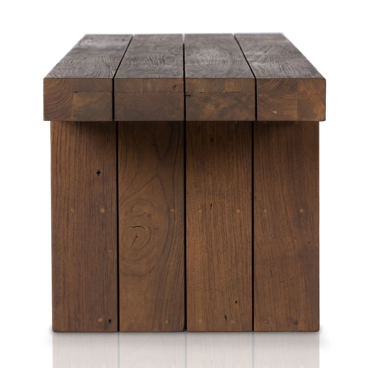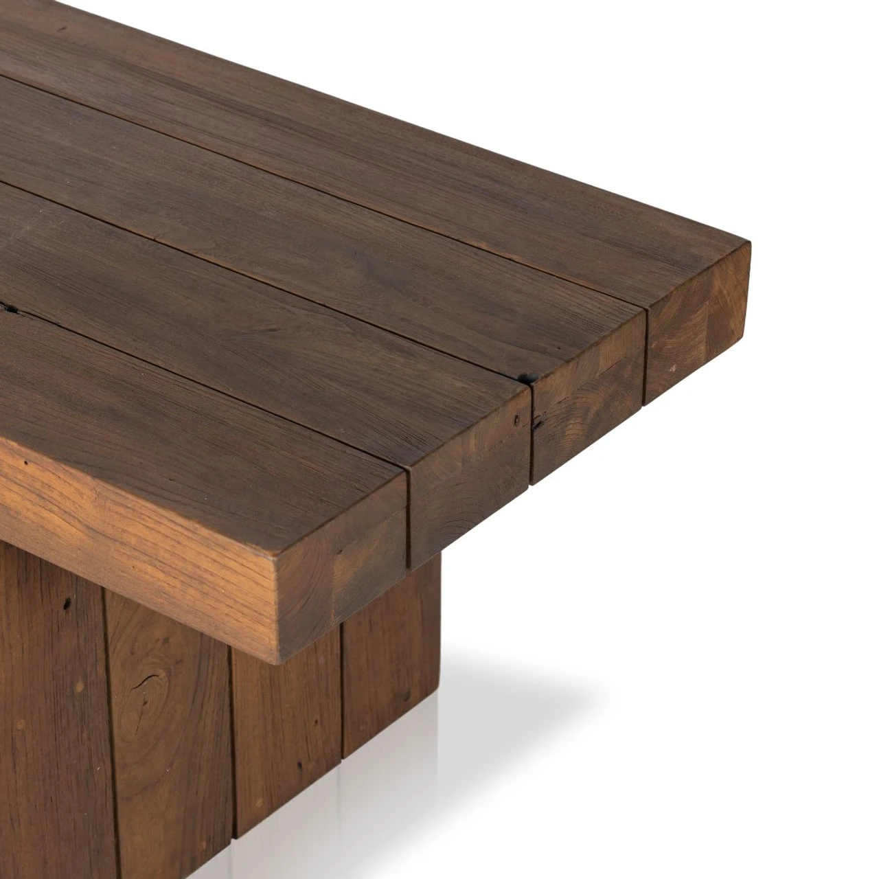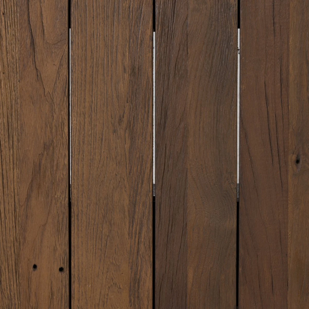 Thick, bold slabs of reclaimed wood and wide slats give this dining table its rich, organic character. A natural-toned heritage brown finish highlights the wood’s original knots and grains, making it a great addition to dining outdoors. Cover or store indoors during inclement weather and when not in use.