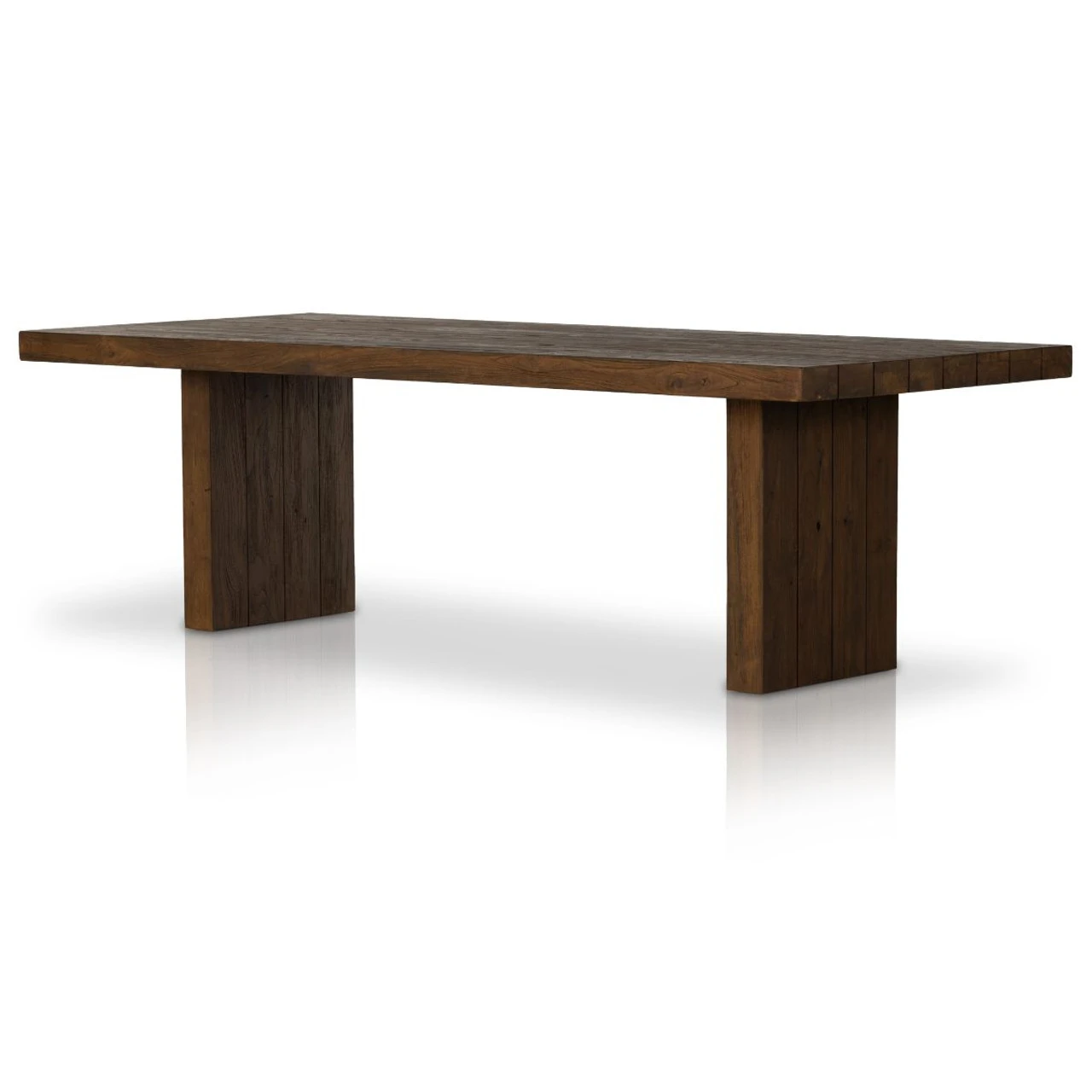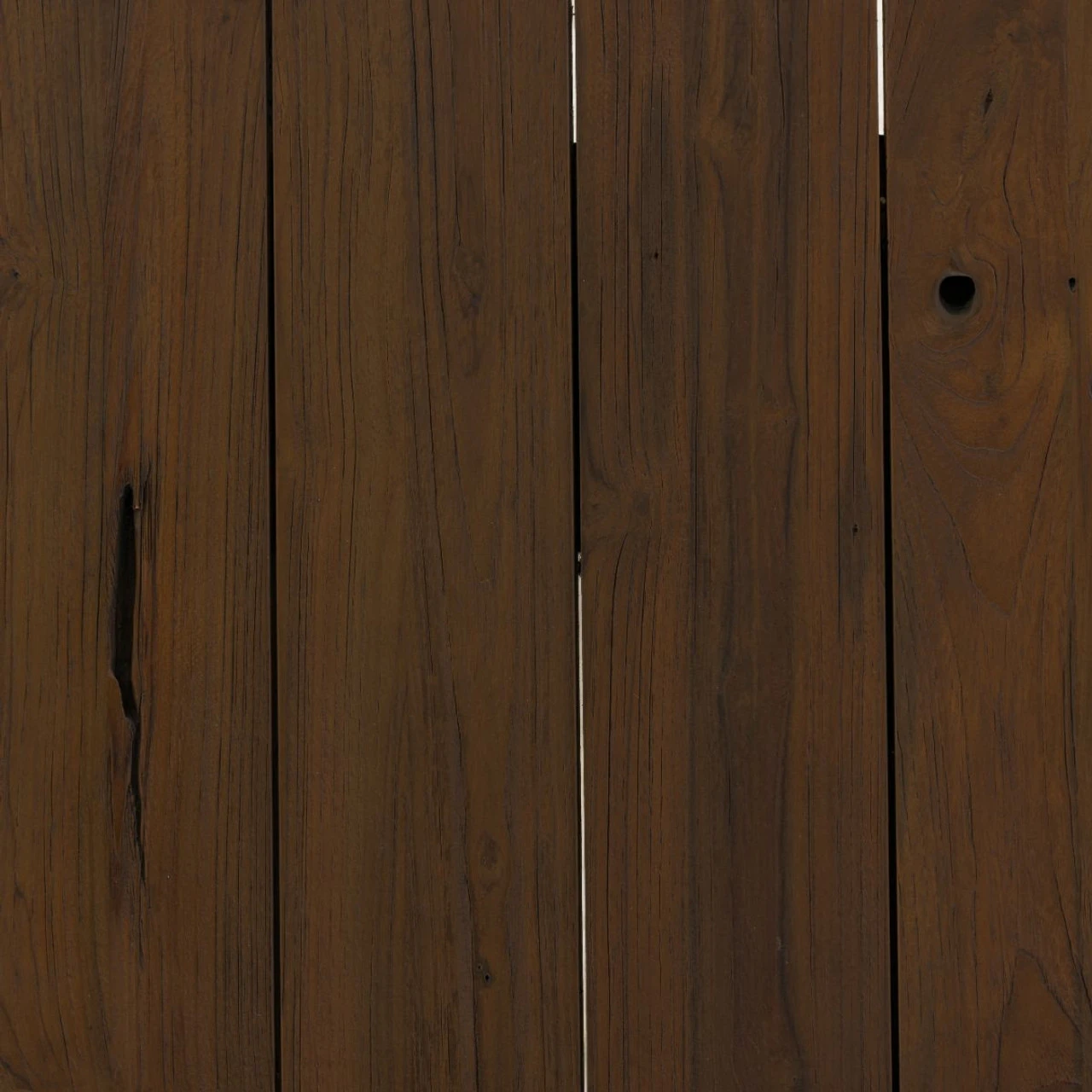 Thick, bold slabs of reclaimed wood and wide slats give this dining table its rich, organic character. A natural-toned heritage brown finish highlights the wood’s original knots and grains, making it a great addition to dining outdoors. Cover or store indoors during inclement weather and when not in use.