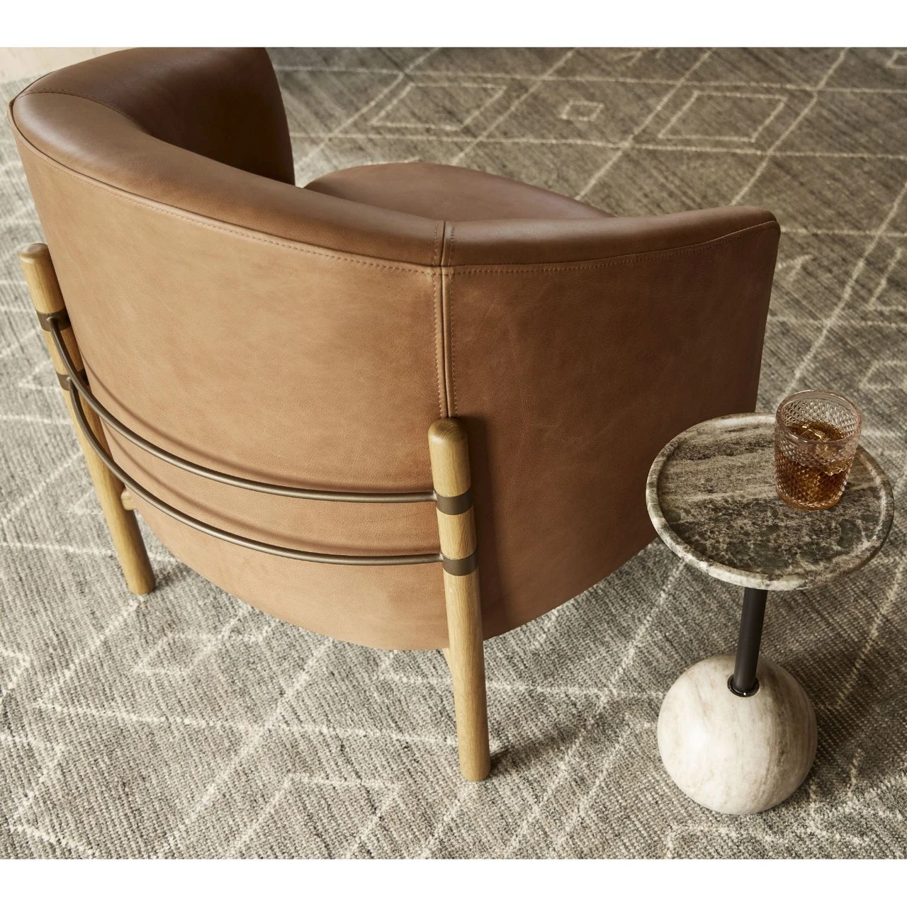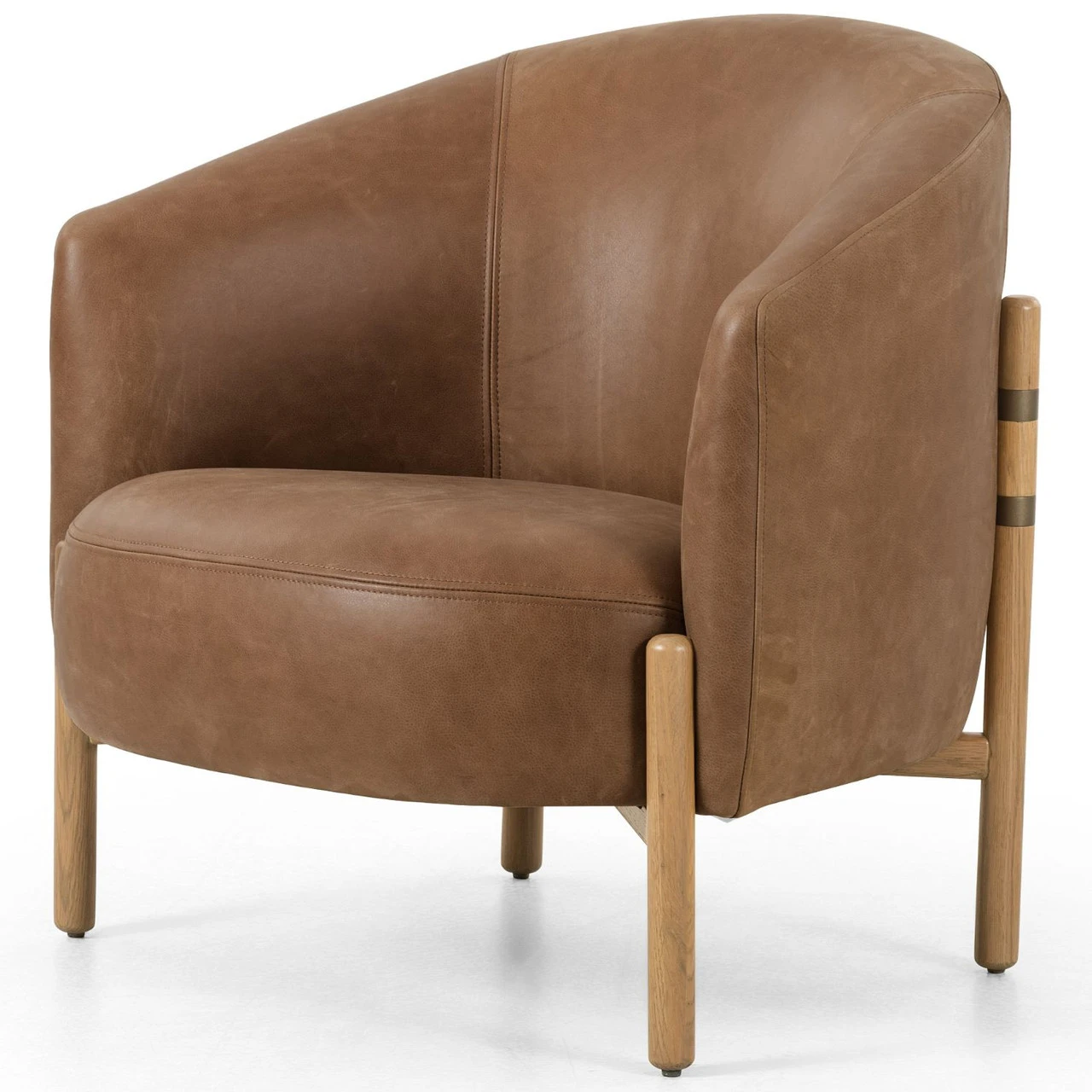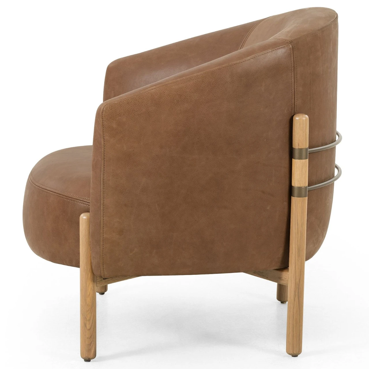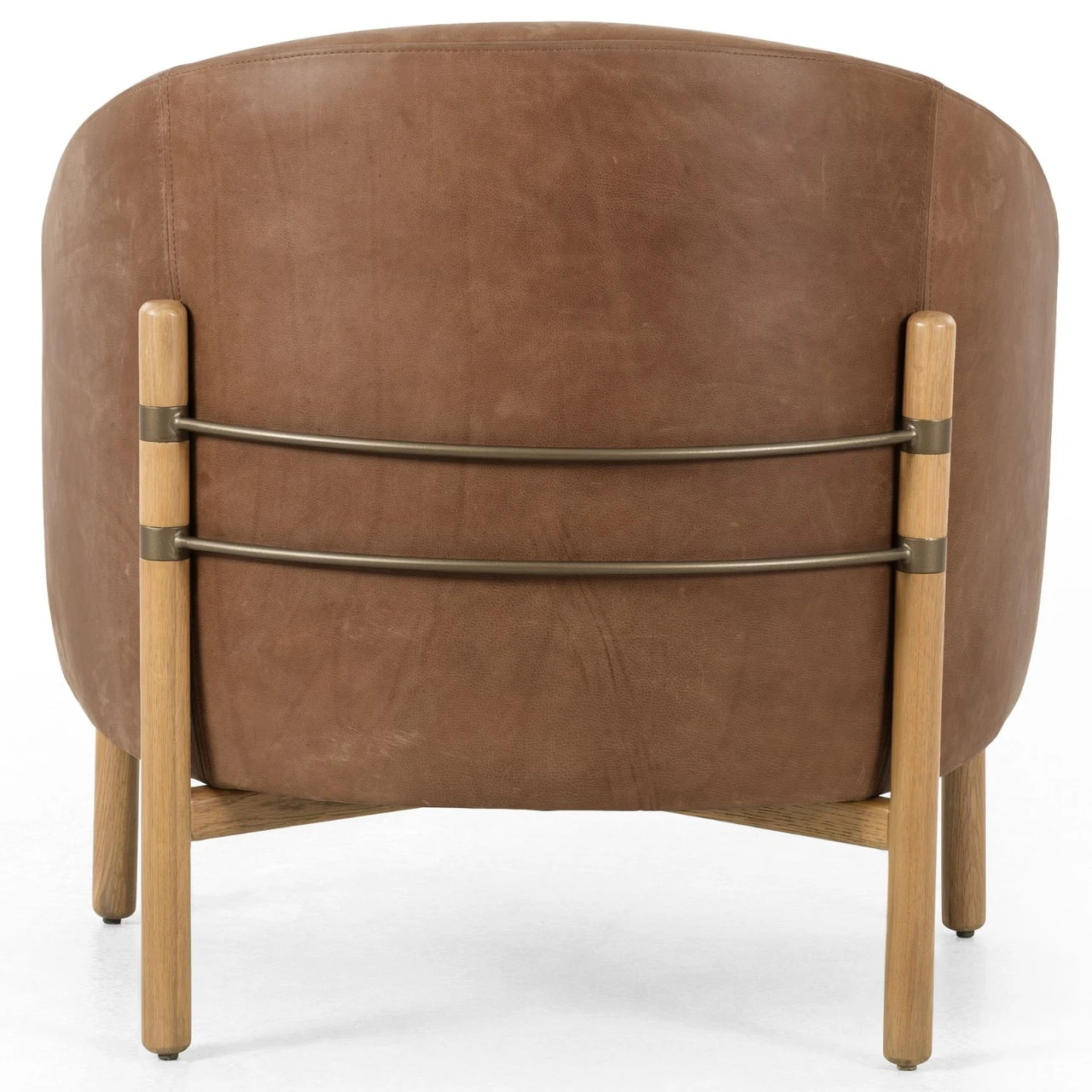 Sensibly charming. Upholstered in cognac top-grain leather, traditional barrel back seating with a subtle wing silhouette cradles into toasted oak framing, with rear iron stretchers adding a thoughtfully modern touch.