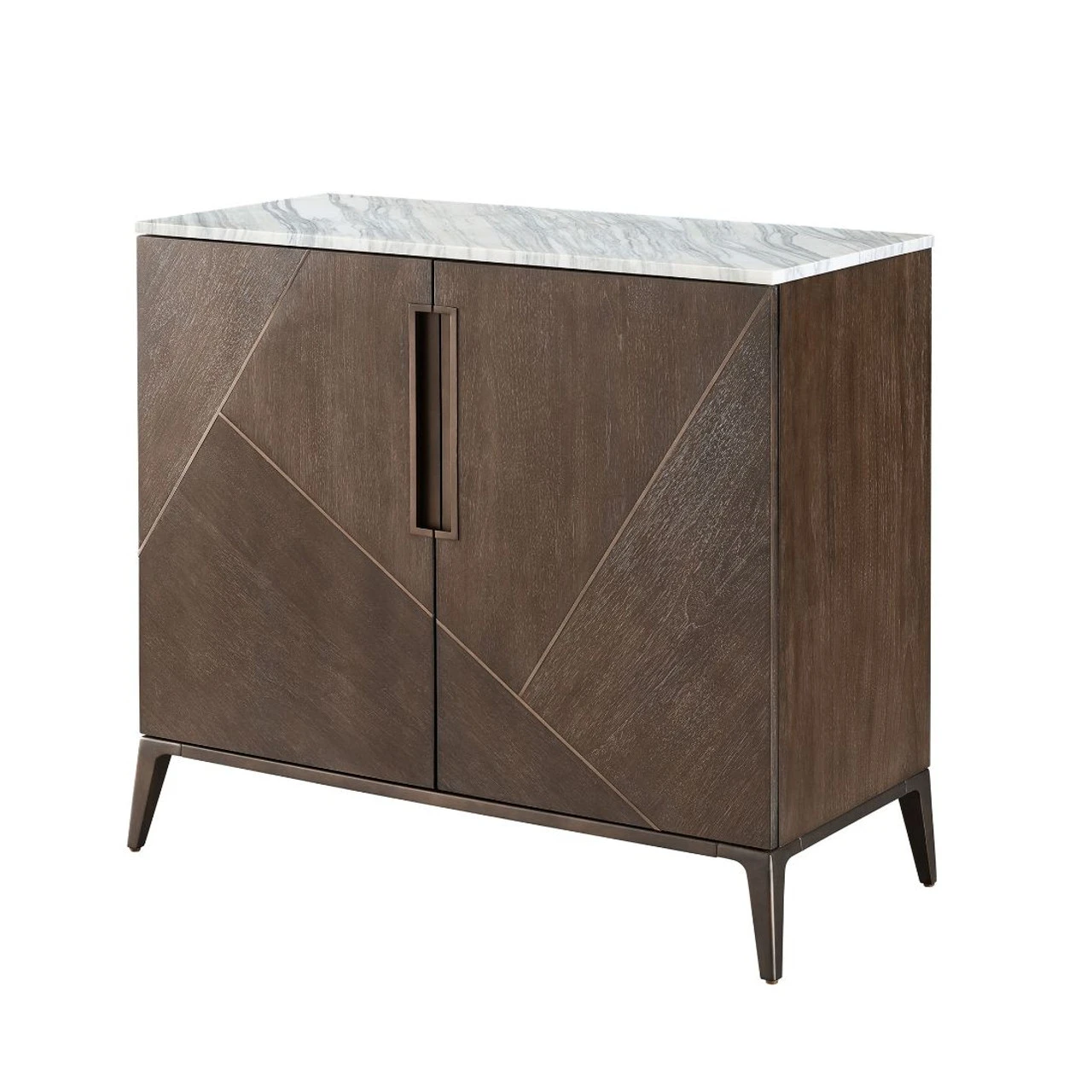 Taking inspiration from the delicate folds of origami art, fitted wood panels are arranged in an overlapping pattern accented with antique satin brass metal inaly and topped with a Calacatta marble top.