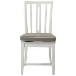 A lighthearted take on a classic seat design, the Escape Kitchen Chair features soft linear detailing, a gray upholstered cushion with a contrasting white welt, and a white frame.
