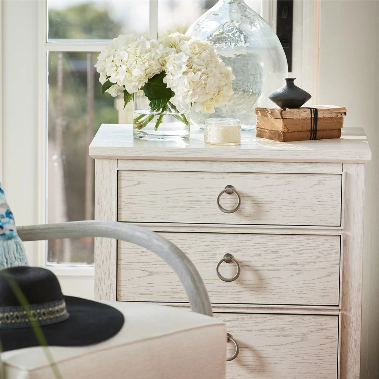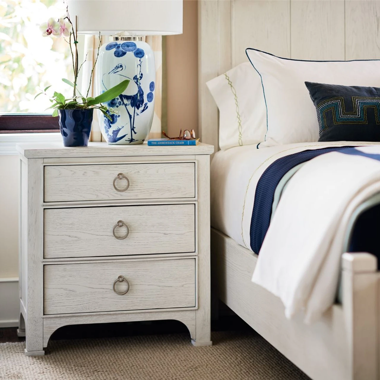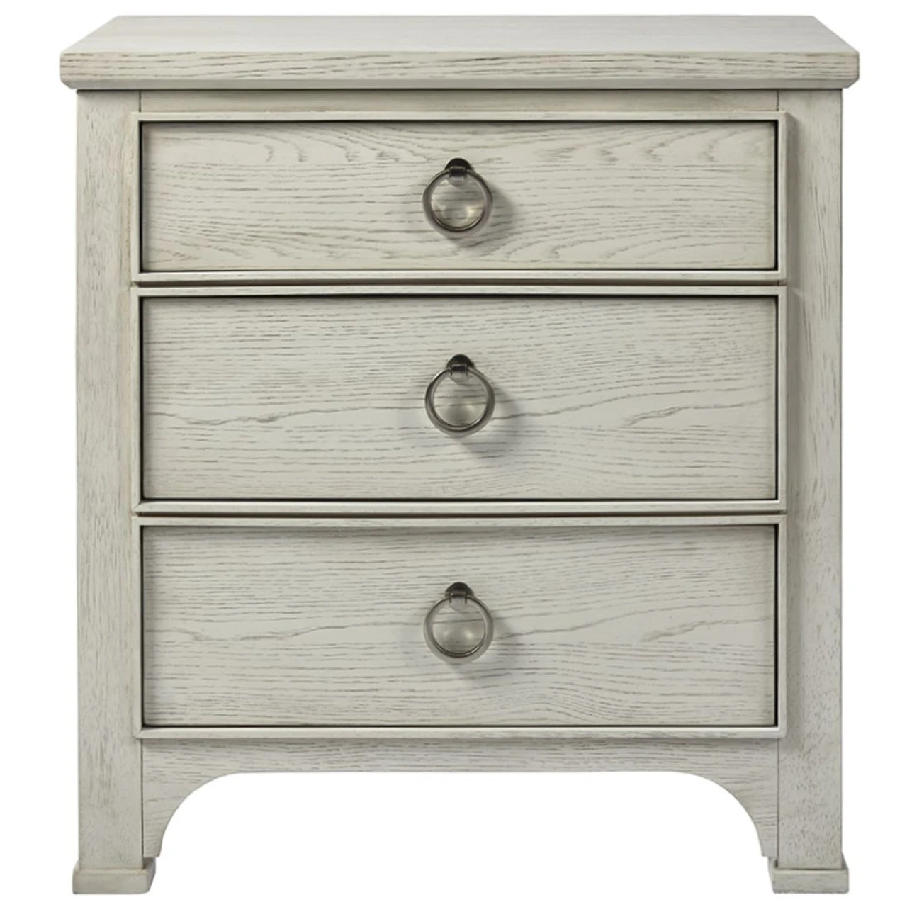 Add a soft touch to bedroom spaces with the Escape Nightstand, a clean bedside punctuation with simple lines, three drawers, and complementing ring-pull hardware.