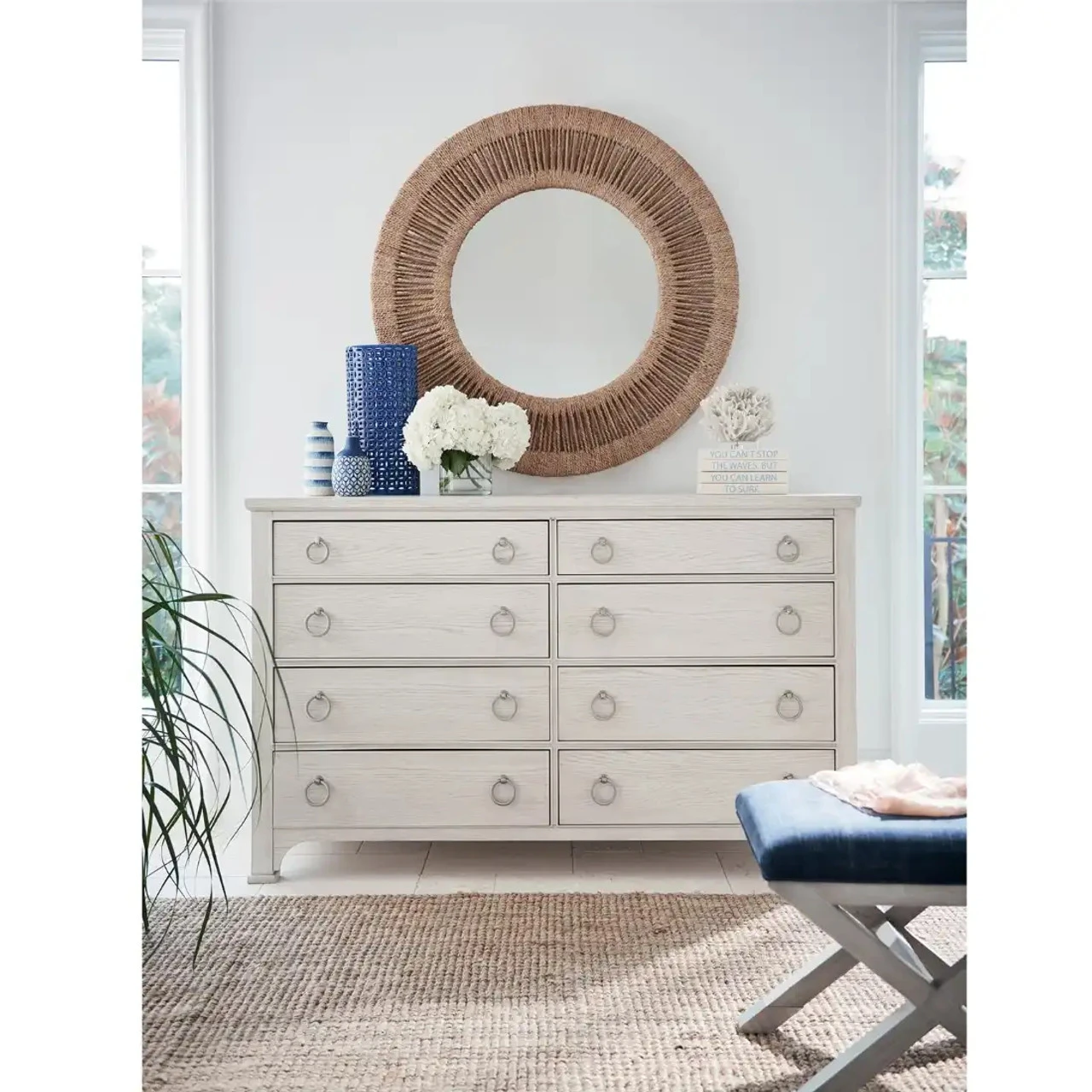 The Escape Drawer Dresser features eight spacious drawers accented with complementing pairs of silver ring pulls.